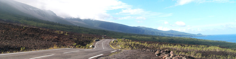 A gauche : La route du VolcanAu centre : La Plaine des Sables, le Chisny et le Piton de la Fournaise.