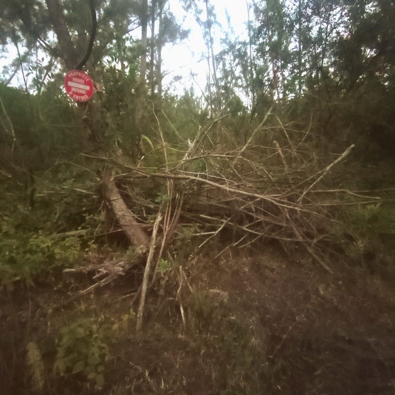 Retour forêt complètement et volontairement bloqué. En prenant dans l'autre sens, du Puits Arabe vers la forêt, un panneau officiel indique "Sentier Fermé". Photo 06 mars 2026