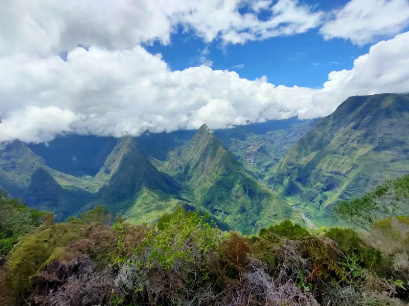 Belle rando avec un beau panorama sur le cirque de Mafate et la plaine des Affouches le long d'une crête.