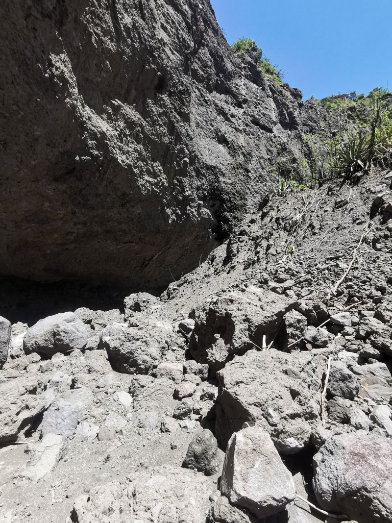 Il nous aura fallu 7h de sabrage sur 2 jours afin de parvenir à la fameuse touffe de bambous ! La monter commence au bananier en haut du chemin de la place, il faut les longer quelques mètres et partir sur la gauche, jusqu'au terrain vague recouvert de colle colle la trace est assez claire, c'est ensuite que ça se complique un peu, comme indiqué dans la fiche, on traverse une petite plaine de choka et de fougère avant de grimper sur une petite arrête, on avance et l'on parvient au premier choka que nous avons coupé, à partir de la rien de compliqué plus qu'à suivre les traces de nos coups de sabres, on parvient en 30 min a un premier manguier dans une ravine ou pousse du gingembre ! La sortie ce complique ici, il faut remonter 10 mètre droit vers l'énorme tas de brindilles sec, le traverser et partir vers la gauche, notre passage monte tout droit sans trop de détour, le sol est instable et glissant (attention aux chutes de pierre pour ceux qui marchent derrière !!) la moitié des arbres ne peuvent servir d'appuis à cause de leur fragilité. Certaines portions longeant le rempart ou même certaine barre rocheuse à franchir peuvent donner le vertige. En 1h15 (maintenant que le chemin est dégagé) on atteint un deuxième manguier, on continue de suivre la trace qui ici est nette le long du rempart, 5 min plus tard, vous êtes presque sur l'ilet, deux choix s'offre alors a vous : continuer vers la trace rando piton (ça monte encore et nous n'avons pas dégagé les 200 derniers mètres) ou suivre notre trace qui file à gauche vers la touffe de bambou ou l'ont peu observé différents arbres fruitier comme des pieds banane, goyavier ou même des Kambars, on trouve aussi autour des bambous des vestiges d'abris en pierre qui ont du servir à s' abriter il y a fort longtemps Une prochaine sortie prévoit de rejoindre la trace randopiton depuis la touffe de bambou. Ps la monter entre les 2 manguiers est compliqué et dangereuse, c'est une pente (comparable à celle du rempart de l'ilet des orangers ou du rempart rive gauche dans la rivière des marsouins) mais ici le sol est friable et instable de gros rocher ce dérobé sous nos pieds lord de la monter, la descente, elle, ressemble plus à une glissade contrôler. Quelques endroits peuvent donner le vertige. Nous n'avons pas vraiment suivi la trace randopiton (pas de GPS fiable en ma possession).