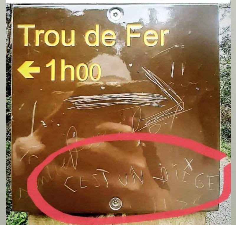 Information importante : le premier panneau qui indique trou de fer en 1h : passage très boueux et déconseillé si pas de chaussures inadaptées, enfants bas âges, temps pluvieux et pas cascadeurs. Très très glissant et boueux. Très peu indiqué que l'itinéraire est à déconseillé.