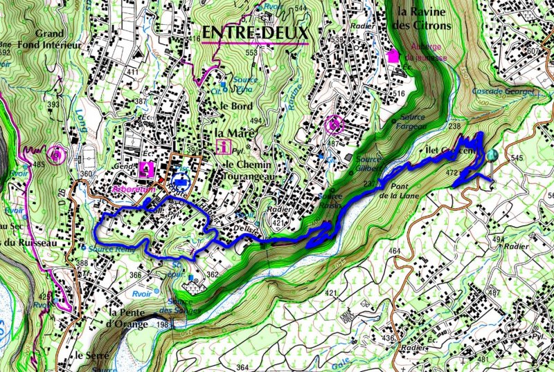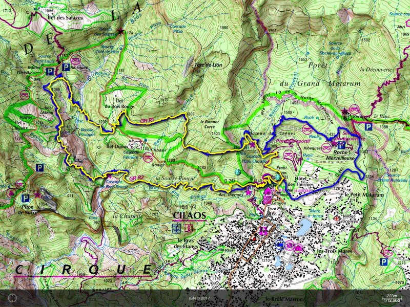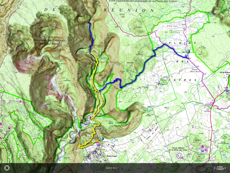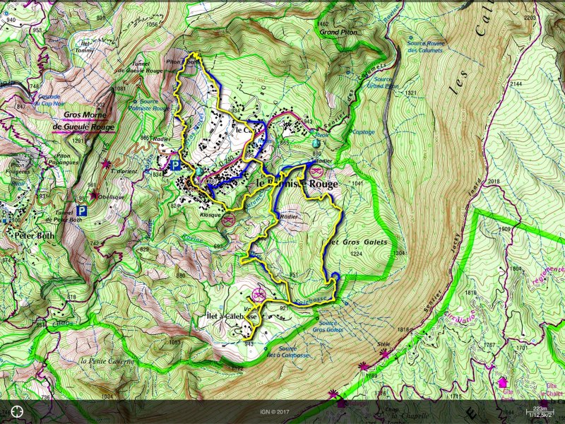 Je me suis garé devant les thermes et j’ai effectué cette sortie dans le sens des aiguilles d’une montre. Les précipitations des jours précédents n’avaient pas trop gonflé le Bras Rouge et le franchissement à l’aller près de la cascade du même nom ainsi qu’au retour un peu plus en amont se fit les pieds au sec. Comme indiqué sur l’image, la partie est de la boucle de RandoPitons (en bleu) n’a pas été réalisée. En arrivant à Bassin Bleu, quelques gouttes ont fait leur apparition et j’ai raccourci ma rando (en jaune) en redescendant directement sur Cilaos.