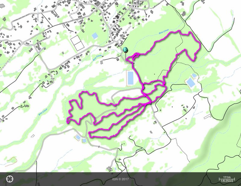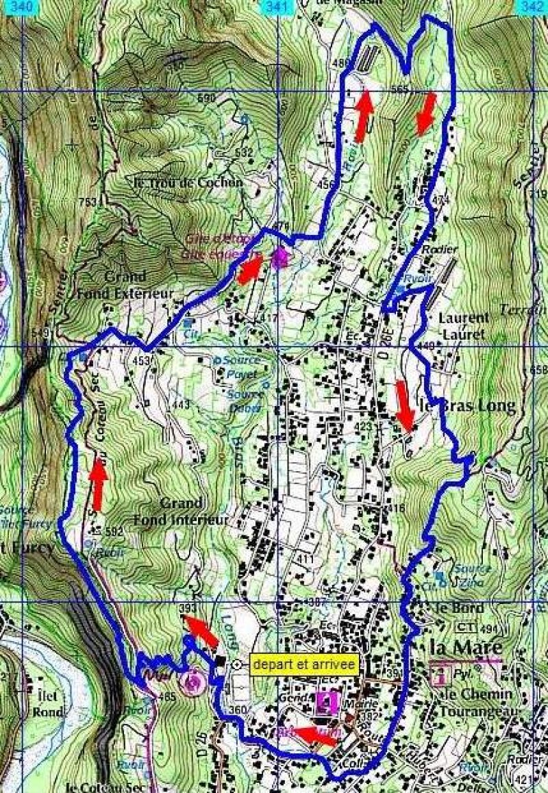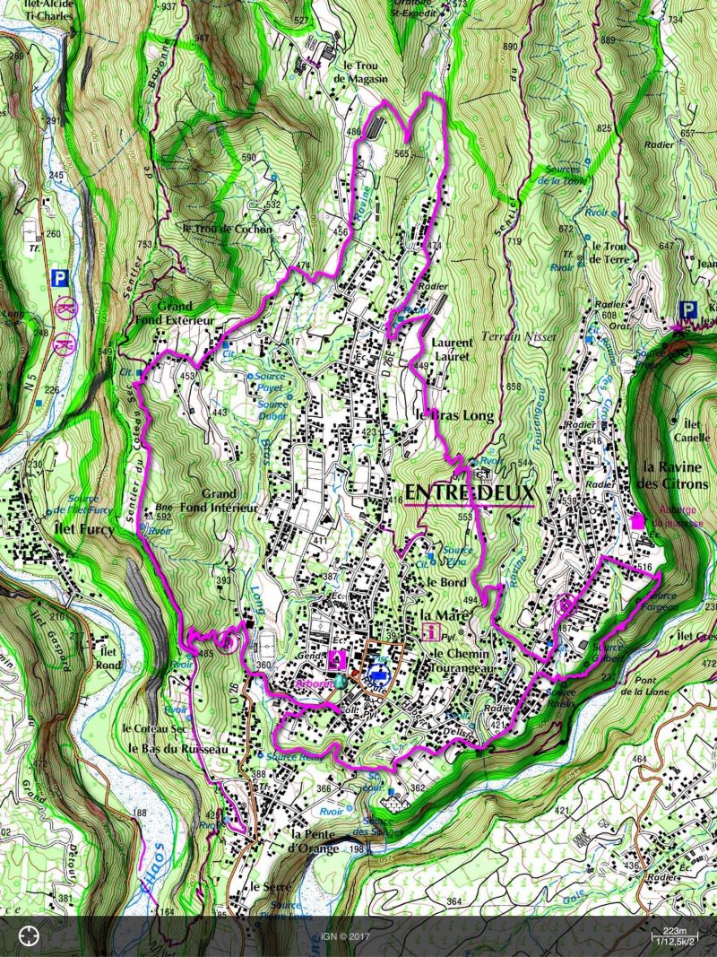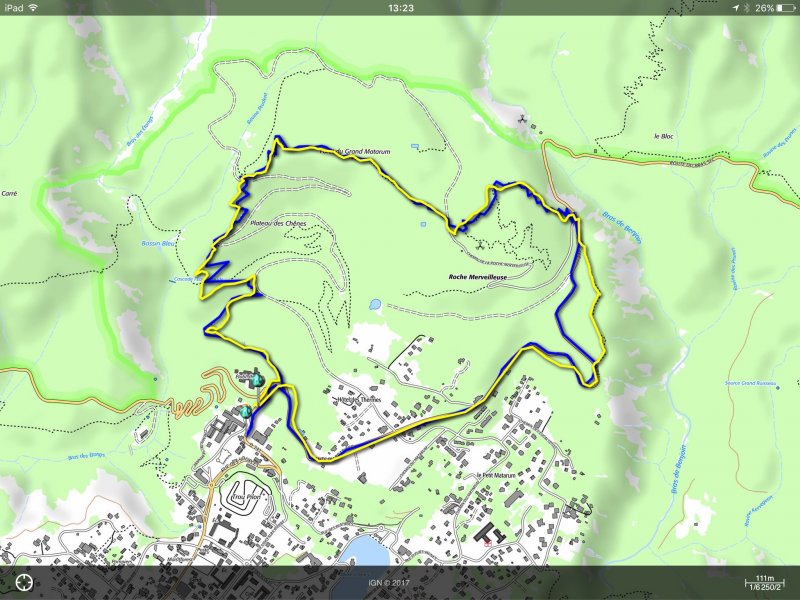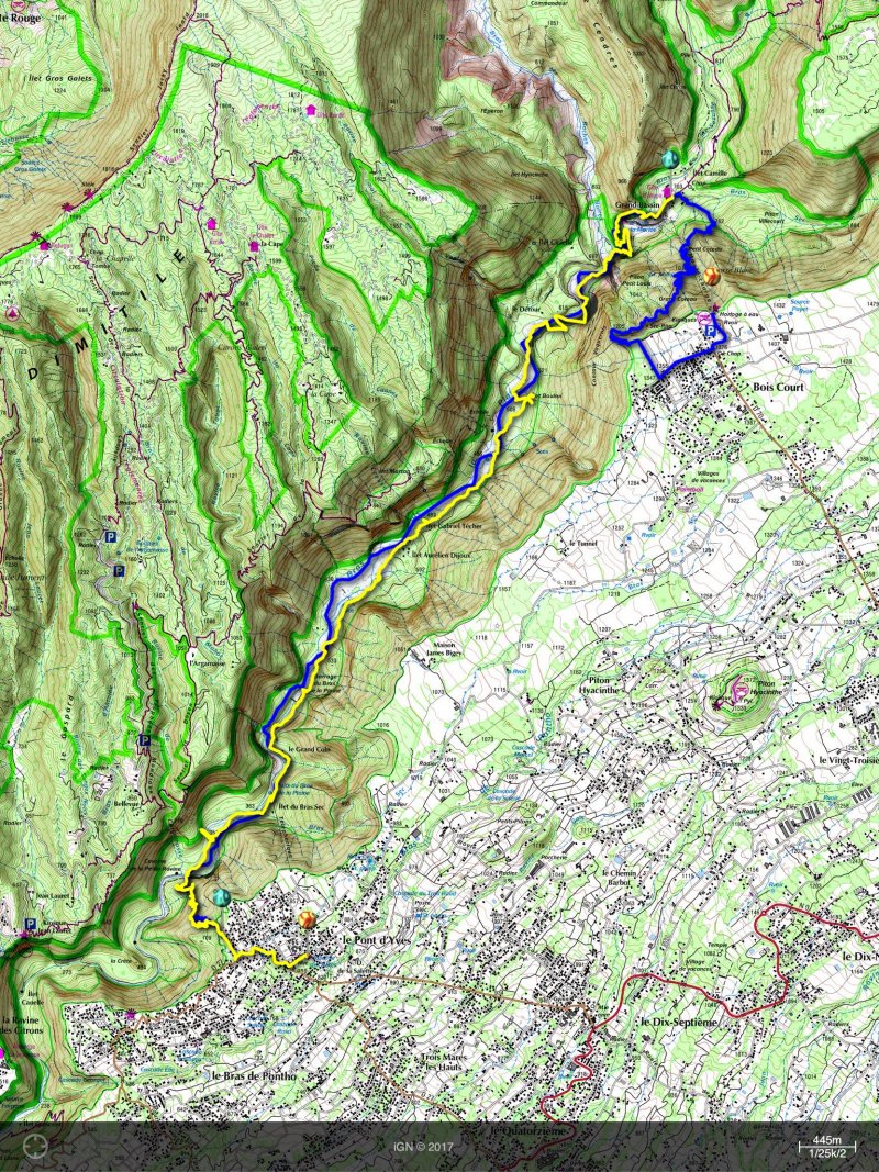 Je l’ai effectué au lever du soleil et dans le sens des aiguilles d’une montre. Je m’étais garé un peu en dessous de l’arrêt de bus « Les Thermes ». Mon parcours (en jaune sur la photo) est identique à celui de Randopitons (en bleu), à l’exception d’une petite bifurcation par un sentier que j’ai emprunté sur la gauche juste après avoir rejoint la Route du Bras Sec. Ce n’est pas vraiment un sentier, mais plutôt une piste, dont je me suis aperçu, en arrivant au bout, qu’une pancarte indiquait qu’elle était réservée aux VTT.