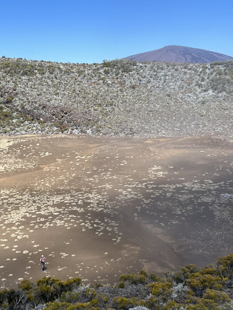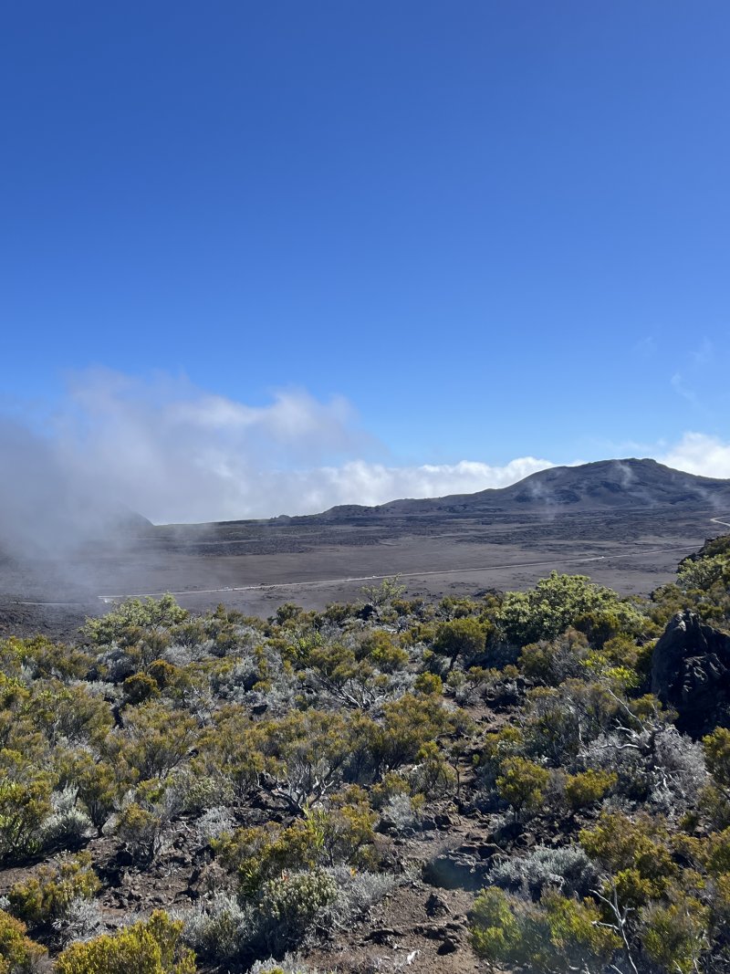 L’enchantement commence avec le Piton des Neiges semblant flotter sur un bol de chantilly de nuages… La première portion est douce, presque joyeuse, avec la musique des lapillis qui craquottent sous les semelles.