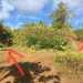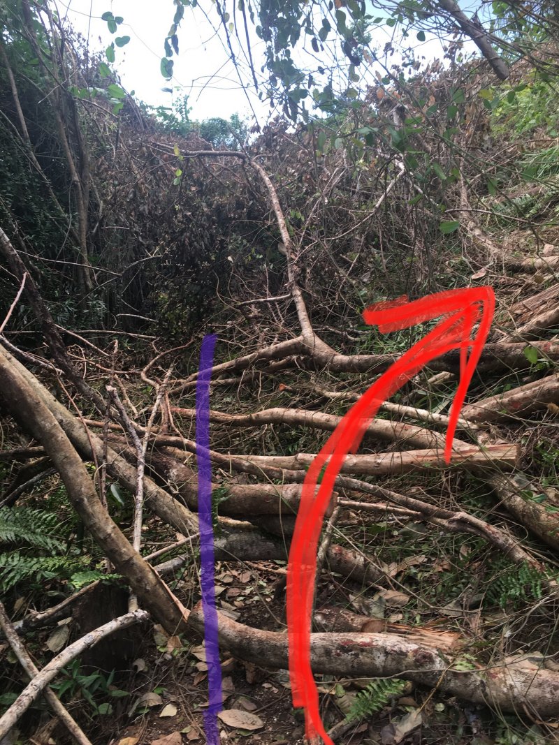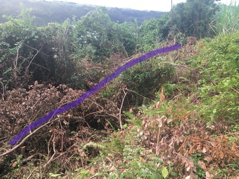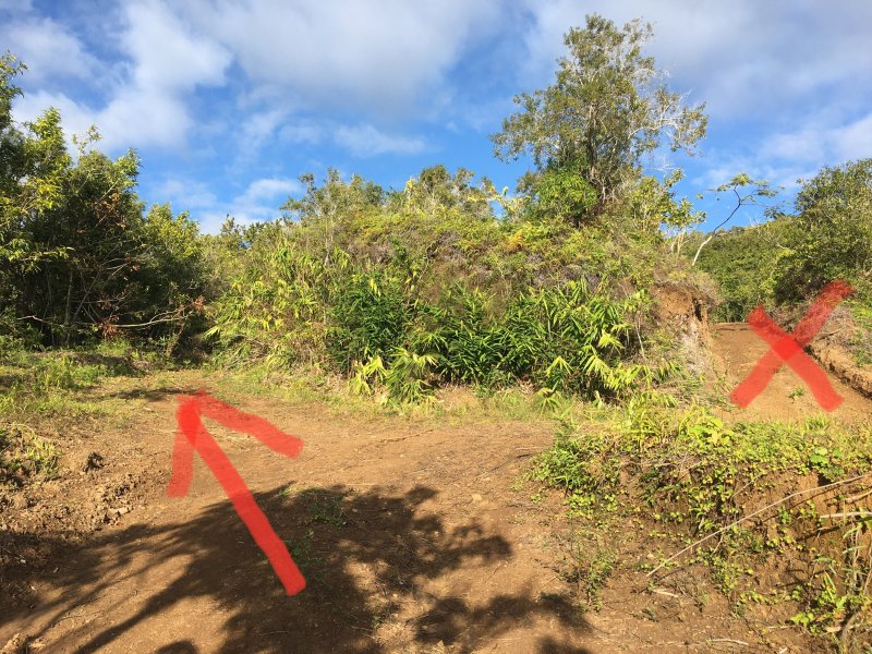 Ça passe de nouveau en haut, mais on n’est clairement plus dans de la randonnée familiale. Les branchages ont séché et se sont tassés, on y voit un peu plus clair. À un moment donné quand l’ancien sentier est complètement infranchissable, il faut suivre les traces du contournement qui s’est créé au dessus et longer le bord du champ de canne jusqu’à la route. Sur les photos, ancien sentier obstrué surligné en bleu.
