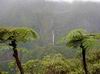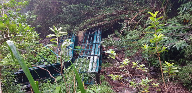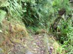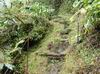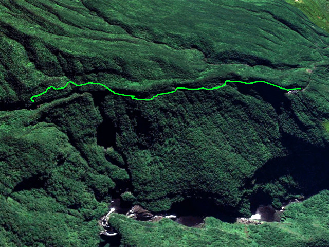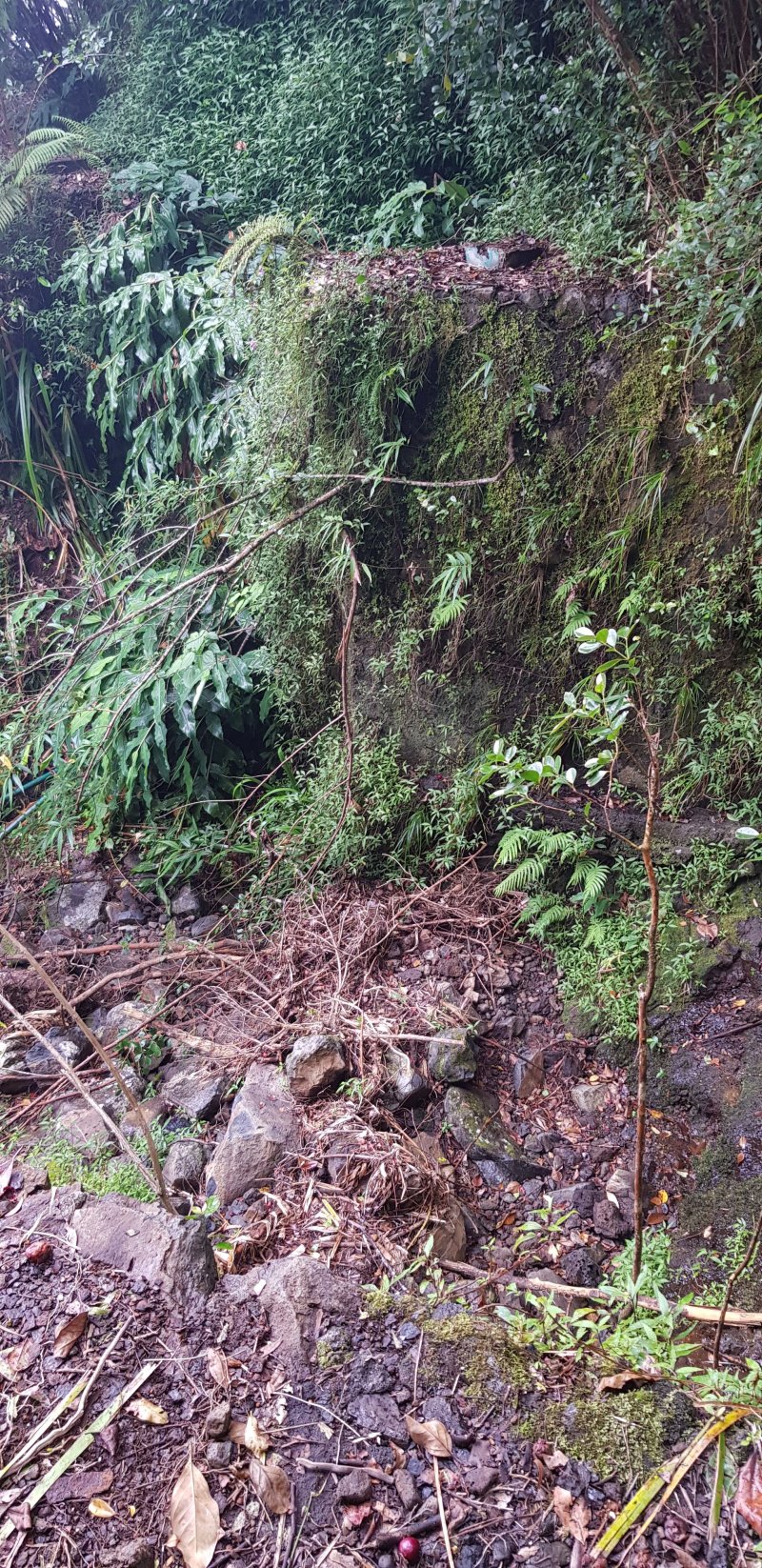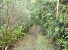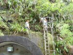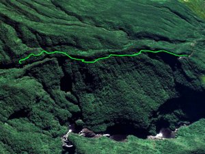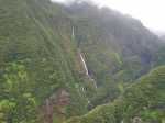 Le sentier débute près de l'usine hydroélectrique après avoir longuement roulé sur la petite route verdoyante et profité de belles vues sauvages sur la vallée de la Rivière des Marsouins. Quelques haltes sont possibles pour profiter des paysages ou se rapprocher par exemple de la Grande Ravines (Photo 1). Au début du sentier, ne pas manquer un des plus beaux panoramas de l'île sur les vallées encaissées de la Rivière des Marsouins et du Bras Cabot (Photo 3). On aperçoit déjà plusieurs bassins et cascades dans toutes les pentes. Emprunte le début du sentier fréquenté menant à la Forêt de Bébour. Il descend à peine en longeant une courbe de niveau sur 250 mètres. Au moment où ce sentier va descendre en lacets serrés vers la Rivière des Marsouins, une bifurcation sur la droite marque le début du trajet vers le Bras Patience. Le sol est plat et sans danger. Le sentier est bordé de quelques bois de couleurs, de goyaviers, de sabres et bien sûr de vigne marronne (Photo 4). On franchit une petite passerelle constituée de plaques trouées servant habituellement à créer des pistes de roulement (Photo 5). Le passage est court au-dessus de la ravine et on rencontre plus loin un bâtiment en ruine qui servait certainement d'abri aux ouvriers lors des travaux de construction de la centrale (photo 7). Les vues sont imprenables sur les cascades Arc-en-ciel dans les trouées de la végétation (Photo 6). Plus oin, ce seront celles du Bras Magasin, chères au canyonistes, qu'on admirera sur la gauche (Photo 8). On continue en longeant la falaise avant de grimper, parfois de manière abrupte, dans la forêt de bois de couleurs. Des câbles sont très utiles de part et d'autre car le terrain est souvent glissant sur les pierres moussues (Photo 10). On bénéficie dans les trouées de nouveaux spectacles sur les cascades qui coulent des remparts (Photo 11). Le parcours effectue quelques petites courtes montées suivies de descentes du même style. Des câbles sécurisent même si la végétation est assez dense (Photo 13). Ces courtes montées prennent fin dans une végétation dense et très humide. On aperçoit le Bras Patience et le barrage à travers les branches de goyaviers ou de bois de chapelet (Photo 14). Profiter du spectacle de la vallée, de la forêt de bois de couleurs ponctuée de fougère arborescentes avant d'entamer la jonction avec le barrage (Photo 15). Une courte descente amène à un premier escalier métallique qui se termine sur un bloc bétonné destiné à abriter des installations techniques (Photo 17). Puis c'est une échelle verticale protégée par un garde-fou qui aidera à s'approcher au plus près d'autres échelles ou passages métalliques puis du petit barrage (photo 19). Attention de bien tenir les barreaux, souvent usés et glissants s'ils sont mouillés (Photo 20). Le sentier s'arrête sur le haut de l'ouvrage et il paraît difficile, voire impossible de continuer plus loin. L'endroit est moussu, verdoyant, déchiqueté par des milliers de crues et sauvage. L'humidité du lieu, le manque d'ensoleillement, l'eau parfois trouble au fond de cette gorge étroite sont autant d'arguments qui donnent peu l'envie de se baigner dans l'eau du barrage (Photo 21). Une pancarte de l'EDF attire d'ailleurs l'attention sur les risques de montée brutale des eaux. Il est très fortement déconseillé de braver ces conseils. Ne pas manquer, vers l'aval, l'impressionnant bassin encaissé entre deux falaises verticales qui décourage encore plus de poursuivre (Photo 22). Comme le sentier s'arrête là, la seule solution consiste à reprendre le chemin en sens inverse. Au premier croisement, si le chrono le permet, tenter une descente au barrage entraperçu dans la montée pour voir d'autres paysages tout aussi sauvages sur la Rivière des Marsouins.