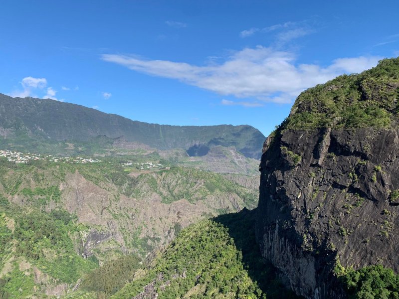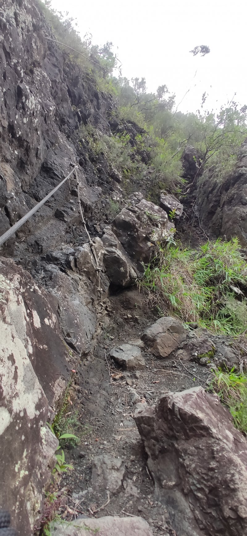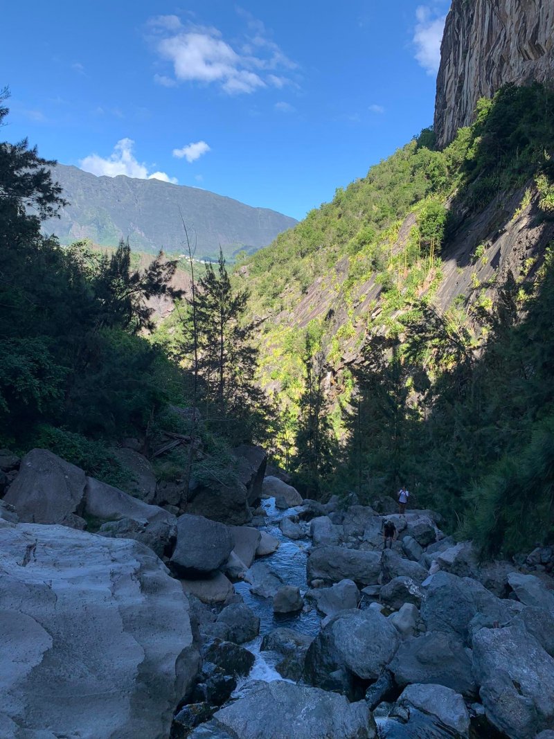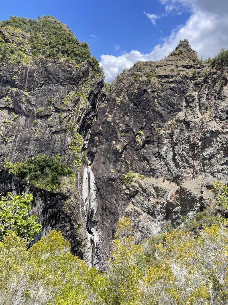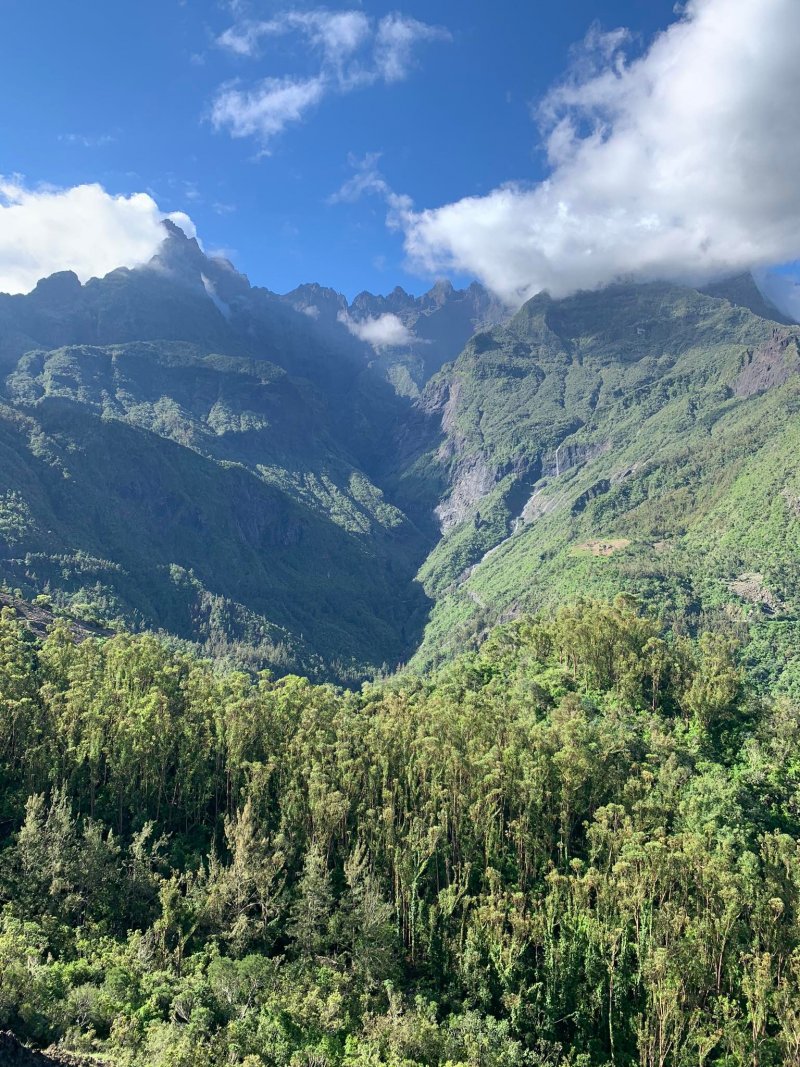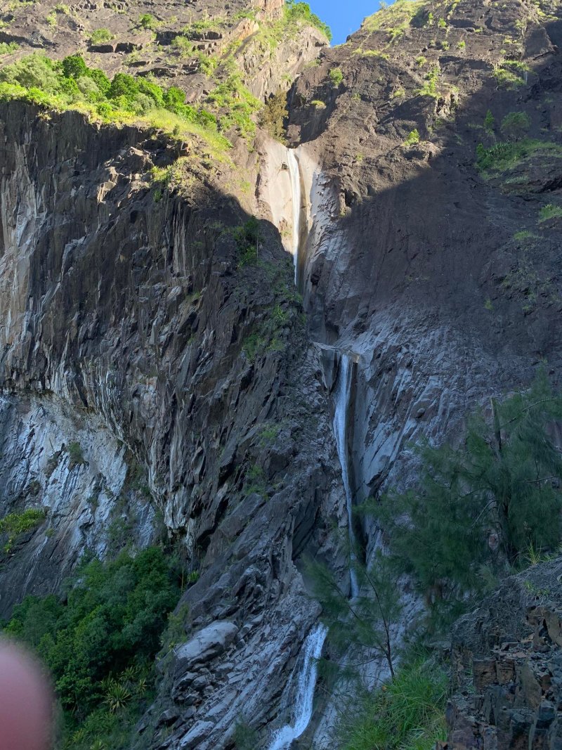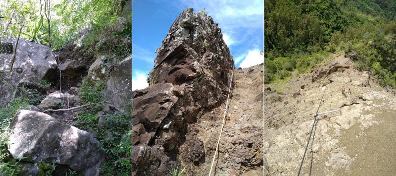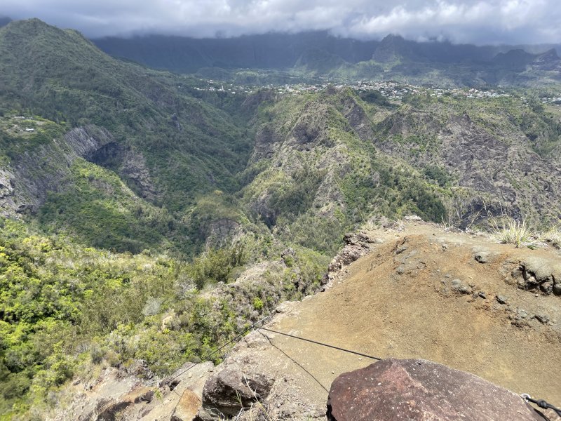 En remontant la Ravine de Fleur jaune, on ne voyait pas le chemin car Batsirai est passé par là, mais on a continué et on a trouvé des cordes sur le chemin ce qui nous rassurait. Les points de vue sont sublimes !