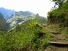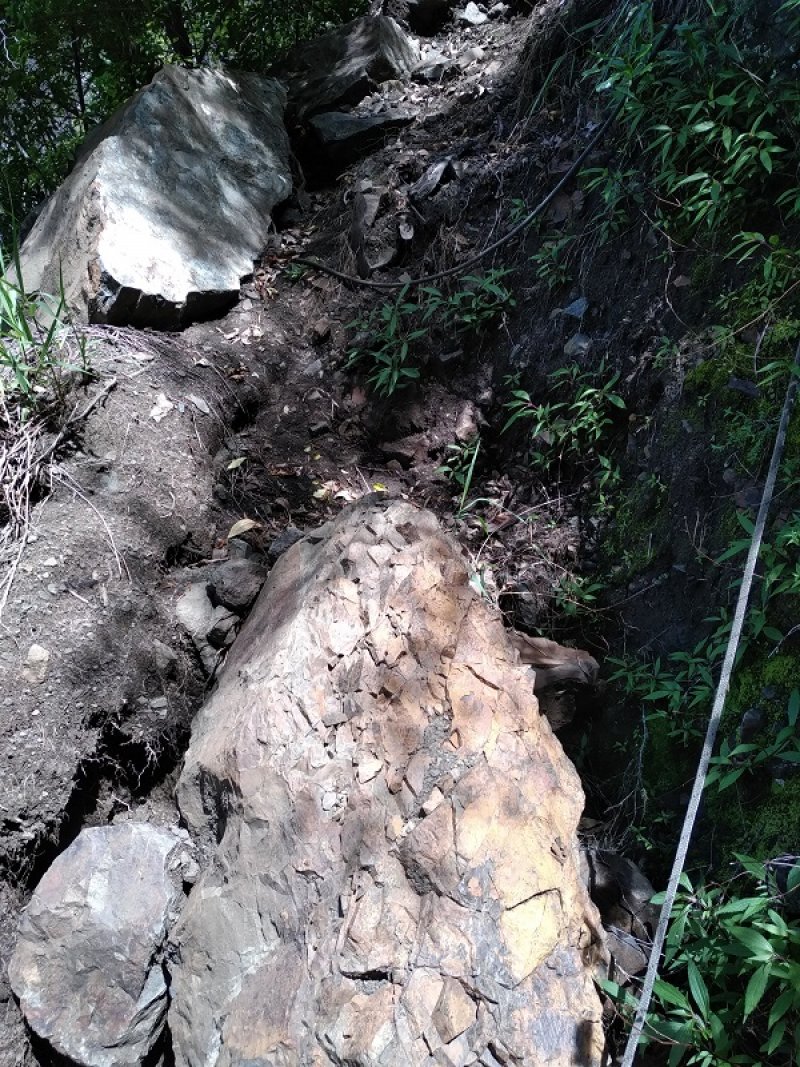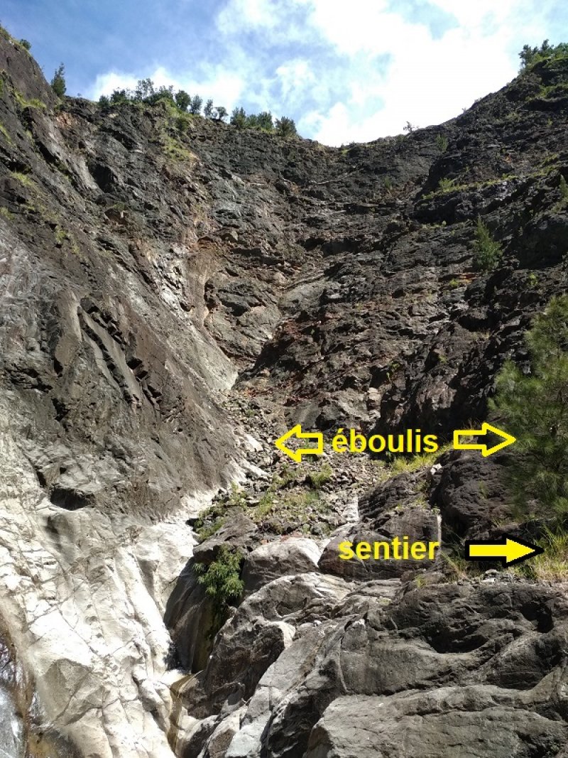 La remontée se fait sur un sentier bien marqué qui commence juste avant les 2 éboulis (photo 2). Le sentier est sécurisé mais on y trouve parfois des pierres en plein milieu (photo 3) et un passage est particulièrement "délicat". Descendre un tel sentier qui part en miettes est pour le moins risqué voire suicidaire.