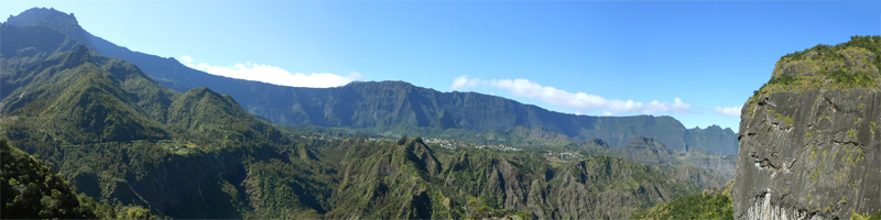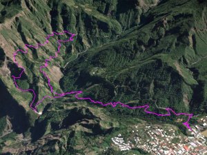 La randonnée débute en ville où un grand parking permet de toujours trouver de la place. La descente par le sentier des Porteurs est facile et rapide, que l'on emploie les longs lacets ou leurs raccourcis (Photo 1). Après une courte portion de route pour rejoindre le départ du sentier du Bras Rouge on atteint la cascade en une demi-heure sur un sentier facile et agréable comportant toutes sortes de revêtements classiques des cirques (Photo 2). Le départ vers le Bassin Roche et la Ravine des Fleurs Jaunes se trouve rapidement après le gué. Après l'avoir franchi et longé les précipices dominant la cascade, le sentier effectue quelques lacets passant devant un gros rocher sur la gauche. Au dernier lacet, le sentier devient plat et on aperçoit un muret de pierres sèches sur la gauche. Enjamber ce muret et partir dans les chocas (Photo 3). Voir ce circuit pour ne pas s'égarer sur la courte distance. Le sentier est étroit mais impossible à perdre de vue (Photo 5). On arrive en moins de 30 minutes à l'énorme rocher qui marque le début des toboggans de la Ravine Fleurs Jaunes (Photo 7 G). Profiter de ce magnifique endroit en prenant garde de ne pas trop s'approcher du bord de la falaise car elle peut être glissante et la chute fait plus de 100 mètres. Il est possible de rester ici des heures sans s'ennuyer une minute. Hélas il reste encore un peu de chemin à effectuer. Poursuivre vers le nord en longeant la rivière. Les emplacements plats sont rarissimes et il faut sans cesse passer de roche en roche pour éviter de se mouiller les pieds. On rencontre une petite cascade et son bassin tous les 20 mètres et il est très agréable de marcher avec la musique de l'eau venant de toutes parts (Photo 10). A aucun moment d'ailleurs on ne peut se mouiller si on fait bien attention où poser les pieds. La montée n'est jamais forte mais les rochers sont toujours aussi hauts. Il faut escalader, grimper, sauter, chercher le meilleur passage (Photo 12). Lorsque ce n'est pas possible il y a toujours un petit sentier sur la droite et les quelques cordes s'avèrent très utiles (Photo 13). Il faut presque une heure pour atteindre le pied de la grande cascade où l'on entend les cris des canyonistes qui semblent beaucoup s'amuser (Photo 16). On peut s'approcher du dernier bassin ou grimper sur les flancs de la falaise en fin de cirque pour monter voir de plus près le bassin supérieur dominé par les deux longues chutes. Repérer sur la paroi verticale du Pain de Sucre, tout proche, les cordes fixées qui permettent aux alpinistes chevronnés de connaître le grand frisson (Photo 15 et 17). La route de l'Îlet à Cordes n'est que 200 mètres plus haut mais l'atteindre se mérite. La pente est impressionnante mais les difficultés rares puisque tout le trajet ou presque est sécurisé par de très longues cordes bien fixées à la muraille (Photo 18 à 22). L'exercice, difficile en tenue néoprène et lourd sac à dos, est plus aisé pour le randonneur moins chargé. Il suffit juste de ne jamais lâcher la sécurité en cas de terrain vertical, glissant, instable ou abrupt. Le seul obstacle peut être le vertige à deux ou trois endroits particulièrement dénudés en bord de précipice (Photo 23). Inutile de décrire les panoramas sur le Cirque de Cilaos qui partent du Gros Morne à gauche pour se terminer à droite par le Pain de Sucre. On atteint la route, fin des difficultés. Après un dernier regard aux canyonistes en train de descendre la falaise verticale, prendre la direction de Cilaos et marcher sans effort jusqu'à l'escalier du départ vers le Col du Taïbit. Les paysages exceptionnels sur le Cirque, le Gros Morne ou les cascades tombant des alentours de la Tête de Lion font oublier le macadam (Photo 24). La descente est d'abord forte sous les filaos avec hautes marches en pierre ou en bois pourrissant. Puis elle s'adoucit avant de bifurquer sur la droite vers la cascade du Bras Rouge. Nouvelle halte à la traversée du Bras Gobert pour profiter de belles cascades en amont ou en aval du sentier. Après une portion agréable sur les aiguilles de filaos (Photo 26), le sentier devient plus étroit et traverse des zones totalement dénudées et glissantes (Photo 27). Puis il se met à descendre en courts lacets avec de très belles vues sur le Bras Rouge ou la Cascade Fouquet. L'herbe est de plus en plus présente dans la forte descente qui ramène au point de départ de la boucle près du muret avant le gué. Repasser la cascade et remonter vers le sentier des Porteurs puis vers le parking prend une heure sur le sentier utilisé en début de parcours.