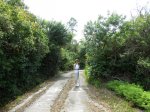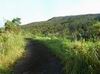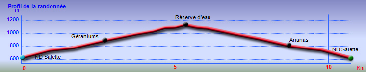 La randonnée débute à la Chapelle de Notre Dame de la Salette au village de la Crête. La très modeste chapelle, totalement fabriquée en tôle, vieillit très vite dans cette région humide où la rouille s'installe facilement (Photo 1). La porte dévorée par les termites et les tôles rouillées empêcheront à jamais son classement aux monuments historiques ! Paradoxalement, l'intérieur est propret, clair et fleuri mais vu la quantité de rouille, il va falloir cesser d'attendre un miracle et passer bientôt au pinceau. Le Chemin Assing débute à quelques mètres de la chapelle. Le premier kilomètre ne présente rien d'extraordinaire parmi quelques cases, champs ou fermes. A partir d'une grande plantation d'ananas (Photo 2), on se sent vraiment à la campagne. De grandes prairies offrent de beaux points de vue sur la côte en direction de Vincendo et Langevin (Photo 3). Les abords de la petite route qui monte en pente douce sont constitués d'acacias noirs et de beaucoup d'herbe parmi lesquelles volètent des oiseaux comme le cardinal ou le bec rose (Photo 4). Les faux poivriers ont également élu domicile en bordure de route (Photo 5). Cette région est une des rares restant sur l'île où la culture du géranium n'a pas été remplacée par la canne à sucre (Photo 6). Le climat à 800 m d'altitude semble leur convenir parfaitement (Photo 7). La montée se poursuit, offrant toujours ces panoramas au-dessus des prairies ou des cannes (Photo 8). A 900 m, un lacet se rapproche assez de la vallée de la Rivière Langevin pour qu'on puisse en distinguer une partie (Photo 10). A partir de là, les lacets se raccourcissent et toutes les plantes envahissantes de la Réunion se retrouvent en bordure de route (Photo 11). On pense être seul au monde à 1000 m mais une piste part sur la gauche en direction de quelques habitations proches de l'Îlet Marronne. Les arbres se raréfient et la vue porte sur la forêt des Hauts de la Crête qui domine Grand Pays au nord de Grand Galet (Photo 13). La fin de la route est soudaine près d'une dernière prairie, d'un champ de géranium et d'une réserve d'eau (Photo 14).