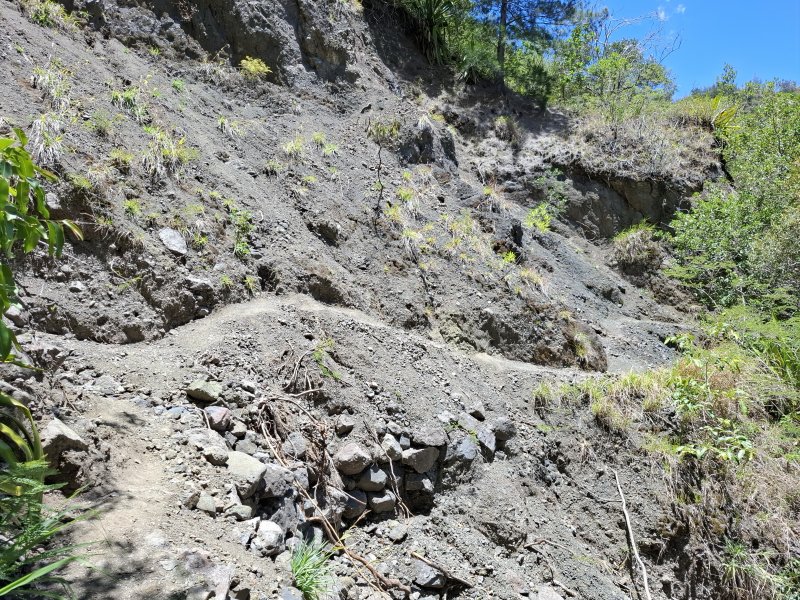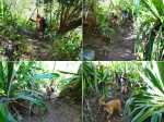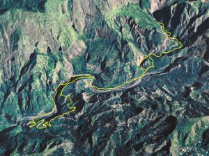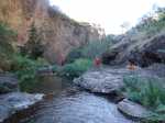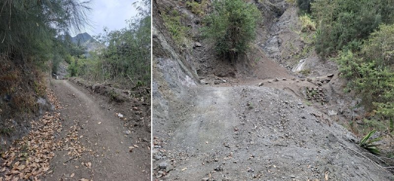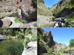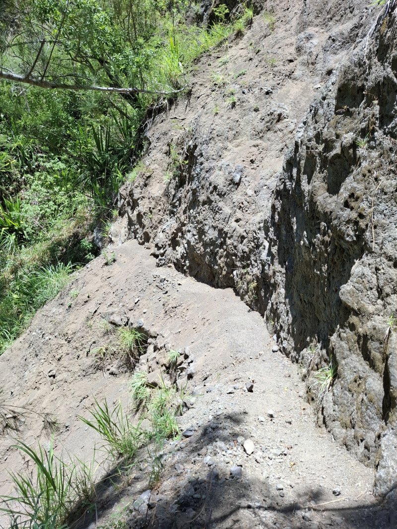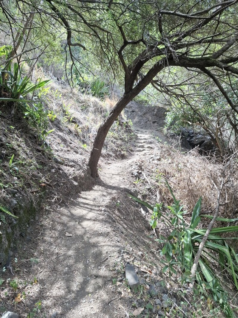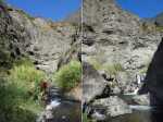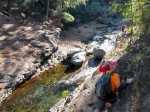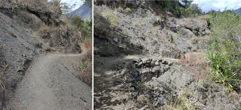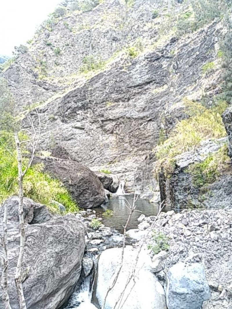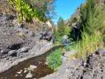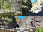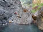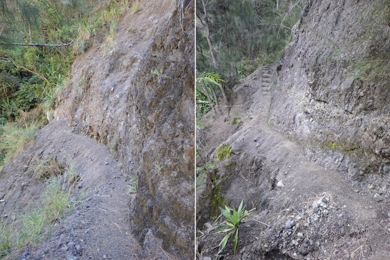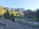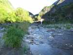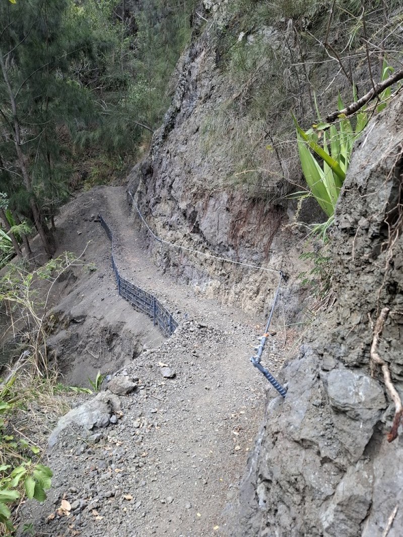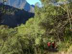 Si le chrono le permet et que la forme est encore là, il est conseillé d'emprunter le sentier d'évitement de la cascade puis de rejoindre le Bras de Cilaos en utilisant les longues cordes sécurisant la très forte pente glissante (Photo 26). Partir vers l'aval dans une vallée beaucoup plus large que celle du Bras de Saint-Paul. Elle ne manque pas d'attraits et ne comporte aucun danger hormis les chutes possibles de cailloux détachés de la falaise (Photo 27). On atteint en moins d'une heure la route de Cilaos et le barrage du Pavillon (Photo 28). Ne pas manquer l'étroit sentier qui a remplacé la piste descendant à la rivière et mènant au portail proche de l'arrêt de bus du Pavillon. Si le véhicule attend au Sentier Burel, il faudra entamer la remontée de la demi-douzaine de lacets de la RN5, sans doute la partie la moins passionnante de cette sortie aventureuse.