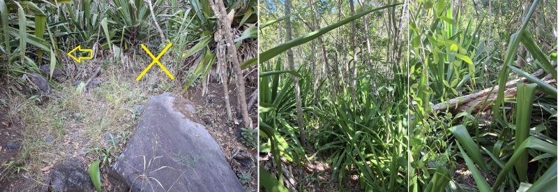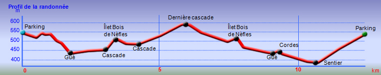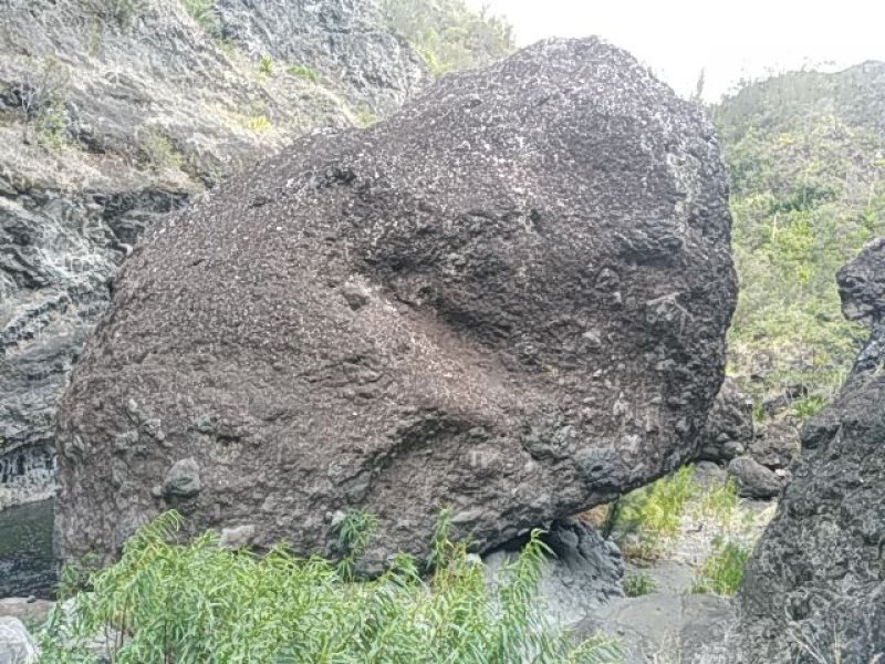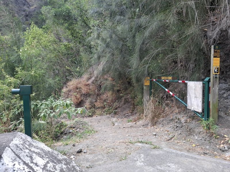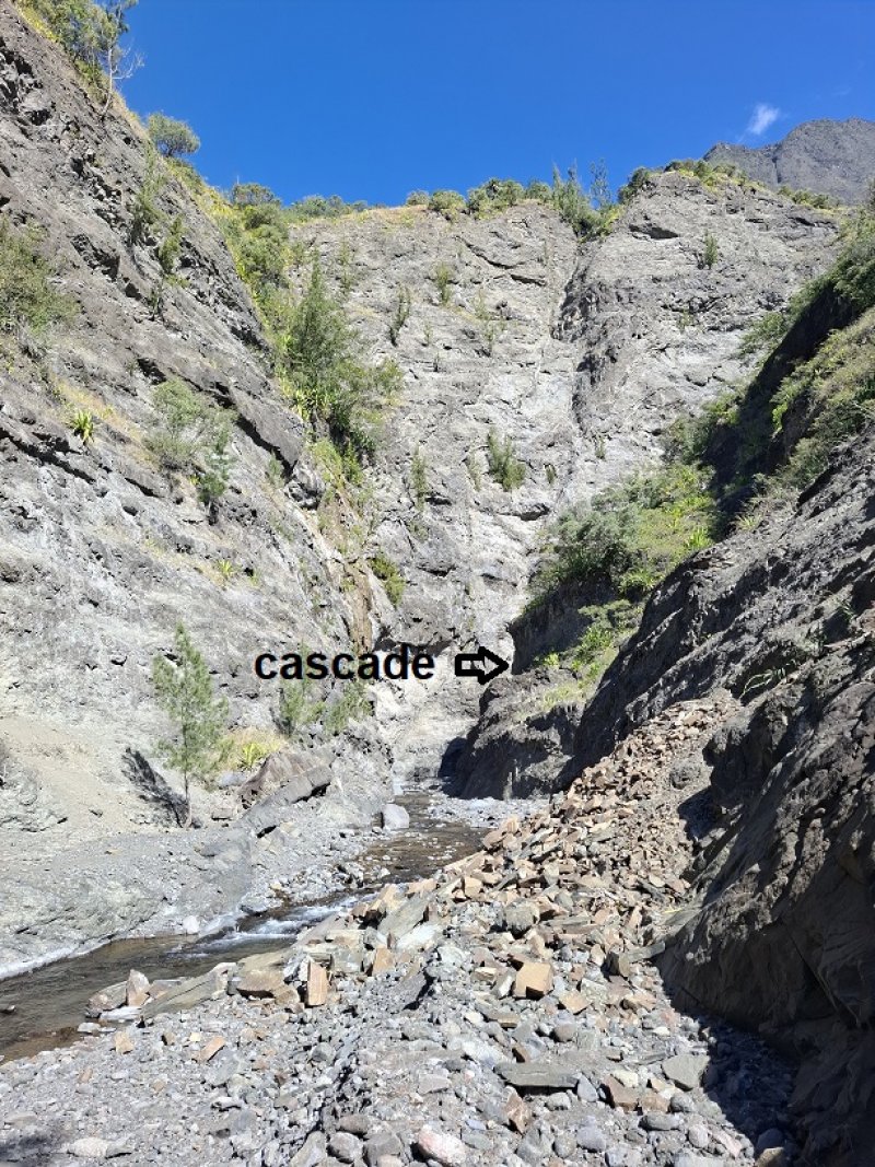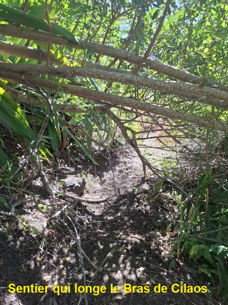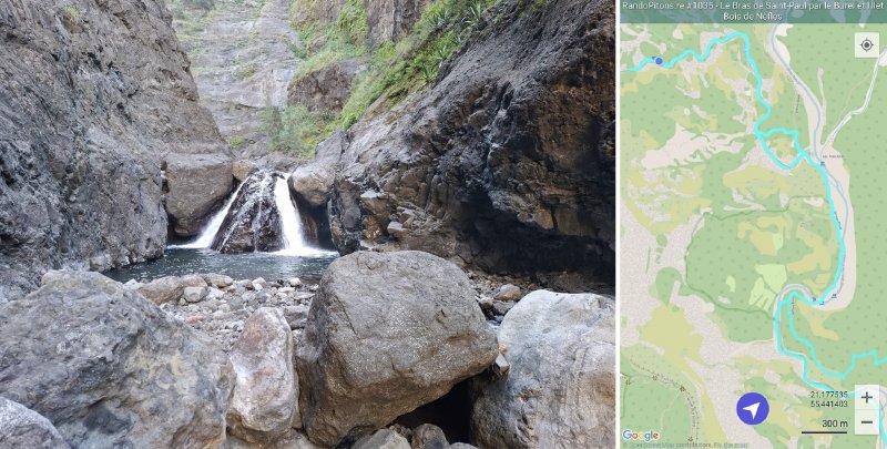 La randonnée débute à la route de Cilaos, au plus près du Sentier Burel où quelques emplacements permettent de stationner. Le Sentier Burel est un classique de la région, souvent fermé pour éboulis glissants mais aussitôt réparé. Il descend tout d'abord avant de longer le rempart en corniche (Photo 1). Le passage est parfois étroit, souvent glissant sur le sable mais ne comporte pas de grosses difficultés. Avant la mi-parcours, on peut apercevoir les virages du Pavillon qu'on empruntera en fin de parcours (Photo 2). De l'autre côté, c'est le Parc à Dennemont, toujours cultivé, qui commence à se deviner (Photo 3). Repérer, pour le retour, le sentier descendant à gauche vers le Grand Bras de Cilaos, terminer par une descente et parvenir au gué proche d'un beau bassin alimenté par une courte mais forte chute (Photo 4). Franchir le gué sans forcément choisir de passer les pieds au sec puisqu'on aura plus tard de nombreuses occasions de mouiller obligatoirement les chaussures. Le sentier se poursuit en rive droite sur des portions sableuses puis en sous-bois envahis de chocas (Photo 5). On arrive ainsi très rapidement à Trois Bras, une large plaine couverte de roches où se réunissent le Bras de Saint-Paul, le Bras Rouge et le Bras de Benjoin pour former l'unique Grand Bras de Cilaos (Photo 6). Franchir le gué du Bras de Saint-Paul, prendre quelques minutes pour le remonter en se mouillant jusqu'à la taille pour atteindre la cascade et son rocher caractéristique empêchant toute montée (Photo 7). Revenir sur ses pas, bifurquer à gauche puis entamer la montée du Sentier du Reposoir en prêtant attention aux énormes pieds de bois d'olive (Photo 8). La première partie comporte peu de lacets. Ne pas manquer, après l'un d'entre eux, le gros rocher qu'il faut contourner par la gauche. Le départ du sentier se trouve exactement en face de ce rocher dans les chocas qui peuvent en masquer l'entrée (Photo 9). Cet étroit passage entre les chocas épointés au coupe-coupe par endroits serpente par de multiples virages qui permet de les éviter. On remarque çà et là des manguiers abandonnés et quelques murets de pierres sèches délimitant des parcelles lorsque le plateau était cultivé. Arrivé au bord du rempart, poursuivre en descente, toujours dans les chocas, en partant sur la droite. Frôler au passage un gros rocher servant d'abri ou de bivouac et terminer sur les berges du Bras de Saint-Paul. On mouille peu les pieds dans la première exploration vers l'aval. Il y a toujours un passage près du torrent quitte à escalader un peu les berges abruptes (Photo 10). On parvient très vite à la cascade aperçue en début de montée. En étudiant les falaises qui bordent la cascade, on voit bien qu'il est difficile de franchir l'obstacle même si certains randonneurs s'y risquent (Photo 11). Repartir vers l'amont jusqu'au sentier de l'Îlet Bois de Nèfles et poursuivre en cherchant le meilleur passage (Photo 12). Lorsque le canyon se rétrécit, on devine facilement les traces de passages étroites et sableuses le long des falaises qui dominent le torrent (Photo 13). Le plus souvent, la montée s'effectue sans grandes hésitations sur des berges basaltiques ou peu rocheuses (Photo 14). Quelques petites cascades le long des falaises environnantes viennent grossir le débit de l'eau (Photo 15). Le torrent est agréable, jamais dangereux et quelques panoramas égayent la sortie. En revanche, les hautes falaises verticales et friables ne doivent pas s'affronter par jours pluvieux. Un casque est même recommandé pour plus de sécurité (Photo 16). Tous les types de paysages sont traversés. Les grosses roches côtoient les bassins, les toboggans ou les petites cascades (Photo 17). Un énorme éboulis confirme le danger potentiel du lieu avant la fin de la montée. Il est tellement haut que l'eau a trouvé son chemin sous les roches et les gravats. Son escalade doit se faire calmement en évitant de se suivre de trop près car les pierres sont instables (Photo 18). On quitte rarement les hautes falaises qui n'empêchent pourtant pas quelques vues sur les remparts en direction du Piton du Petit Mapou et de La Fenêtre des Makes (Photo 19). Le bras est toujours aussi agréable avec ses nombreux bassins et ses pièges à poissons (Photo 20). La vallée se rétrécit par moments imposant d'emprunter le lit du torrent où le niveau est toujours assez faible (Photo 21). Les 500 derniers mètres se ressemblent, avec des passages très faciles, d'autres plus encombrés de hautes herbes ou permettant de côtoyer quelques nouvelles petites cascades (Photo 22). A l'altitude de 611 m, le bras fait un coude vers la droite, là où un bassin profond bloquait la remontée avant les perturbations d'un cyclone. Le passage est désormais dégagé et ce bassin se passe sans nager. On parvient à la cascade amont pour se retrouver à nouveau bloqué. Mais le spectacle vaut l'effort fourni pour l'atteindre ,et la noirceur des roches s'oublie très vite (Photo 23). Après une bruyante pause aquatique, reprendre le chemin inverse et entamer la descente du cours d'eau en poursuivant l'exploration ou la découverte de nouvelles curiosités (Photo 24). Marcher ainsi jusqu'au sentier de l'Îlet Bois de Nèfles, remonter, puis traverser l'îlet envahi de chocas et descendre les derniers mètres du Sentier du Reposoir avant de traverser à nouveau le Bras de Saint-Paul. Reprendre le Sentier Burel en longeant le Grand Bras de Cilaos (Photo 25). Franchir le gué avant la cascade puis entamer la remontée vers la route de Cilaos. La randonnée peut se terminer là en longeant le rempart jusqu'au parking du Sentier Burel.