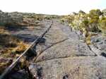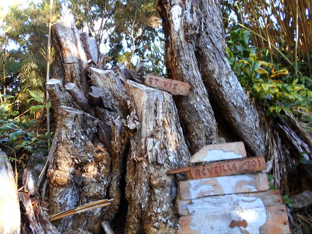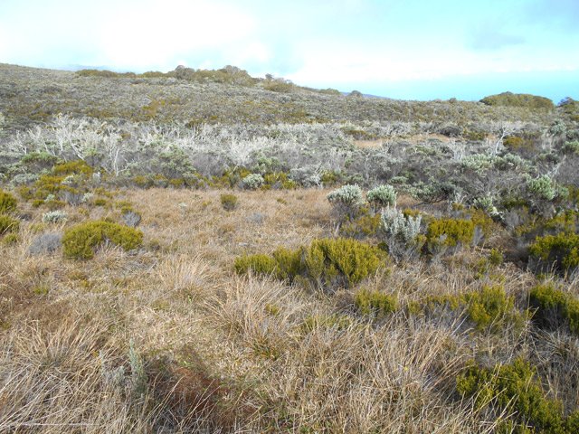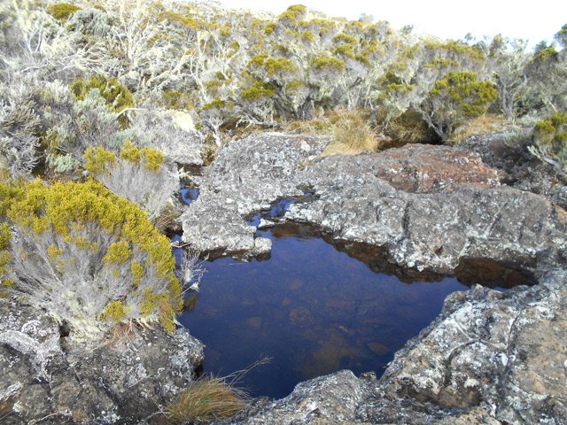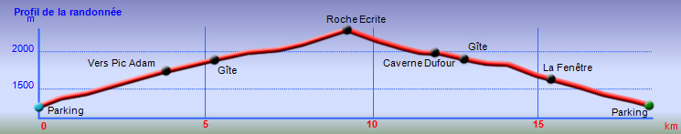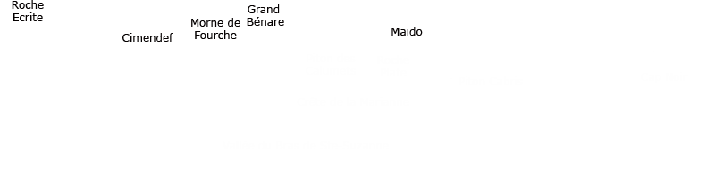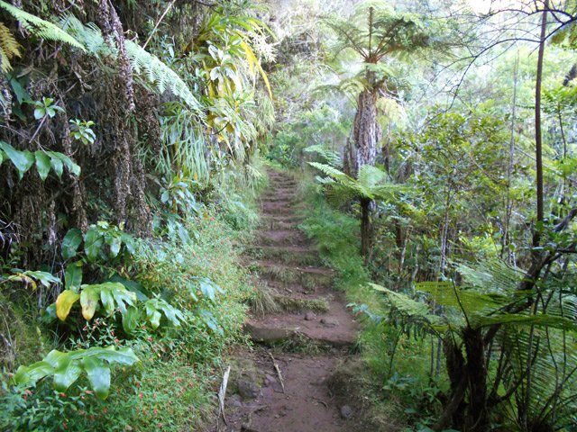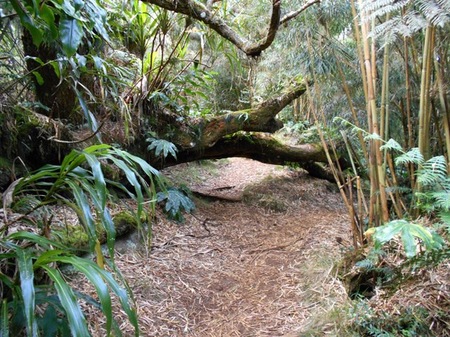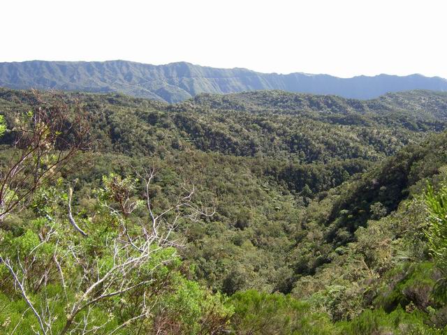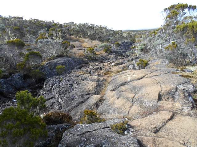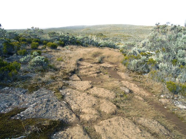 La randonnée débute à la fin de la route du Brûlé, à Mamode Camp, où il est possible de se garer près de l'aire de repos. Pour rallonger cette sortie pour les sportifs à l'entraînement, on peut stationner un peu partout, vers le croisement de la Cascade Maniquet ou près du parcours sportif. Emprunter les quelques marches qui finissent à un très grand kiosque pour famille nombreuse avec barbecue géant et grandes tables. Le poteau de l'ONF prévoit 2 heures pour atteindre le gite et 90 minutes supplémentaires pour gagner le sommet. Il faut savoir avant de partir que ces 3h30 s'effectueront principalement en montée. Plus de 1000 mètres sans échauffement peut rebuter les marcheurs peu entraînés. Le sentier monte effectivement 95% du temps mais la pente n'est jamais forte. Les quelques replats rencontrés sont trop courts pour reprendre son souffle et la meilleure solution consiste à prendre un rythme de croisière dès le départ. On débute sur des marches bien aménagées, qui, à voir les raccourcis créés par les gens pressés, servent de moins en moins. Les cryptomerias procurent de l'ombre mais le bois n'est pas très vaste (Photo 1). Après le panneau de l'ONF, on pénètre dans la forêt de bois de couleurs mais on voit surtout des fougères arborescentes, des longoses et de plus en plus de sabres marrons (Photo 2). Dans les trouées vers la droite apparaissent de temps en temps des pitons aux pentes douces recouvertes d'une belle forêt qui sépare de la vallée de la Rivière Saint-Denis (Photo 3). On profite également des vallées encaissées du Bras Sec. Les longoses deviennent de plus en plus fréquentes mais n'envahissent pas le sentier (Photo 4). Tous les types de sentiers sont représentés : portions boueuses, empierrées, avec marches ou sur planches pour isoler des parties les plus humides. Plus on s'élève et plus les paysages grandissent. On peut même voir au loin la canalisation de l'Îlet à Guillaume (Photo 7). Un peu plus haut, le sentier a été creusé profondément dans la terre, créant, avec la végétation des espèces de courts tunnels (Photo 8). Les premiers tamarins des Hauts font aussi leur apparition et certains rivalisent de beauté (Photo 9). Le sous-bois devient plus clair et les envahissantes ou fougères sont remplacées par de hauts calumets qui recouvrent ici de très grandes surfaces (Photo 11). On pourrait même penser qu'ils constituent l'essentiel du sous-bois aux alentours du sentier menant à Bois de Nèfles. Puis ils diminuent rapidement à partir de 1800 m pour laisser la place a de plus en plus de tamarins (Photo 13). Aux alentours du gîte, de nombreux abattages ont privé la forêt de ces tamarins ou eucalyptus tombés lors de cyclones. Après deux heures de montée régulière, on peut effectuer une courte pause si le bâtiment est ouvert (Photo 15), sinon, suivre les panneaux indiquant la Roche Ecrite. Le sentier débute sous les tamarins, passe près des réserves d'eau puis traverse des landes plus ou moins touffues traversées par un sentier recouvert d'herbe courte (Photo 16). D'anciens branles verts détruits par des incendies, rongés doucement par les lichens, sont désormais remplacés par de plus jeunes (Photo 17). Il faut ensuite passer une portion où le sentier monte un peu plus sur un sol assez caillouteux. Les clairières se multiplient et le sentier s'élargit sur des plaques de lave (Photo 18). On frôle la Caverne Dufour dont la visite ne prend que quelques minutes. La végétation se rabougrit de plus en plus à l'approche des 2000 m d'altitude. Les plaques de lave sont très larges et le hors sentier est tentant s'il fait beau. On peut ainsi suivre une canalisation chargée de récupérer de l'eau a quelque source cachée dans la roche (Photo 21). Comme le brouillard est souvent présent à cette hauteur, le sol est recouvert de marquages blancs de grande taille, impossibles à perdre des yeux. Il faut traverser des ravines à sec (Photo 23), de nouvelles plaques (Photo 24), des clairières qui attirent les cerfs (Photo 25) et une assez fastidieuse portion qui grimpe dans les roches et petits cailloux (Photo 26) avant d'arriver à la bifurcation vers la Caverne Soldats. Partir sur la droite et suivre les traces ininterrompues de peinture blanche jusqu'au sommet pour profiter du spectacle sur les deux cirques 1000 m plus bas. On ne décrit plus ce lieu unique de roches peintes de toutes sortes de graffitis ou bas reliefs, souvent naïfs et toujours sans aucun goût (Photo 28). Aucun intérêt donc de monter plus de 1000 m pour rechercher de l'art qui n'existe pas. En revanche, les paysages peuvent donner lieu à des photographies de concours si les nuages sont restés sagement cachés et que le soleil n'est pas trop mal aligné (Photo 27). C'en est fini des efforts et après une longue pause à profiter du spectacle, la descente peut commencer. Elle s'effectuera sur le même itinéraire mais les curieux qui en ont encore dans les jambes pourront tester d'autres sentiers et profiter de nouveaux panoramas en étudiant la fiche sur les autres traces traversant la planèze de la Roche Ecrite et de la Plaine des Chicots.