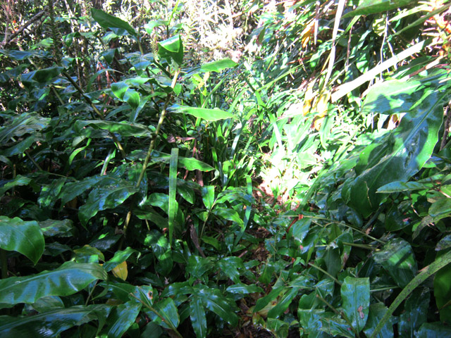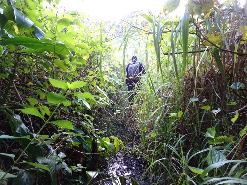 Se rendre aux Avirons puis au Tévelave et se garer près de l'église - Emprunter la petite rue qui débute à gauche quand on regarde l'église, traverse une zone d'habitations, se poursuit par une piste bétonnée jusqu'à un réservoir d'eau et pénètre dans un "champ" de très grandes herbes et de pestes végétales (Photo 3) - Débuter le sentier qui monte rapidement par des marches glissantes - Laisser le sentier qui part à gauche puis l'autre qui continue tout droit vers la Ferme Deveaux et suivre le sentier qui longe souvent la canalisation - Rencontrer la Source La Moque puis la Source La Fouche avant de rejoindre, plus haut les sources du Ruisseau Amont - Revenir sur ses pas jusqu'au Tévelave. Cette sortie étant courte, on peut rajouter le petit tronçon de la Source Deveaux avant de retrouver le Tévelave.