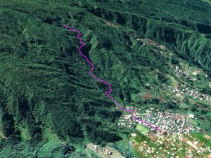 La randonnée débute à l’église du Tévelave et suit la première partie du circuit de la Ferme Deveaux par la Rue des Cyprès qui jouxte l'église, puis par une courte montée vers le Château d'eau. Passer la réserve d'eau, suivre le sentier toujours envahi de végétation en direction de la source Deveaux. On prend à droite après une première bifurcation vers la Source et au lieu de monter directement comme pour aller à la ferme, on tourne à droite puis on longe ici alternativement les courbes de niveau ou de fortes montées, surtout après le passage obligatoire et glissant des ravines. On arrive ainsi à la Source La Moque puis à la Source La Fouche après un bon petit raidillon. On poursuit la montée de ravines en "champs" de longoses jusqu’au petit barrage de la source Ruisseau Amont (Photo 13). Le sentier se perd dans la végétation constituée essentiellement de longoses, souvent mouillées et le retour s’effectue par le même itinéraire.