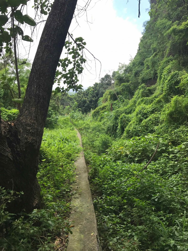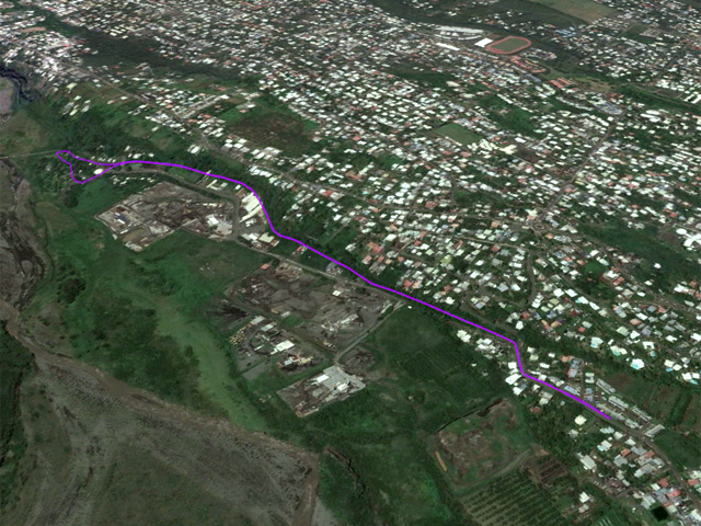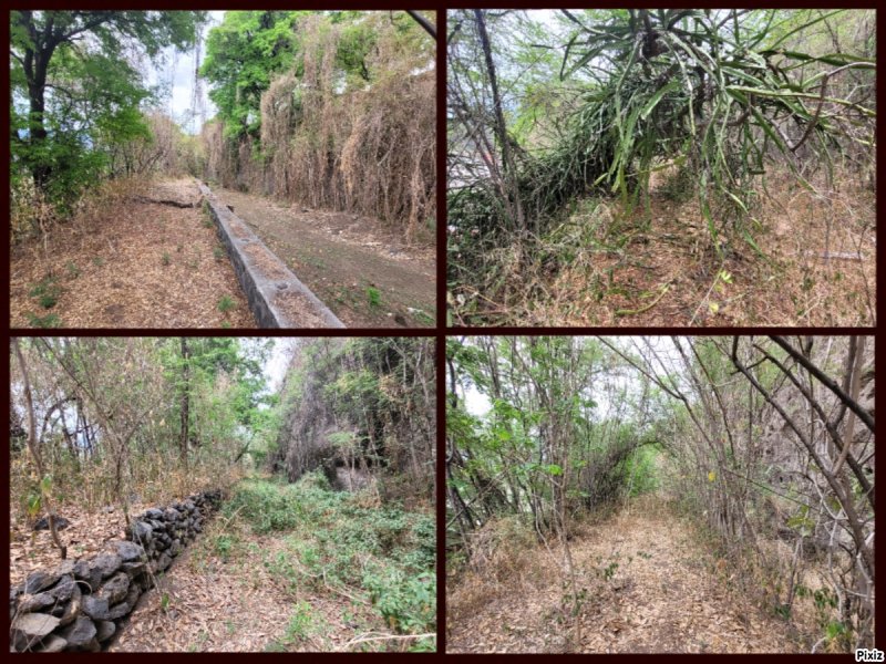 La sortie débute exactement sur le pont qui enjambe le canal au croisement de la route de Bois d'Olive et celle du Ouaki vers l'Entre-Deux. On y accède par les vestiges d'une porte en pierre. Le sentier sableux est totalement plat et c'est sans effort qu'on rejoint, 30 minutes plus tard la route de l'Entre-Deux après avoir longé le stand de tir à l'arc. On a quelques vues sur les Makes et le massif du Dimitile mais ce n'est pas une randonnée d'où l'on rapportera le cliché du plus beau panorama. Une fois le deuxième pont franchi, flâner le long de la partie du canal qui transporte encore de l'eau et profiter, si c'est l'heure, d'un abri de l'aire de pique-nique pour grignoter un casse croûte. L'aire est en très mauvais état, sale et peu attrayante et c'est très vite qu'on reprend le chemin en sens inverse pour regagner le véhicule. Le canal, hélas, sert bien souvent de décharge publique. Les habitants au-dessus de la falaise ne se gênent pas pour se débarrasser de ce qui ne fonctionne plus et qui est très encombrant. On y rencontre même le châssis d'une remorque de camion !!!