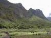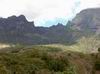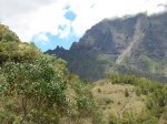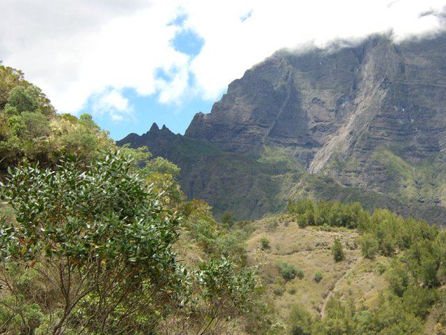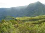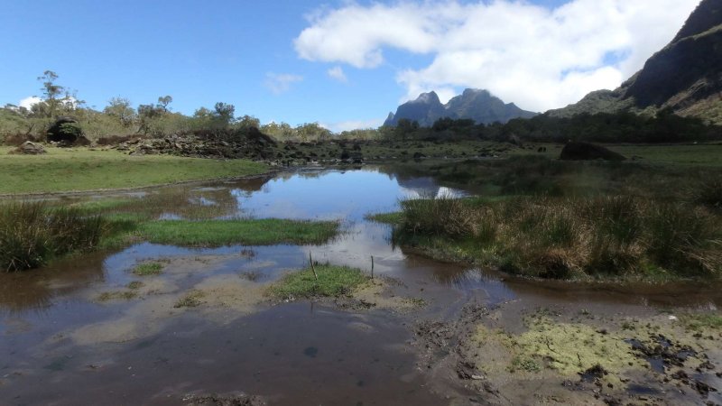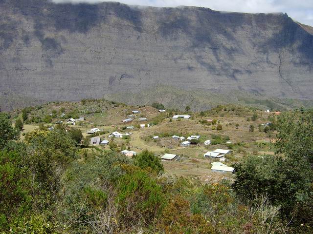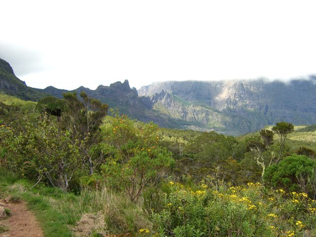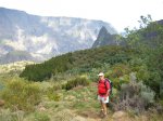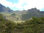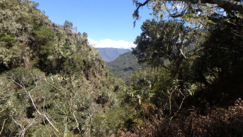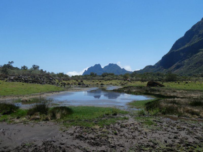 La randonnée débute au parking du Piton Marmite puis emprunte la Route Forestière du Haut Mafate jusqu'au Col des Bœufs. Profiter avant le départ de beaux paysages sur le nord du cirque. On remarque le Cimendef qui se prolonge par la Crête de la Marianne. On devine même le Sentier Scout à Deux Fesses avant le Plateau de la Sale (Photo 1). De l'autre côté, par beau temps, on voit une très grande partie du cirque de Salazie reconnaissable au piton d'Anchaing qui semble en occuper le centre (Photo 2). Au col, depuis l'aire de dépose des matériaux qui seront transportés par l'hélicoptère, on poursuit avec les superbes panoramas, à gauche vers le Col de Fourche (Photo 3) puis devant vers Marla. Le sentier, rocailleux et terreux, descend vers la Plaine des Tamarins par une série de lacets, souvent humides et glissants par moments (Photo 4). Parfois, il est constitué de larges plaque de pierres et de hautes marches (Photo 6). La végétation est variée et fort heureusement assez peu envahie de pestes végétales (Photo 5). Les points de vue sont nombreux sur le cirque, jusqu'au rempart opposé vers le Maïdo (Photo 10). Après le croisement avec le sentier remontant au Col de Fourche, le sentier devient de plus en plus plat et les premiers tamarins des Hauts font leur apparition. Sur la Plaine des Tamarins, ils rivalisent de grosseur et même couchés au sol, poursuivent leur croissance (Photo 11). On traverse quelques portions marécageuses et couvertes de joncs puis on rencontre à nouveau un sentier qui part à gauche vers Marla. C'est le sentier qu'on emploiera au retour. Partir tout droit en direction de la Nouvelle. Le sentier est toujours correct malgré quelques hautes marches en descente. Depuis la Découverte, on commence à apercevoir la Nouvelle et son habitat dispersé (Photo 12). La descente vers la Nouvelle comporte quelques portions un peu abruptes qui peuvent être glissantes et un détour est possible par le Plateau Chêne pour un point de vue sur l'Îlet ou un autre par le Chemin Charrette mais il rallonge un peu la sortie. Après une halte ou une visite du plus grand village de Mafate, le circuit se poursuit, toujours sur le GRR1 en direction de Maison Laclos ou de la Plaine aux Sables. Il faut franchir plusieurs ravines qui obligent à des montées suivies aussitôt de descentes qui cassent un peu les jambes. Après une longue série de lacets courts, on parvient à la verticale de l'Îlet de Gravina qu'on domine en empruntant le sentier presque plat qui franchit la Ravine Alidor. On profite déjà de larges panoramas sur le rempart opposé où l'on devine le Plateau du Kerval à mi-pente (Photo 13). Une longue descente amène à la Rivière des Galets qu'on traverse sur une passerelle dominant cascades et bassins (Photo 17 et 18). Après avoir franchi la passerelle et frôlé la stèle Joset Ethève, la remontée est rapide sous les filaos en direction de Maison Laclos. Au croisement suivant, prendre à droite vers Marla et marcher jusqu'aux cases isolées de Maison Laclos. Guetter sur la gauche le sentier qui remonte au Plateau de Kerval. A partir de ce croisement, il faut grimper, presque dans le lit caillouteux de la Ravine Kerval jusqu'au plateau où paissent quelques petits bovins (Photo 21). Le sentier est officiellement fermé, sans doute pour longtemps mais tant que les vaches passeront, les randonneurs pourront également trouver la voie caillouteuse qui mène au sommet. Le lieu est dominé par la muraille des Salazes et du Gros Morne (Photo 22). Un sentier permet de rejoindre les Trois Salazes mais comme il faut user de cordes, ce n'est plus de la randonnée mais de l'escalade à effectuer avec un guide. Pour les voir de plus près, il faut partir vers Cap Bouteille et longer ensuite la crête étroite d'où l'on bénéficie d'ailleurs de splendides points de vue sur la mare et les bovins qui l'entourent. On trouve sur place plusieurs emplacements de bivouac qui semblent servir fréquemment. Ne pas hésiter, en fonction de l'heure, de faire le tour de la mare (Photo 25) et de pousser jusqu'aux cascades du Bras Massine ou des sources qui alimentent la petite étendue d'eau. On est tellement bien sur ce terrain plat qu'on hésite à reprendre dans l'autre sens le fond de la Ravine Kerval. Il faut pourtant faire demi-tour afin de regagner Maison Laclos qu'on aperçoit depuis le bord du plateau (Photo 20). On retrouve dans la descente la porte rustique en bois qui empêche les bovins de redescendre (Photo 27). Il faut également marcher à nouveau sur les gros galets du fond de la Ravine Kerval (Photo 28). Après avoir retrouvé le GRR3, prendre à droite pour rejoindre la Plaine des Tamarins après un passage à gué de la Rivière des Galets et une belle petite montée pour rejoindre le point de vue de la Mare aux Serres. La remontée au Col des Bœufs ne présente pas plus de difficultés que celles découvertes le matin dans la descente vers la Nouvelle.