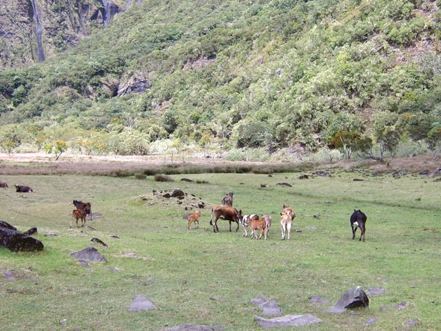 Si la Plaine des Tamarins est bien connue et très fréquentée, il n'en va pas de même pour le Plateau de Kerval, seul refuge de quelques bovins qui paissent esseulés à près de 1800 m d'altitude. Une mare qui abrite quelques poissons sert d'abreuvoir à des petites vaches qui montent sans doute plus facilement les pentes escarpées et caillouteuses de la Ravine Kerval pour rejoindre les lieux de pâturages que les limousines qu'on rencontre habituellement à la Plaine des Cafres. Impossible de s'échapper de ce lieu calme et sauvage, entouré de précipices. Le seul accès pour les randonneurs comme pour les bêtes est le sentier de la Ravine Kerval qui nécessite de franchir une barrière en bois puis d'escalader de nombreux rochers et racines. Les tamarins, à cette altitude sont moins grands que vers la Nouvelle et ils sont couverts de ces longues barbes de Jupiter (Usnea barbata) qui peuvent donner l'occasion de très beaux clichés, aussi bien avec du soleil qu'avec les fines gouttelettes du brouillard qui s'y déposent. Evidemment, les panoramas de tous les côtés du cirque sont innombrables, les plus impressionnants étant les flancs du Gros Morne depuis le plateau.