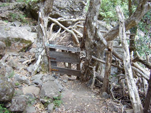 Photos jointes 1-le poteau placé à l’entrée de la ravine Kerval et qui indique le départ à Maison Laclos 2-le portail de la photo 27 à souffert 3-des cairns indiquent le cheminement dans la ravine 4-la ravine Kerval 5-la mare sur le plateau