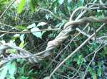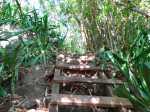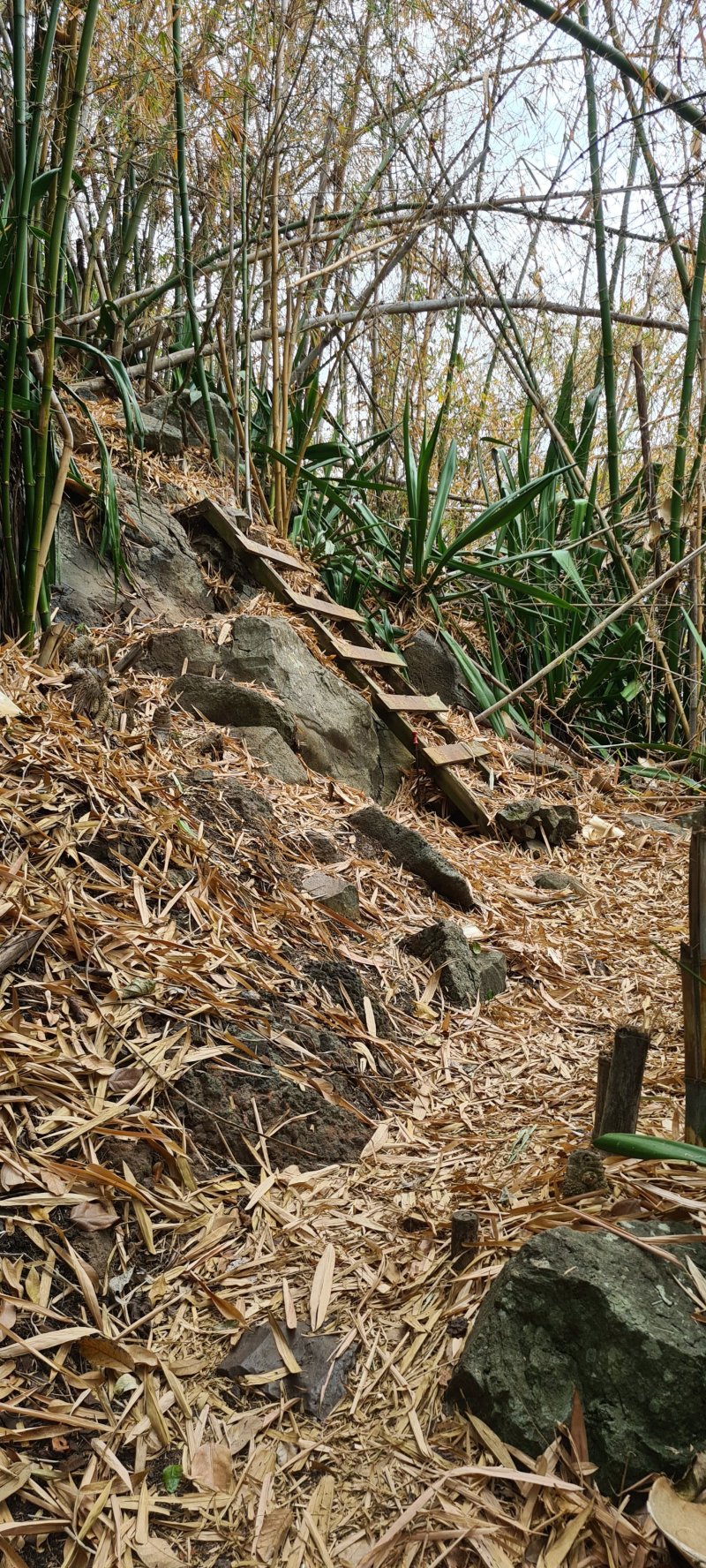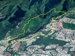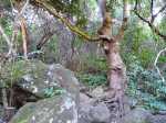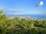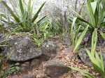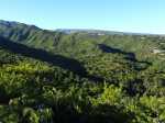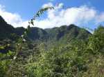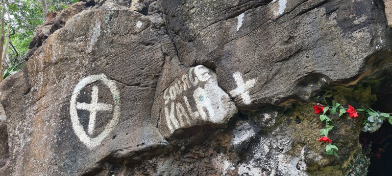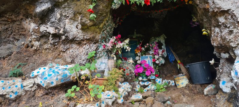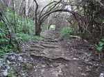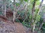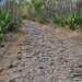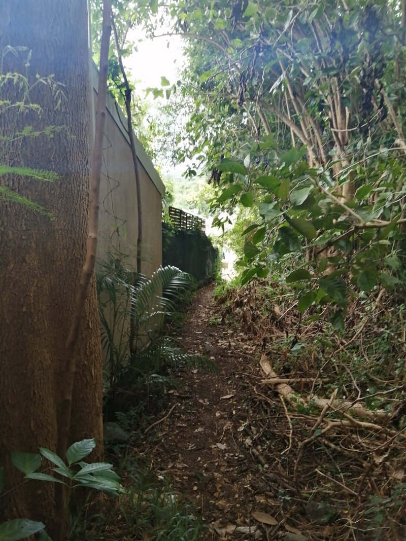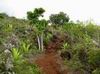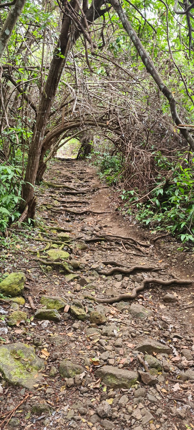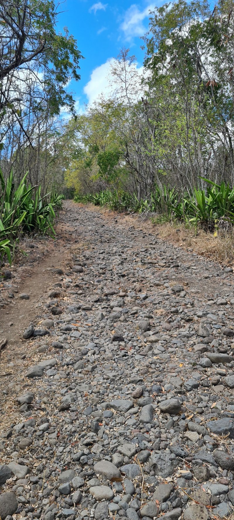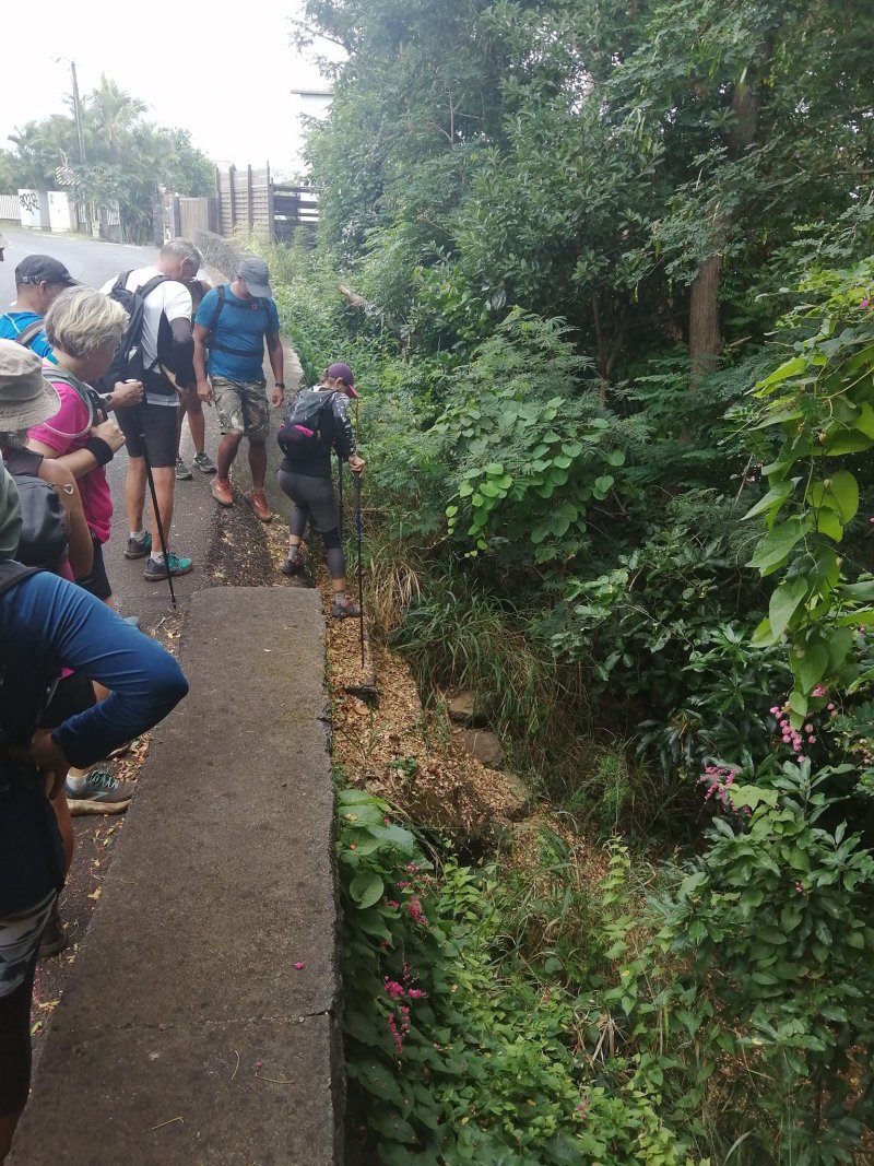 La randonnée débute par l'oratoire original à deux étages, de couleur rouge sang, accueillant aussi bien le Christ, la Vierge, Saint-Expedit, des statuettes malgaches et des foulards rouges malabars (Photo 1). Remonter un peu la rue pour pénétrer dans le lotissement de La Grande Montagne. La montée est un peu forte mais très agréable au milieu des belles demeures, des jardins et espaces fleuris (Photo 2). Passer les dernières constructions en haut du lotissement puis partir tout droit vers le début de la petite piste qu'on devine de loin. Cette large piste, très caillouteuse, est essentiellement bordée de chocas, de bois noirs et d'épineux (Photo 3). Les marcheurs et joggeurs viennent nombreux malgré ce sol caillouteux sur une assez courte distance. On rencontre ensuite de très belles portions de sentier pavé qui montent en pente douce dans la même végétation (Photo 4). La bande de gros pavés est au centre d'une piste plus large que ce qu'on voit réellement, un peu comme au Chemin des Anglais. La végétation a caché une partie du bord et il faudrait d'importants travaux pour redonner vie à la piste comme on l'a vu également près de Saint-Paul (Photo 4). La piste originelle disparaît doucement dans les grandes herbes et plusieurs lacets sont coupés par le sentier. Plus haut, quelques filaos, manguiers et bois de couleurs se rajoutent à la végétation déjà pauvre mais ce sont les fougères qui dominent (Photo 6). Les chocas prennent tout de même une part importante des plantes en bordure de sentier (Photo 7). On profite de plusieurs points de vue sur Le Port dont on aperçoit toutes les infrastructures portuaires (Photo 8). Plus haut, ce sont de très vastes panoramas sur l'îlet de la Mare et des pitons qui l'entourent. Les rochers envahissent petit à petit l'itinéraire mais les traces de boue séchée montrent que joggeurs ou promeneurs du dimanche ne sont pas gênés par ces obstacles (Photo 9). On peut même grimper sur les roches pour profiter du panorama en direction de Saint-Paul (Photo 10). Comme la végétation est assez basse, on a sous les yeux de vastes paysages au-dessus de Dos d’Âne (Photo 11). Les fougères diminuent, le sentier fait un angle droit et plonge à droite vers la Ravine de la Mare. Avant de prendre cette descente, repérer pour une prochaine sortie TRES sportive, dans le prolongement du sentier, le départ du sentier Joncourt qui a beaucoup souffert et sur la gauche le sentier qui mène à la Grande Ravine des Lataniers. Un écart de quelques minutes permet de profiter d'un beau panorama sur le village et la Grande Ravine des Lataniers en grimpant sur de gros rochers plats. Entamer la descente qui coupe le Bras Marie puis se dirige vers la Ravine de la Mare, en sous bois, dans une très légère et agréable descente (Photo 12). Comme tout au long de ce circuit on ne vient pas pour la végétation très pauvre qui, ici, est dominée par les faux poivriers (Photo 13). Ces arbres aux branches fragiles en perdent une grande partie lors des coups de vent (Photo 14) et laissent souvent de nombreuses racines en travers du passage (Photo 15). Le sentier longe tout d'abord la ravine en rive droite, la franchit puis revient en rive gauche, toujours sous les poivriers et de plus en plus de lianes papillon. Les travaux d'entretien créent de véritables tunnels végétaux qui se bouchent assez vite. Le sentier frôle une grande mare à sec avec un rocher en son milieu (Photo 16). Bifurquer à gauche au moment où la végétation bouche ce qui fut jadis une piste menant à l'Îlet de la Mare, toujours présente sur la carte, et débuter la pente par une petite échelle rudimentaire en bois (Photo 17). La forte pente est courte jusqu'à la ligne de crête. On marche sur de gros cailloux créant parfois de très hautes marches, rendant l'effort soutenu. On arrive, le souffle un peu court, au sommet parsemé de gros rochers d'où l'on profite de quelques vues sur Le Port, les maisons de Pichette ou Ste-Thérèse et toujours sur l'îlet de la Mare désormais dévoré par la végétation (Photo 19). Commence une descente parsemée de pierres qu'il faut éviter ou de grosses roches qu'il faut parfois escalader. On passe au plus près de la Source Kalla et de la grotte dédiée à la Vierge, peinte de blanc et de bleu (Photo 20). La descente, qui demande autant d'attention, se poursuit sur les blocs et les racines (Photo 21). La liane papillon est partout, facilement reconnaissable à ses très longues tiges et les torsades sur elle-même ou autour des arbres (Photo 22). La descente sera difficile jusqu'à la Ravine à Marquet avec de très rares passages à plat (Photo 23). Franchir la ravine sur les grosses roches puis remonter, toujours de manière abrupte mais sans danger, jusqu'au chemin Ratinaud à travers le même paysage de roches, chocas et lianes (Photos 24 et 25). Le plus difficile et le plus agréable est terminé. Profiter, avant de poursuivre, des jolis paysages en direction du Piton Grand Bazar (Photo 26). On peut, à partir de ce chemin bétonné, prendre à gauche vers Dos d’Âne ou à droite vers La Possession et le véhicule. Cette dernière partie de la sortie s'effectue en ville. Ne pas oublier la carte, l'application ou le GPS pour mieux retrouver les chemins et sentiers qui courent entre les quartiers de Ste-Thérèse et du lotissement Lapinsonnière afin de rejoindre plus vite le Chemin du Bœuf Mort. A la fin du Chemin Ratinaud, partir à droite puis très vite à gauche sur le Chemin des Grands Palmiers. Trouver à droite le raccourci dans les lianes papillons d'une zone encore préservée par le béton (Photo 27). On récupère plus bas la Rue Carambole qui finit à la D1. Marcher jusqu'à la petite église aux toits bleus et tourner à droite sur le Chemin du Bœuf Mort (Photo 28). La fin n'est guère plus intéressante que ce précédent kilomètre à travers les lotissements protégés par vidéosurveillance et