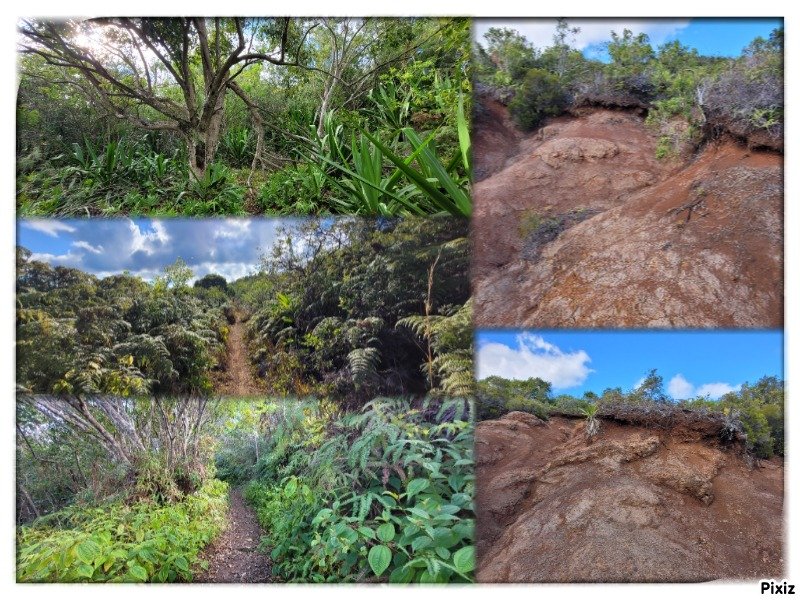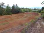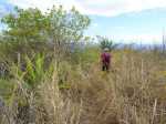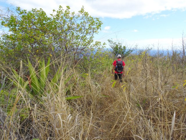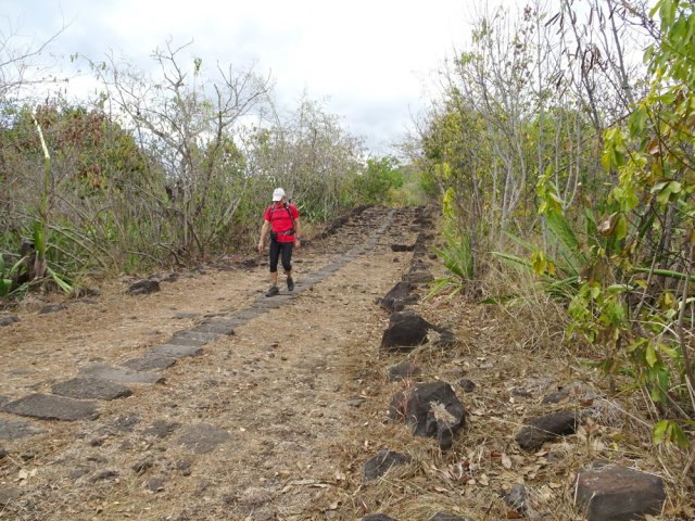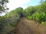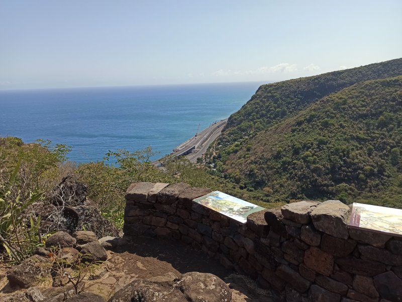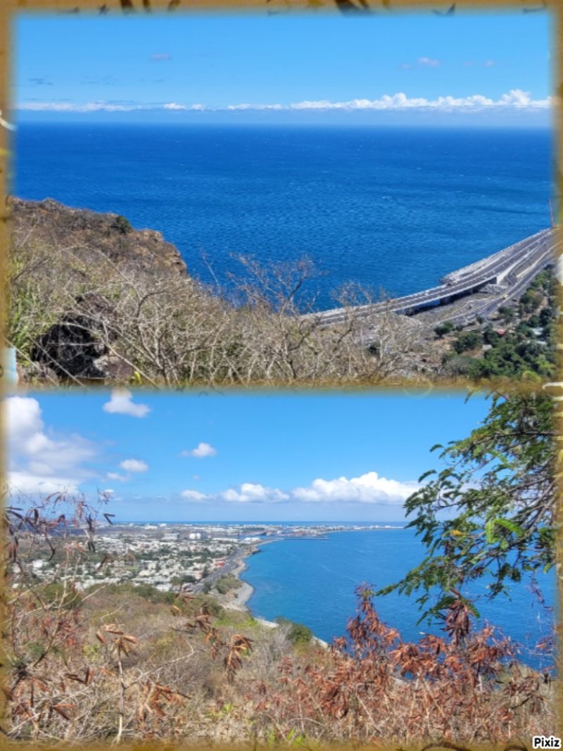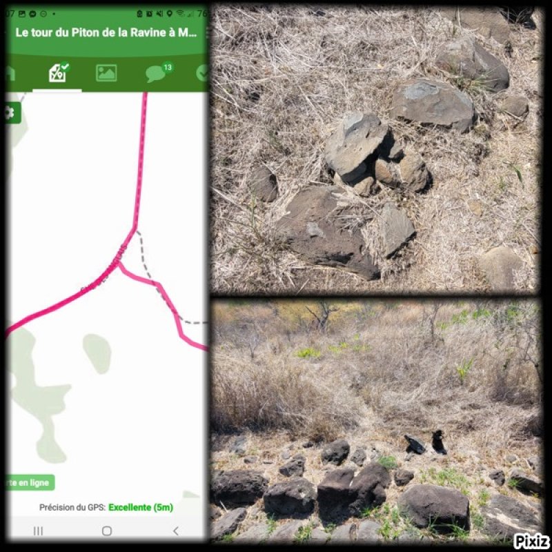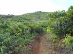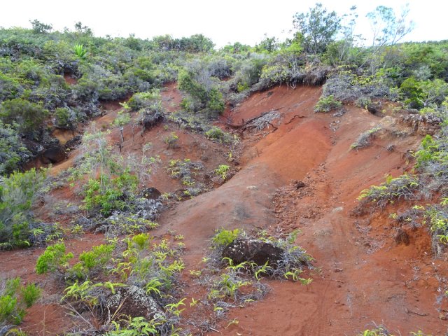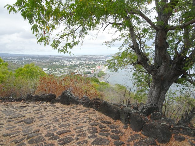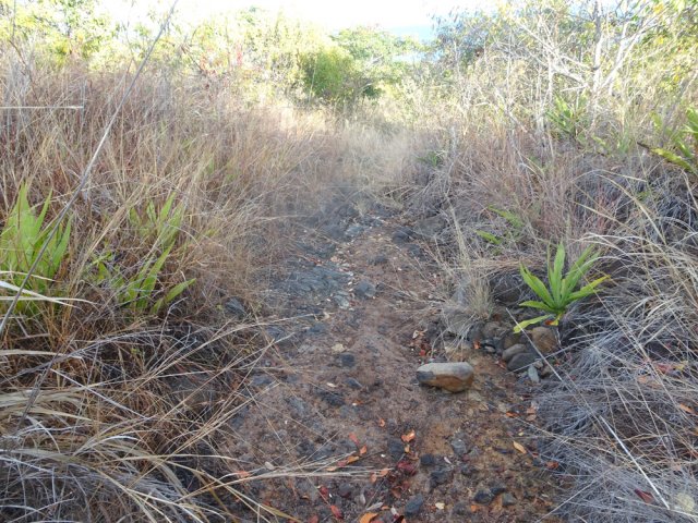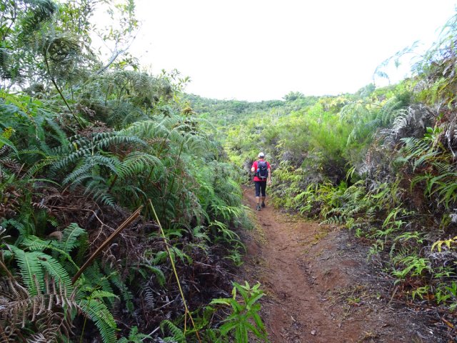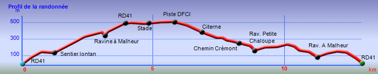 La randonnée débute au plus près du départ du Chemin des Anglais où les places sont souvent rares pour stationner. Préférer la Rue Raymond Mondon ou la Route de la Montagne. La montée est immédiate sans aucun échauffement sur une large piste pavée qui effectue de nombreux lacets sous les tamarins (Photo 1). Il faut passer une douzaine de ces lacets avant de parvenir au plateau pour emprunter de larges tronçons pavés de très bonne qualité (Photo 2). En se retournant, on bénéficie de beaux points de vue sur la ville de la Possession et celle du Port (Photo 3). Marcher 500 mètres avant de commencer les recherches du sentier remontant à la Ravine à Malheur. Aucun repère ne permet de s'assurer du bon endroit si ce n'est un départ de trace dans les herbes ou quelques vieilles rubalises brûlées par le soleil. Il faut un œil averti pour se convaincre du bon passage (Photo 4). Viser un tamarin des bas assez caractéristique car il est le seul touffu de la région (Photo 5). S'en approcher et le contourner par la droite, suivre les bribes de sentier recouvertes d'herbe ou la trace du GPS pour rejoindre en quelques minutes le début correct du sentier qui ressemble surtout à une petite ravine caillouteuse (Photo 6). A partir du moment où l'on rencontre cette trace, il n'y aura jamais plus à se poser de question car le passage est bien marqué à travers les chocas et les faux poivriers qui dépassent rarement les trois mètres de haut (Photo 7). On devine même par endroits de larges passages donnant à penser qu'il existait jadis une piste (Photo 8). Vers le village, les fougères se multiplient ainsi que les chocas (Photo 9). Les poules et pintades de l'élevage qu'on devine au bruit des volailles confirme la fin proche de la montée. On arrive à une grosse touffe de bambous. Le sentier se poursuit tout droit tandis qu’un autre part sur la gauche dans un pierrier. Emprunter ce dernier, traverser des zones très encombrées de chocas (Photo 10) et de grandes surfaces de fougères. Les curieux emprunteront le sentier partant sur la gauche pour rejoindre la Ravine à Malheur. Le sentier est acrobatique mais court. Il se termine à un bassin mais ne semble pas se poursuivre dans les falaises de l'autre rive (Photo 11). Après avoir fait demi-tour, reprendre le sentier principal qui se termine à un champ de maïs près d'une habitation. Le passage est libre à travers le lopin et rejoint immédiatement une piste herbeuse qui monte en direction de la RD41 (Photo 13). On assiste de loin au ballet des pétroliers et porte-containers qui attendent leur tour de passage au port (Photo 12). A la Route de la Montagne, prendre à gauche et marcher 250 mètres avant de partir à gauche sur le Chemin de la Petite Chaloupe en direction du terrain de sport et d'entraînement des motards (Photo 14). Passer entre le terrain de sport et la piste tout terrain (Photo 15). Repérer parmi les nombreux croisements, celui qui semble le plus naturel pour partir vers l'est. Il est large, bordé de fougères et presque plat (Photo 16). Il effectue une large boucle afin de se rapprocher de la vallée de la Grande Chaloupe (Photo 17) en traversant les zones de terres rouges si communes dans cette région de l'île (Photo 18). La piste DFCI est impossible à manquer malgré le nombre de circuits qui se recoupent partout. Après la première montée de début de boucle, d'abord aléatoire, puis celle plus sportive avant d'emprunter le dernier sentier cheminant à plat, cette descente s'avère une promenade de santé (Photo 19). La piste descend constamment en direction de l'océan qu'on a toujours sous les yeux tout comme les vallées de chaque côté (Photo 20). On peut emprunter des raccourcis entre les lacets mais ils demandent plus d'attention. Le plateau, sans doute cultivé jadis, est désormais totalement recouvert de plantes invasives (Photo 21). Partout, de chaque côté de la piste, sont plantées des espèces végétales afin de reboiser les collines. On frôle au passage quelques réserves d'eau protégées par des planches (Photo 22). A tout moment, on bénéficie sur la droite de beaux points de vue sur la Ravine de la Grande Chaloupe (Photo 23), plus impressionnants que ceux de l'autre côté de l'arête. De fréquents défrichages permettent aux nouvelles plantes de tenter leur chance mais on en rencontre, hélas, de nombreuses desséchées dans leur grillage de protection. Une dernière citerne se situe en fin de piste d'où l'on a une vue globale sur ce qui vient d'être parcouru (Photo 24). Elle est aussitôt remplacée par un sentier étroit mais facile à suivre dans les arbustes et hautes herbes (Photo 25). La marche est rapide et l'on entend de loin les rires et discussions des nombreux marcheurs empruntant le Chemin Crémont que l'on rejoint au plus près du point de vue sur la Grande Chaloupe (Photo 26). Après une petit coup d’œil sur ce hameau isolé et sur les travaux de la nouvelle route, prendre à gauche et partir en direction de la Possession. Le retour s'effectue en totalité sur ce classique de la région Nord en sautant de pierre en pierre. Certaines portions sont en très bon état, d'autres, plus herbeuses doivent être régulièrement tondues, d'autres hélas se déchaussent inexorablement (Photo 27). Il ne reste parfois que la bande de pierres plates au milieu de la chaussée (Photo 28). Quelques fortes descentes pour franchir des ravines sont suivies de rudes montées mais on parvient assez rapidement à la Possession, fin de cette boucle.