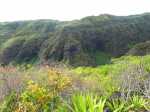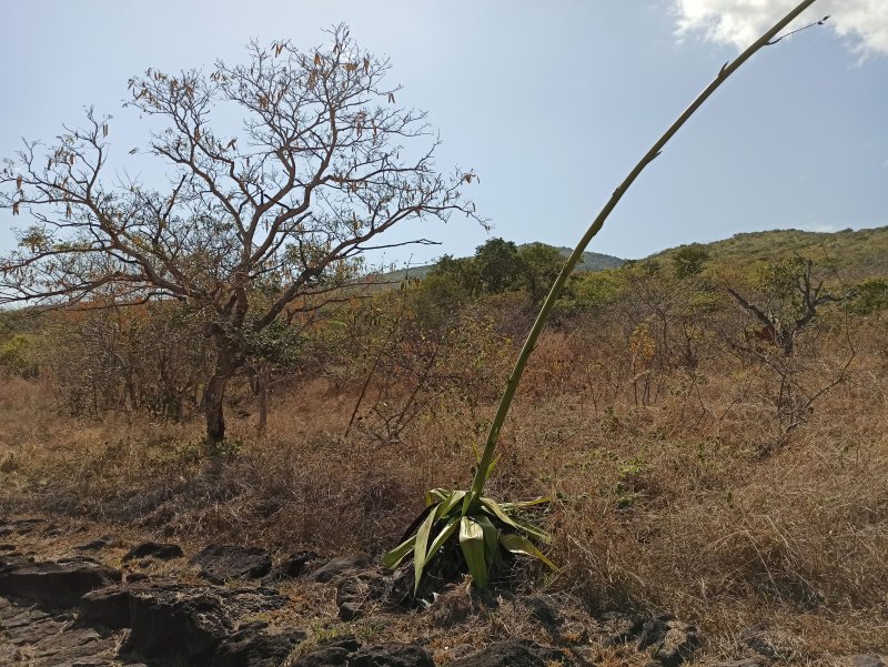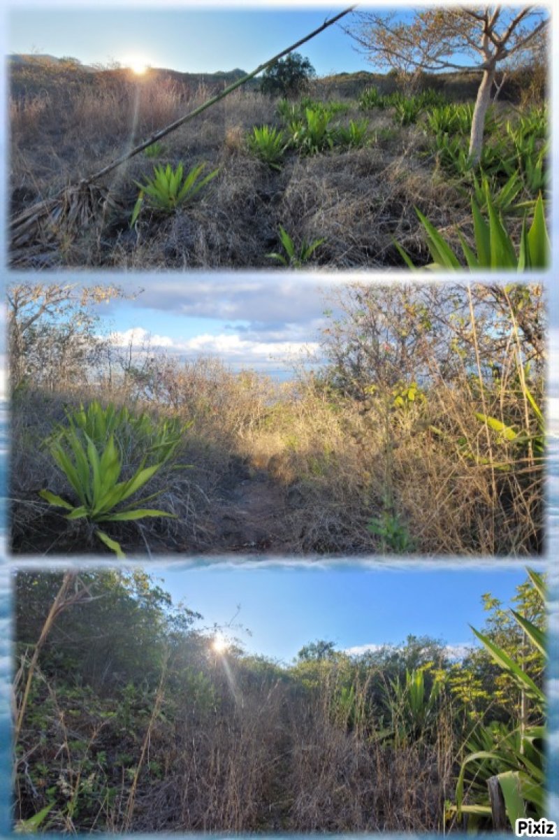 Le Piton de la Ravine à Malheur culmine à 450 m. Ses pentes, assez douces, sont recouvertes d'une végétation très pauvre, de chocas et de hautes herbes. Les bovins qui arpentaient ces friches ont laissé de nombreuses traces permettant de parcourir la savane sans difficulté. Depuis leur disparition, la nature a repris ses droits et, même si les sentiers de l'époque sont encore présents sur les cartes, la traversée est un peu aléatoire au début. Plus on monte vers le village de la Ravine à Malheur, plus ils sont nombreux et en assez bon état. Les chasseurs de guêpes ou les cueilleurs de baies roses y sont pour beaucoup. Plus près du Chemin Crémont, c'est l'inverse ; il faut avoir les yeux toujours au sol à chercher les anciennes traces recouvertes. Heureusement ce ne sont que 300 mètres qui sont difficiles à suivre mais qui ne rebuteront pas les randopitonneurs habitués à une recherche, à un suivi précis sur GPS et qui supportent sans se plaindre quelques griffures inévitables. On ne présente plus ce long Chemin Cremont qui comporte des portions telles qu'elles étaient au 19ème siècle mais aussi d'autres qui ont beaucoup souffert des années et des intempéries. Attention du côté de la Ravine à Malheur où une grande aire d'entrainement de motocross impose d'éviter les pistes dangereuses, surtout les jours d'entraînement, facilement reconnaissables au bruit des moteurs. Le sentier proposé est le plus facile, le plus calme et comporte autant de traces de semelles que de pneus. Enfin, la piste DFCI (Défense des Forêts Contre l'Incendie) est un pur plaisir car elle se descend sans effort en offrant de magnifiques panoramas sur l'océan et les deux ravines de la Chaloupe qui l'encadrent. Des espèces sont en voie de replantation mais l'aridité du sol et la faible pluviométrie rend la tâche quasi impossible malgré les soins constants apportés par les agents de l'ONF.