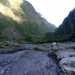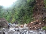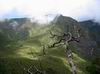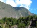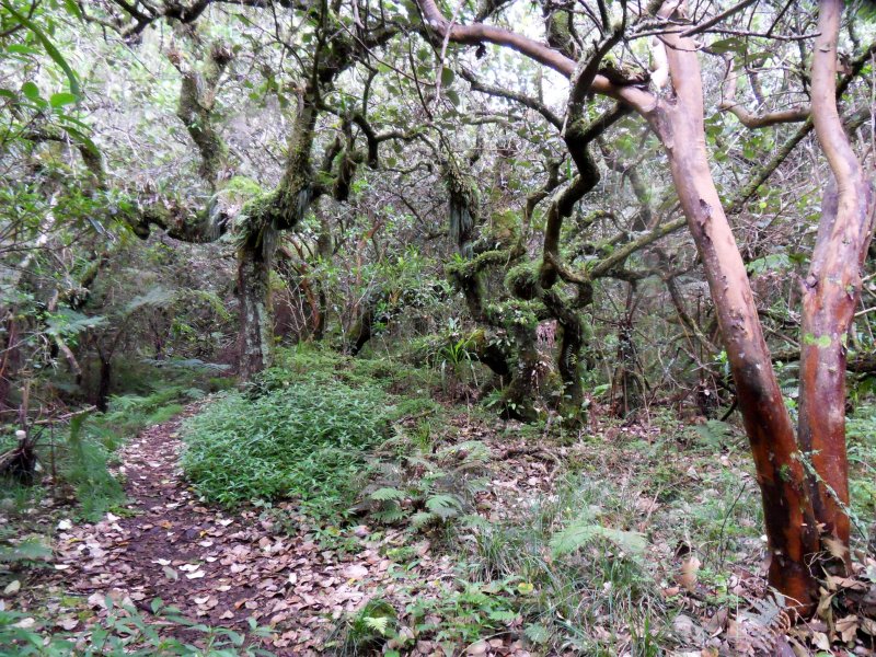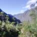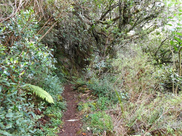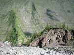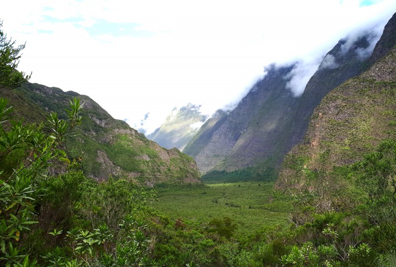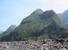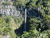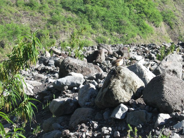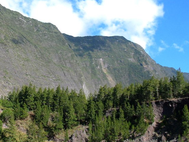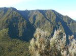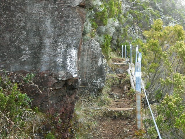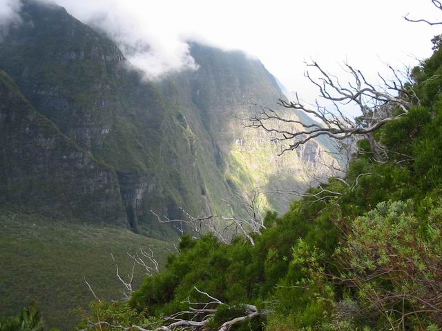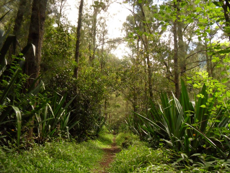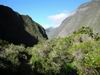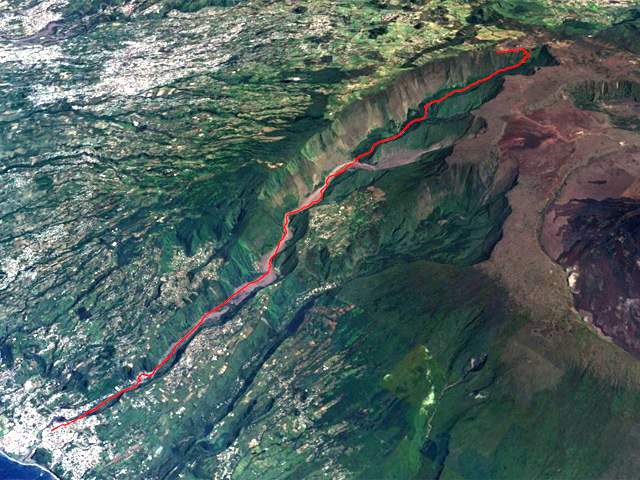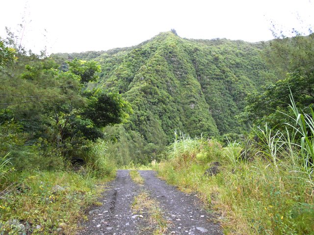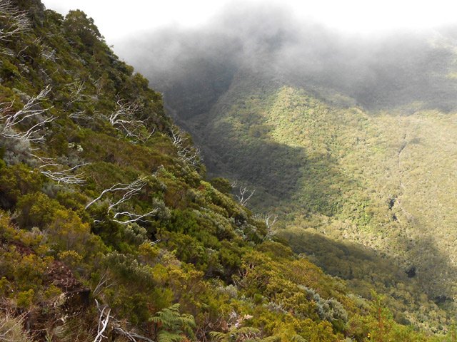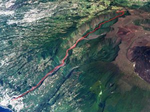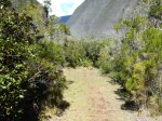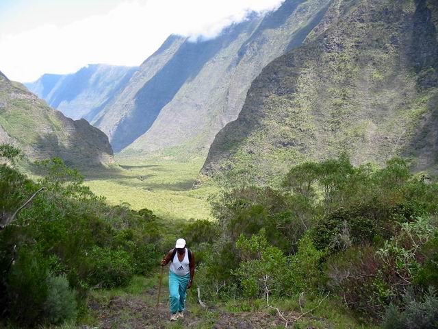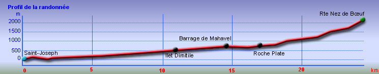 Le sentier débute à St-Joseph en se rendant vers les concasseurs du fond de la Rivière des Remparts. L'itinéraire le plus fréquenté rejoint ces concasseurs par la route utilisée par les dizaines de camions qui la sillonnent chaque jour mais la meilleure solution consiste à rejoindre la rivière à sec en marchant sur la piste de l'Ilet Delbon. Suivre les indications du § itinéraire pour se rendre au départ du premier sentier en suivant quelques rues de la ville. Le sentier descend et rejoint une piste qui traverse un immense verger de letchis et manguiers. Ces deux kilomètres dans la verdure et en bordure de rempart sont beaucoup plus agréables que l'itinéraire qui emprunte le lit de la rivière. On longe un immense verger de letchis dont certains ont un âge respectable (Photo 1). La piste est large et en pente très douce jusqu'au lit de la rivière (Photo 3). On peut traverser la rivière des Remparts constituée de larges plaques de lave sculptées par les eaux, souvent à sec, en amont de beaux bassins à repérer pour les saisons pluvieuses. Il est également possible de remonter dans un ancien bras plus verdoyant et moins bruyant (Photo 5). La piste n'est qu'à quelques dizaines de mètres et on la rejoint très vite (Photo 6). Prendre à droite et rejoindre en marchant au plus facile la large piste poussiéreuse qu'on ne quittera qu'à Roche Plate. La vallée est large et peu encaissée (Photo 7). Les cinq premiers kilomètres dans la vallée ne présentent aucun intérêt tant les camions de transport de pierre et le bruit des excavateurs sont désagréables. C'est le royaume des galets même si les excavations sont constantes (Photo 8). Il est d'ailleurs préférable de choisir un dimanche pour cette sortie car il y a moins de bruit mais surtout moins de poussière. Les paysages eux-mêmes ne sont pas extraordinaires excepté certains pitons qui longent le lit comme la Cap Edouard (Photo 10). La montée est faible mais longue et constante jusqu'au Bras de Mahavel. Quand on marche à la verticale de Grand Coude, on reconnait des passages déjà fréquentés qui montent vers Jean Petit, vers la Petite Plaine ou vers Grand Coude aux alentours de l'Îlet Dimitile. La vallée est toujours très large et la piste épouse à peu près ses méandres. C'est près de 15 kilomètres après le départ qu'on rencontre la vallée de Mahavel et ses cailloux acérés, pas encore usés depuis le grand effondrement. A partir de ce point, on peut rejoindre Roche Plate par plusieurs sentiers ou chemins. La solution la plus rapide consiste à escalader le Barrage de Mahavel, seul vestige encore visible de la catastrophe de 1965 (Photo 11). Les curieux remonteront la rivière sur une centaine de mètres pour apprécier l'épaisseur de terre et de roche qui avaient créé à l'époque un barrage qui inquiéta la population. L'érosion effectue lentement son œuvre (Photo 12). Un sentier permet de remonter de quelques mètres et rejoindre le bois de filaos qui sépare des premières habitations de Roche Plate. Il présente l'avantage de procurer un peu de fraîcheur après ces kilomètres sous le soleil et sur les gros galets du fond de la Rivière des Remparts. Hélas, les 4x4 creusent le sol et la pluie remplit les ornières créant de longues portions boueuses qu'il faut contourner en marchant entre les arbres. Prendre son temps pour traverser ce village isolé et pourquoi ne pas prendre un verre à l'un des gîtes (Photo 13)? Passé Roche Plate, le sentier devient de plus en plus raide et le sol de plus en plus dur. On suit tout d'abord le sentier bordé de belles murailles de pierre sèche avant de trouver la bifurcation vers le Plateau des Sources (Photo 14). Prendre à gauche le sentier officiel, mais si on n'a jamais visité cette région, ne pas hésiter à prendre à droite, surtout si le sentier est nettoyé ; le détour ne fera perdre que 15 minutes. On passe tout d'abord des ruines (Photo 15) avant de se rapprocher de la ravine déchiquetée du Bras Caron pour terminer au toboggan et au bassin de Fond de Sonje pour une belle occasion de se rafraîchir les pieds. Pas le temps de pêcher la truite même si on en aperçoit partout car il reste encore une longue montée. Reprendre alors en rive droite du Bras Caron et rejoindre en moins de 200 mètres le sentier officiel de la Rivière des Remparts. La montée sera un peu raide jusqu'à la Cascade Davedinde, à sec, et son arche naturelle difficile d'accès (Photo 16). A partir de ce canyon étroit, le terrain s'assagit mais monte tout de même. La pente s'accentue graduellement jusqu'à l'Îlet Citron Galet puis grimpe de plus en plus dans les goyaviers et sur des plaques de basalte glissant. Quelques rares portions plates ne suffisent pas à reposer les jambes (Photo 17). Cette région renferme de très originales curiosités qui doivent faire l'objet d'une randonnée spécifique. Les falaises deviennent de plus en plus verticales en s'approchant du Nez de Bœuf. Des cascades coulent de ces remparts mais s'atteignent difficilement (Photo20). On s'approche ainsi du rempart dans une belle forêt de bois de couleurs humide, point de départ de la magnifique randonnée souterraine. Le sentier qui remonte rejoindre la Route Forestière du Volcan est proche et représente la vraie difficulté du trajet. On grimpe sur un sentier étroit (Photo 21), comportant parfois de grandes marches (Photo 24), caillouteux ou boueux dans les brandes, et où de nombreux lacets évitent les trop fortes pentes. Profiter des points de vue pour admirer la vallée et voir le trajet déjà effectué (Photo 25). Après un dernier coup de collier, on arrive enfin à la route forestière du Volcan où peut fort bien attendre un véhicule s'il a été programmé. Le Nez de Bœuf n'est qu'à quelques centaines de mètres en suivant le rempart d'où l'on aperçoit très bien Roche Plate et le sentier parcouru (Photo 28). C'est un peu plus loin, le long de cett