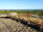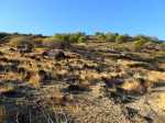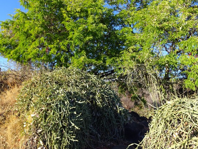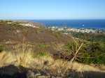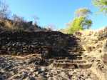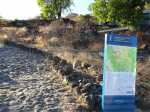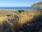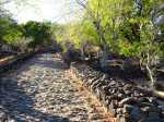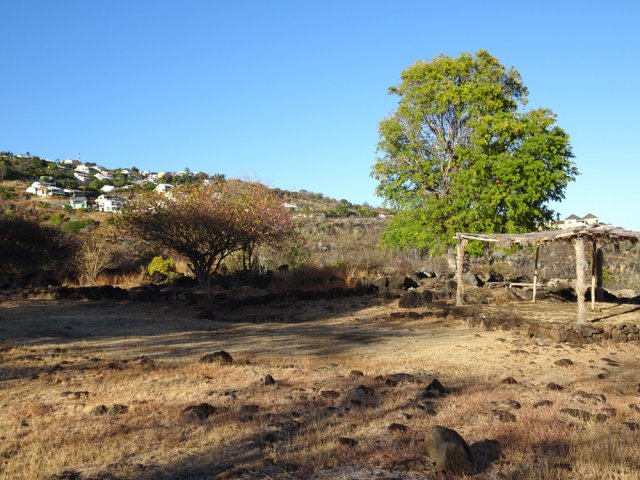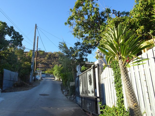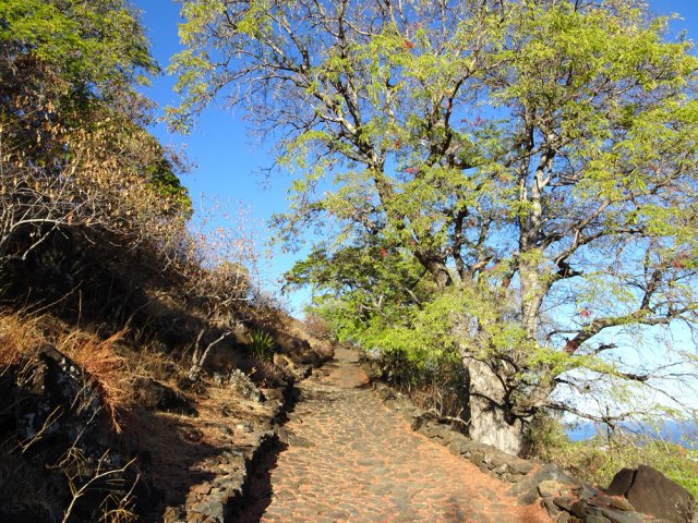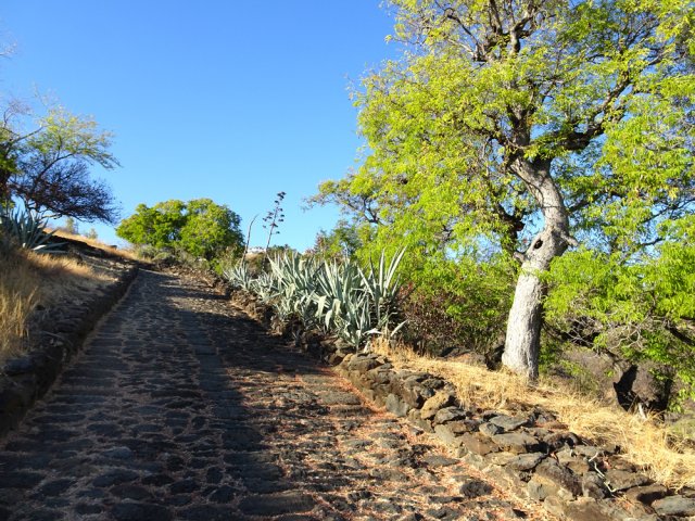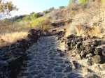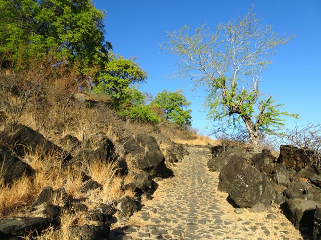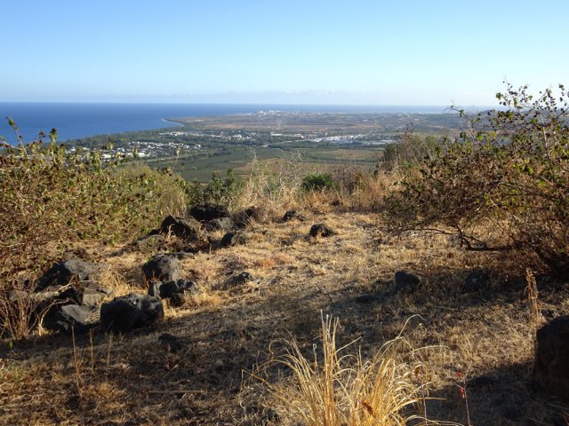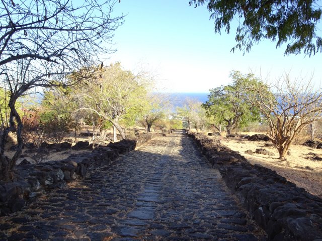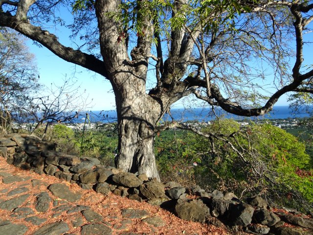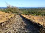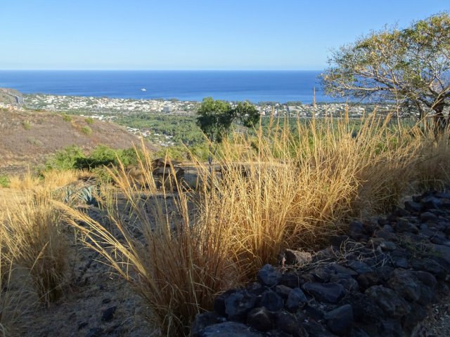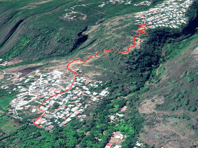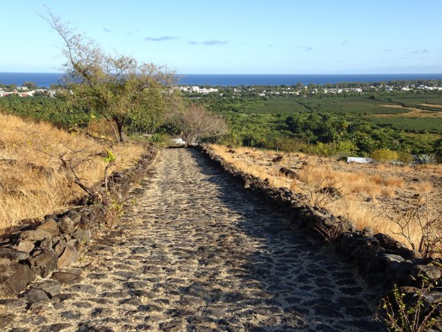 La courte randonnée débute à la passerelle de la Ravine Divon où il est possible de garer plus facilement le véhicule sous les manguiers que dans le village de Bouillon. On emprunte une très courte portion de route du Tour des Roches puis on bifurque à droite pour traverser le petit village de Bouillon sur une route bétonnée étroite, entre des cases modestes mais fleuries (Photo 1). La pente est déjà forte et participe à l'échauffement. Des biquettes donnent des odeurs particulières lorsqu'on frôle leur enclos. On les retrouvera d'ailleurs très souvent en train de brouter le long du chemin pavé si elles ne sont pas occupées dans le fond de la Ravine Divon. Le début du chemin est très facile à trouver car il prolonge la rue en partant vers l'Est. Un panneau très intéressant donne une idée de la trace (Photo 3) mais également des explications sur ces pistes et sentiers qui sillonnaient la région au 19ème siècle (Photo 4). La savane qui occupe les pentes est jaunie par le soleil. Seules quelques taches vertes de tamarins diminuent l'impression de brûlé (Photo 5). La piste est bordée d'un muret de chaque côté qui délimite la route de l'époque (Photo 6). On remarque également une bande centrale constituée de pierres plates plus larges que les autres servant probablement au passage des piétons (Photo 7). La pente est faible au départ mais, plus on monte et les plus les panoramas sur les zones marécageuse de l'Etang Saint-Paul s'agrandissent (Photo 8). Des parties plus étroites devaient se passer plus difficilement par les charrettes (Photo 9). A d'autres endroits, les grosses roches tombées depuis l'abandon de la voie ont été laissés par les équipes de remise en état (Photo 10). Dix minutes après le départ, on domine la région de Saint-Paul et l'océan (Photo 11). Quelques tamarins procurent une ombre salutaire dans cette région surchauffée tout au long de l'année (Photo 12). Certains ont atteint des tailles respectables au regard de la pauvreté du sol et du manque d'eau (Photo 13). Des raccourcis évitent parfois d'employer les lacets de la piste (Photo 14). La pente est constante et jamais raide. Sur la droite, on domine la très profonde ravine Divon surmontée par les villages de Bois Rouge et Crève Cœur (Photo 15). On distingue également la ville de Saint-Paul, qui, d'ici, semble plus verdoyante qu'elle n'est en réalité. Quand la pente est plus forte, la piste effectue des lacets courts mais raides. Le chemin empierré est très bien entretenu sur toute sa longueur (Photo 16). En s'approchant de Bellemène, on remarque, de chaque côté du chemin pavé, une zone dégagée qui a été aménagée pour s'y reposer (Photo 18). La zone est un peu plus boisée qu'ailleurs et il est plus facile d'y trouver de l'ombre (Photo 19). Un robinet salutaire peut permettre de se rafraichir au passage (Photo 20). Des aménagements en bambou ont souffert du vent et des intempéries et la zone ne semble pas très fréquentée (Photo 21). Des petits panneaux sont apposés par endroits pour donner le nom et des indications sur quelques arbres ou arbustes de cette région désertique (Photo 22). Depuis l'aire, on domine toute la plaine et la ville de Saint-Paul (Photo 24 et 26). Une dernière pente amène jusqu'aux premières maisons de Bellemène où l'on retrouve un nouveau panneau d'information (Photo 28). Une fois à la fin du chemin pavé, rebrousser chemin par le même itinéraire pour retrouver le hameau de Bouillon à moins de poursuivre vers le sentier de Macabit. Dans ce cas, prévoir encore deux bonnes heures et beaucoup de boisson en période chaude.