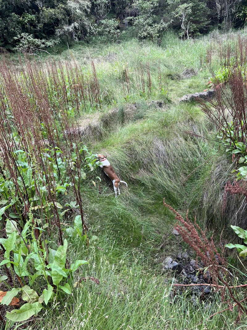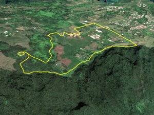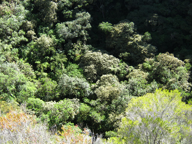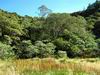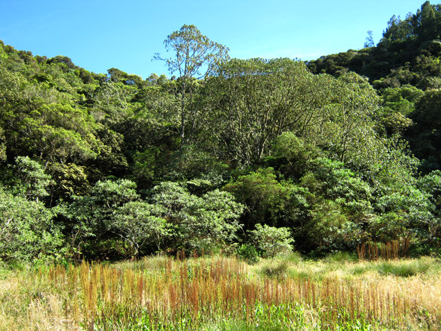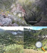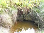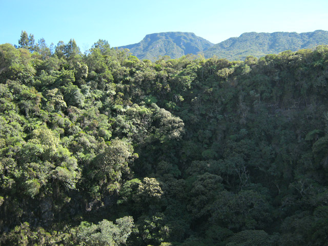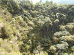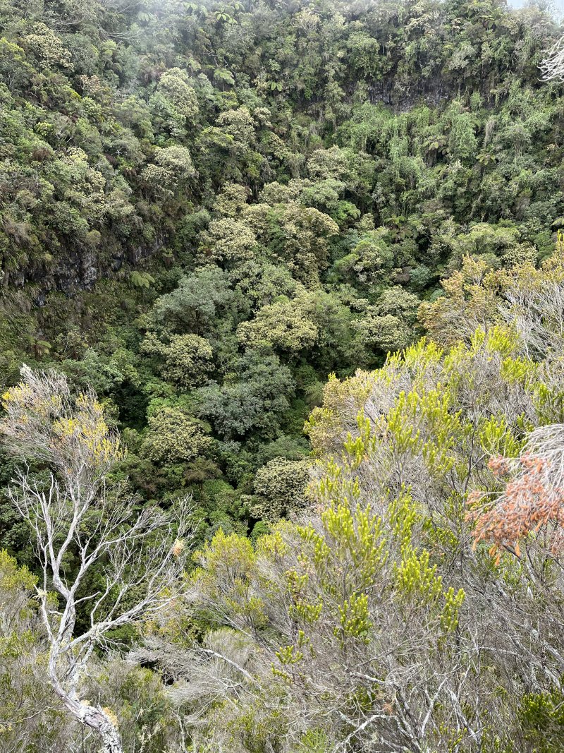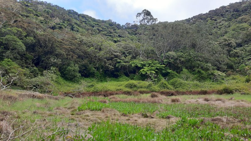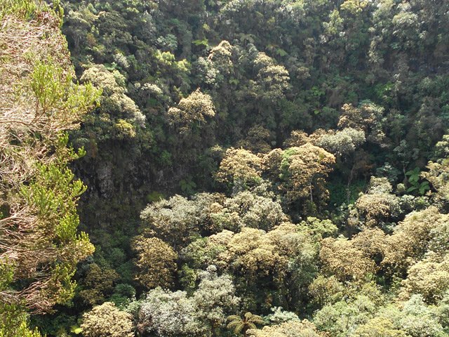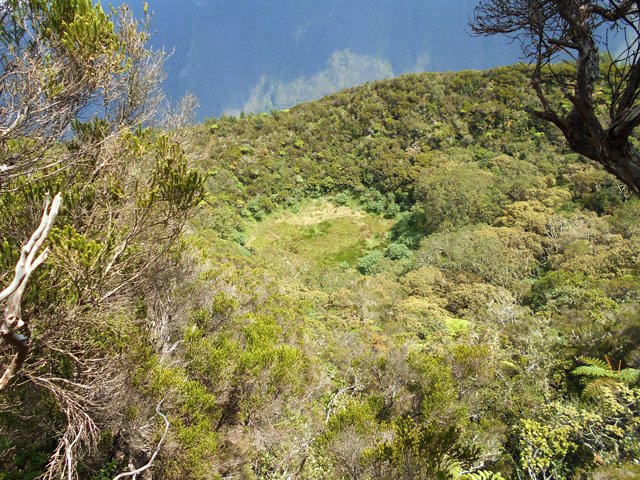 Deuxième maar Pour éviter tout problème avec le propriétaire des prairies, éviter ce circuit tant qu'un sentier officiel n'aura pas été tracé pour nous permettre de visiter ce profond cratère appartenant avant tout à l'humanité. Il est situé à une centaine de mètres à l'est. Le rejoindre est plus difficile car le sentier, moins utilisé depuis la demande du propriétaire, a tendance à se boucher par la végétation. C'est dommage qu'il n'y ait pas un trajet officiel car ce maar est le plus impressionnant. On devine une sente qui prolonge le sentier au moment ou l'on pense que c'est un cul de sac. Si on suit, on traverse une courte zone de végétation comportant fanjans et acacias noirs pour se retrouver dans une prairie (photo 11). De là, on profite de magnifiques panoramas sur le plateau de Grand Coude (photo 12). Le mieux consiste à se rapprocher de la lisière à gauche et la suivre jusqu'au bord du cratère très reconnaissable de loin à sa grosse touffe d'hortensias et à la couronne d'arbres entourant le trou (photo 15). Ce cratère circulaire d'une soixantaine de mètres de diamètre pour autant de profondeur est impressionnant (photo 16). Le fond et les flancs sont totalement recouverts de bois de couleurs sans que les invasives les aient encore atteints (photo 17). On peut se rapprocher du petit promontoire rocheux situé entre les deux maars, ce qui permet de voir de haut celui visité avant de monter (photo 20). En y regardant bien, on voit même le puits dans la clairière (photo 21). Attention cependant pour s'y rendre car le terrain est glissant, le rocher peut donner le vertige et une ruche a même élu domicile dans une souche proche.
