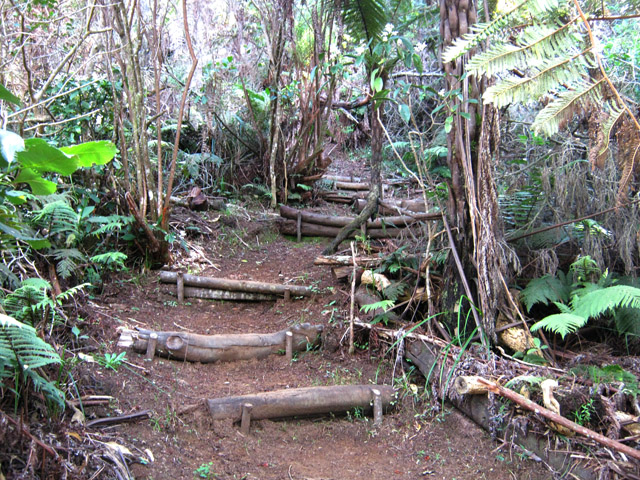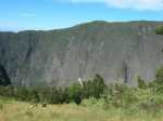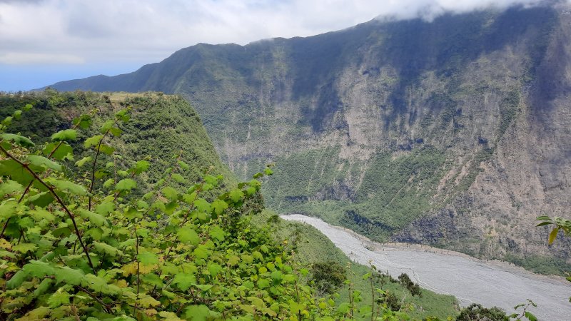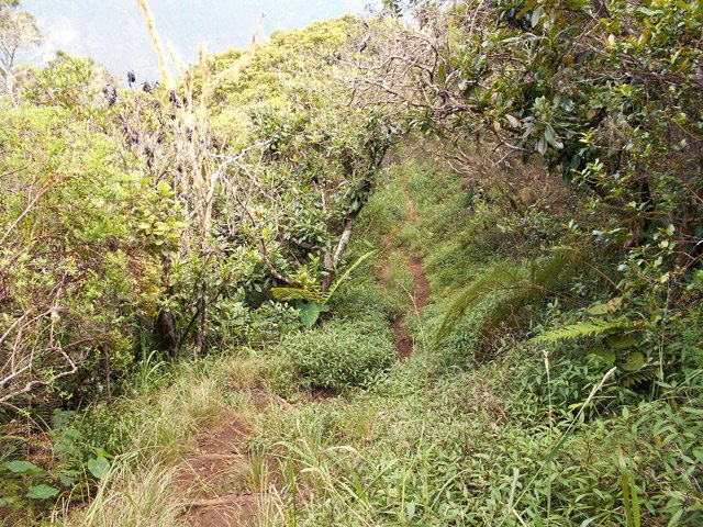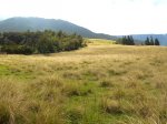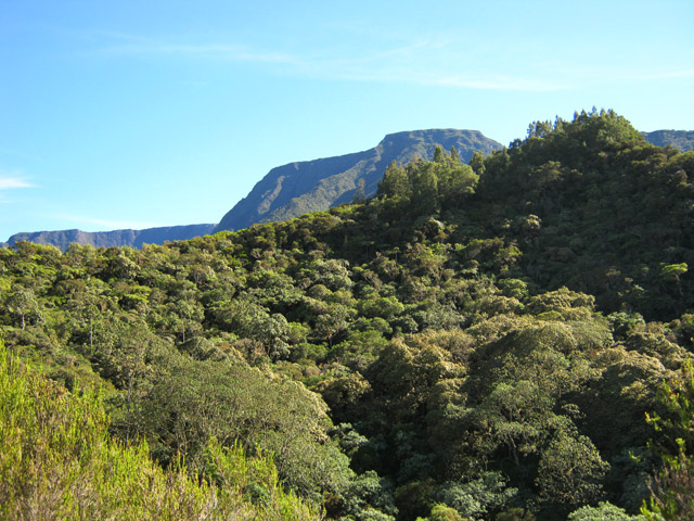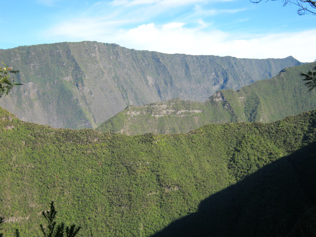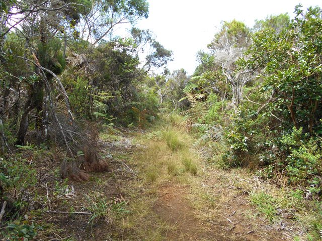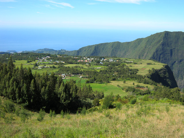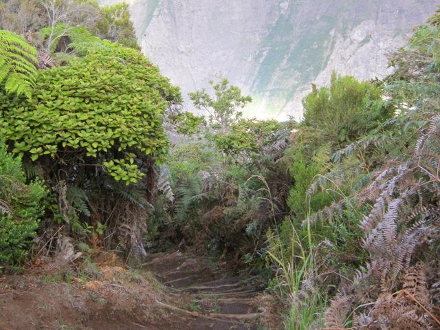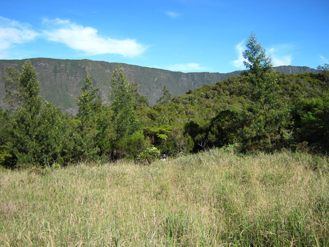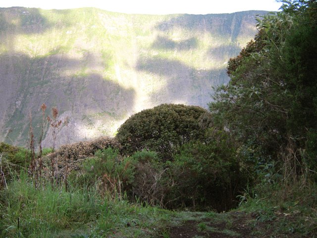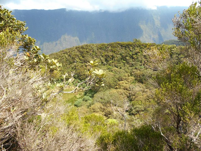 La randonnée débute au parking situé une centaine de mètres plus haut que l'église du village. Le sentier passe entre les prairies en direction de la vallée de la Rivière des Remparts. On rencontre un sentier qui longe le bord. Partir à droite en direction du Morne Langevin. Il est tout d'abord envahi de végétation mais on passe sans problème. Dans les prairies, l'herbe a tendance à cacher le cheminement mais il suffit de marcher toujours sur la même trace et de suivre le rempart. Certaines parties sont nettes malgré le manque de nettoyage (photo 1).Plus haut, des marches facilitent la montée, parfois forte entre fougères et bois de couleurs (photo 2). A l'approche des Trous de Cissia, on a quelques vues sur la vallée du Bras de Dimitile, la Rivière des Remparts et le Cap Edouard (photo 3). Après une dernière pente du sentier principal (photo 4), on parvient à un croisement avec le sentier des Trous de Cissia. Le sentier, plus étroit que le précédent est envahi de jouvences mais relativement facile à suivre malgré son peu de fréquentation (photo 5). Après un petit raidillon et une pente douce, on rejoint rapidement le Grand Trou sur un parcours très agréable (photo 6). Un sentier de quelques lacets permet de s'approcher du bord. On peut en apprécier la taille tout en profitant de vues sur le Morne Langevin (photo 7). On rejoint en quelques mètres le fond assez plat du maar (photo 8). Quelques traces éparses permettent de se promener dans les grandes herbes qui tapissent le fond. Il est très difficile de pénétrer dans la forêt. On s'approche d'une cavité et d'une petite murette qui l'entoure au milieu des herbes (photo 9). C'est un puits créé par l'homme et qui a dû servir souvent à abreuver les bêtes. Il conserve toujours une eau qui n'est pas du tout conseillée à l'homme (photo 10).