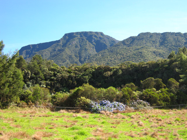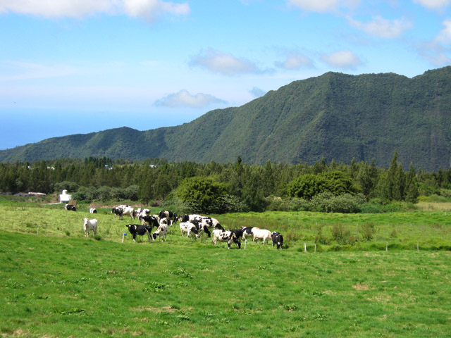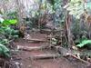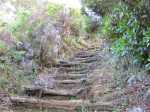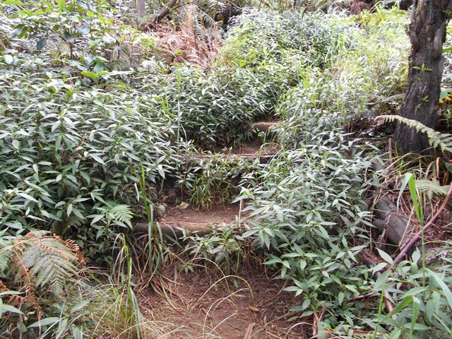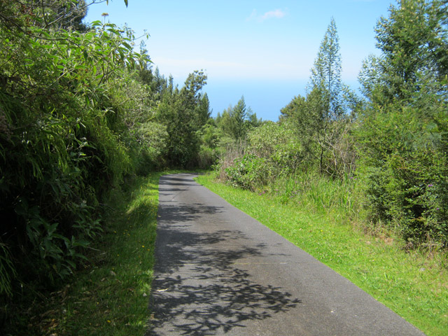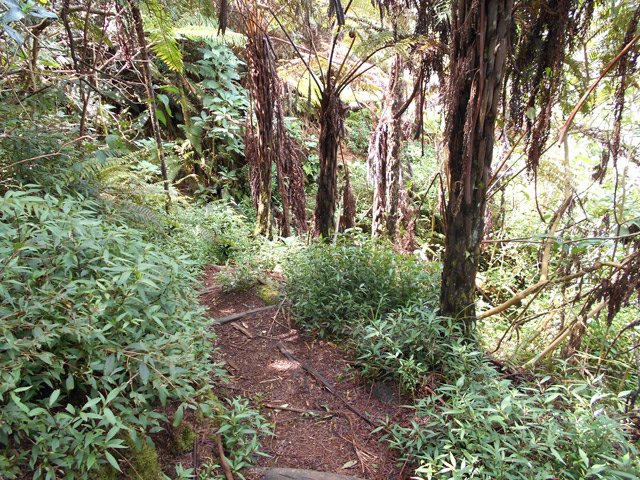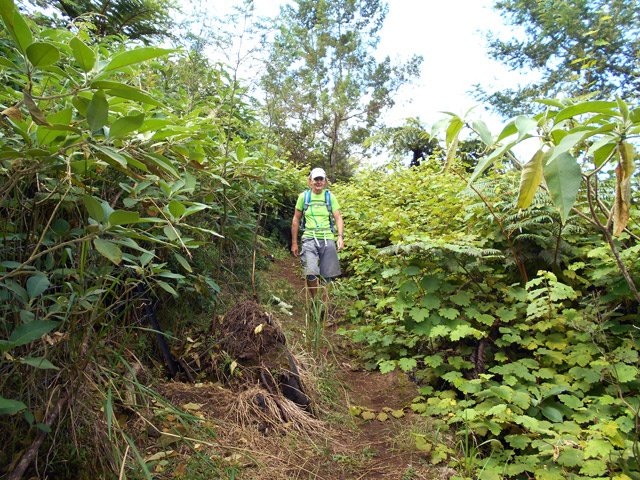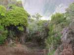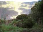 Retour : Rejoindre le premier cratère puis reprendre le sentier jusqu'à une bifurcation. Partir sur la gauche et traverser la zone forestière sur un sentier qui varie en fonction du relief. Il débute par des marches (photo 22), se poursuit sur des pentes parfois fortes dans les jouvences (photo 23) pour se terminer dans les vignes marronnes (photo 25). On retrouve le très agréable Chemin Safer (Chemin des Géraniums sur certaines cartes) bordé d'une végétation touffue et en pente légère vers Grand Coude (photo 26). Avant un réservoir à 1250 m d'altitude, on peut emprunter une piste qui ramène au sentier emprunté dans la montée mais il vaut mieux poursuivre sur le goudron. Plus bas, ce sont les prairies et leurs troupeaux qui bordent cette route (photo 27). Poursuivre en descente jusqu'au Chemin Théophile Gauthier et partir plein est jusqu'au parking du début.