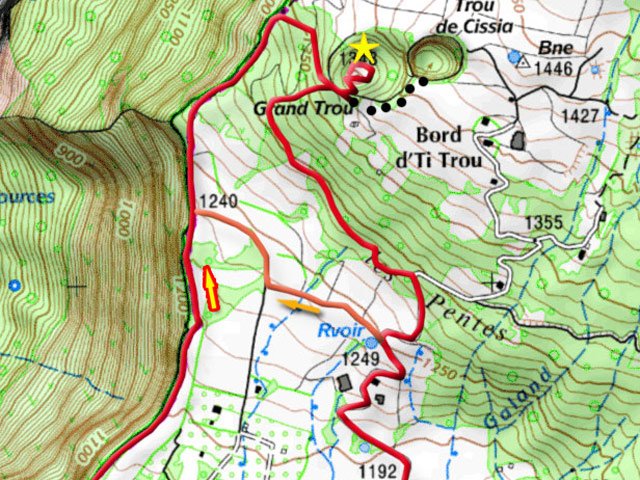 Se rendre à Grand Coude en partant de Saint-Joseph, traverser le village et se garer au parking après l'église - Débuter la randonnée en partant vers le rempart de la Rivière des Remparts et en bifurquant à droite en direction du Morne Langevin - Après 1500 m de marche, un sentier part vers la droite - Suivre ce sentier jusqu'au premier trou dont on atteint le fond par un petit sentier - Après une visite du trou central ou de la forêt de bois de couleurs, reprendre le chemin inverse jusqu'au bord du Grand Trou - Repérer dans la végétation le départ d'un sentier très discret qu'on suit sur 10 mètres avant de bifurquer à gauche sur un autre sentier tout aussi discret - Traverser la végétation sur 20 mètres pour atteindre le bord de la prairie - Grimper dans la prairie jusqu'au départ des parapentistes et repérer devant le Trou de Cissia bien indiqué par une grosse touffe d'hortensias - Reprendre la prairie et rejoindre Grand Trou par le même itinéraire - Retrouver le sentier pris à l'aller sur quelques mètres puis tourner immédiatement à gauche sur un sentier qui descend en direction de Grand Coude puis obliquer sud-est pour rejoindre plus loin le Chemin des Géraniums - Suivre le Chemin des Géraniums jusqu'aux maisons et prendre à droite jusqu'au véhicule. Si les prairies sont coupées, suivre le circuit orange sur la carte ci-dessus pour le retour à partir du Chemin des Géraniums.