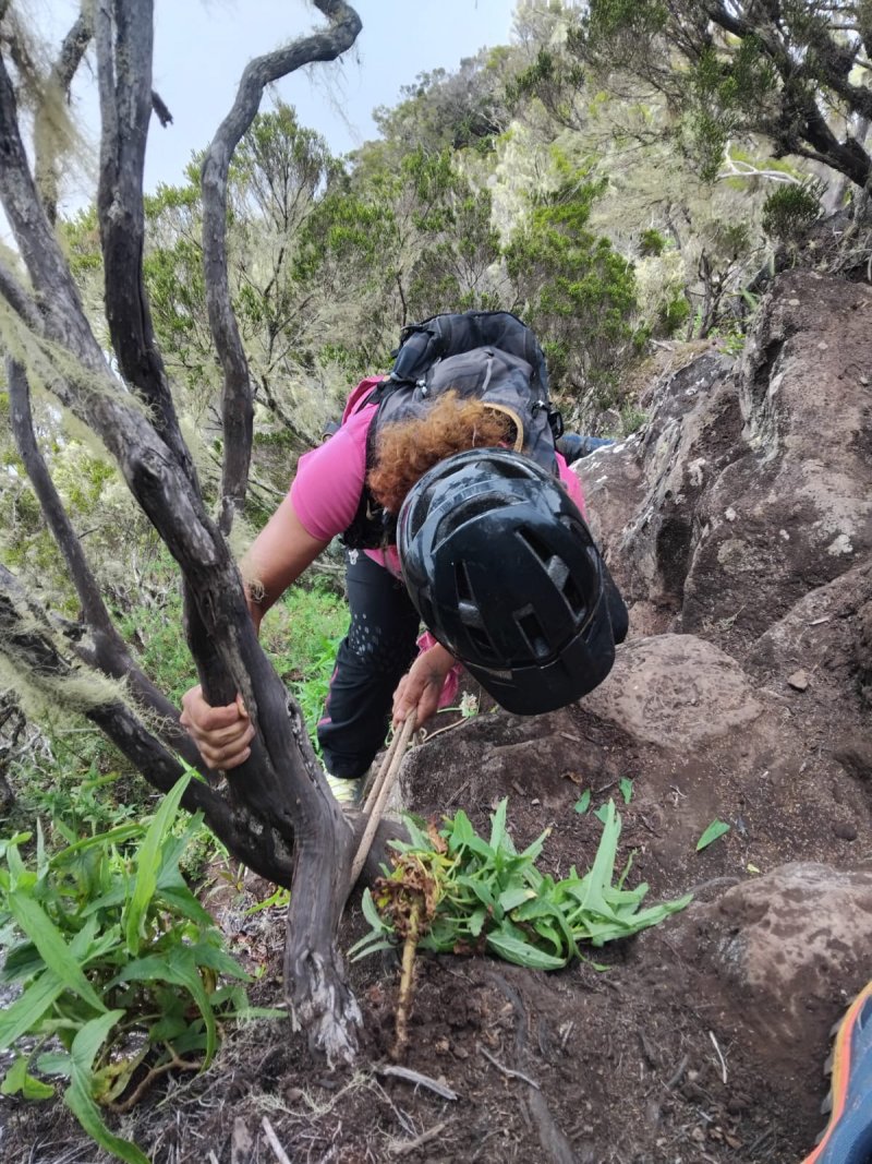 La randonnée commence à Grand Ilet par la piste qui débute à gauche, une centaine de mètres avant la Ravine Roche à Jacquot en direction de la Mare à Martin. C'est une agréable balade parmi les treilles de chouchous, les bambous sur un large passage bordé de jouvences, longoses et vignes marronnes. On traverse des ravines et des bois de filaos jusqu'aux premiers lacets en direction de la Fenêtre de Grand Îlet (Photo 1). A l'horizon, on distingue très bien le parcours à effectuer en repérant tout d'abord la Fenêtre puis la rude montée vers le sommet de Cimendef qui, d'ici, semble très difficile car étroite. Compter une petite heure pour atteindre la Fenêtre à partir des filaos par une pente assez sérieuse. Les difficultés sont rares, quelques portions plates entre les lacets permettent de souffler un peu (Photo 2). Les goyaviers, jouvences et longoses bordent le sentier. On bénéficie tout au long de la montée de larges panoramas sur les villages vers la Mare à Martin ou sur le Piton Plaine des Fougères. Vers le cœur du cirque c'est le Piton d'Anchain qui domine les autres villages (Photo 3). Enfin, de l'autre côté, on a l'ensemble du Gros Morne qu'on verra dans son ensemble en montant le Cimendef. Après une remontée vers le nord, le sentier revient plein sud et se termine à la Fenêtre près d'un petit oratoire. La barrière du belvédère a disparu mais le point de vue est tout de même dégagé. Après le régal des yeux sur le Cirque de Salazie depuis le belvédère, il faut se préparer à la deuxième partie qui n'a plus rien à voir avec la montée précédente. C'est le moment de faire demi-tour si la vue de la première pente fait déjà flageoler les jambes (Photo 4). Le Cimendef, qui ressemble de loin à une pyramide, est en réalité une succession de pentes entrecoupée de courts faux plats qui ne suffiront jamais à reposer les jambes. On remarque surtout l'étroitesse de l'arête et de hautes barres rocheuses laissant penser à de futures escalades. Entamer une forte descente en direction du col qu'on devine plein sud (Photo 5). Ne pas prendre la trace bien visible créée par des erreurs de départ se finissant dangereusement sur des à-pics verticaux à moins de 20 mètres. Prendre le sentier, plus discret, près d'un rocher au bord du vide et descendre d'une cinquantaine de mètres sur un parcours humide, étroit, glissant et surtout rocheux (Photo 6). Au col, le terrain est plat au milieu d'une végétation assez dense. Repérer pour une prochaine expédition sportive, le discret départ du sentier vers Deux Bras par la descente du Bras de Sainte-Suzanne. A partir du col qui marque la séparation entre le Cimendef et le massif de la Roche Ecrite, la remontée débute entre les troncs et sur les racines (Photo 7). Attaquer ensuite les 700 mètres qui séparent du sommet sur un sentier qui restera toujours visible même sur les passages rocheux ou très étroits. Les premières barres rocheuses font leur apparition tout comme les premières escalades. L'arête étant souvent étroite, on profite ainsi de superbes panoramas sur le nord du Cirque de Salazie jusqu'au Piton Bémassoune (Photo 9). De l'autre côté, beaucoup plus impressionnante, la vallée du Bras de Sainte-Suzanne peut décourager les volontaires à entreprendre sa descente (Photo 10). Les courtes escalades s'enchaînent et s'effectuent facilement si l'on prend bien soin de saisir un rocher stable (Photo 11). Faire constamment attention à ces prises en évitant les roches branlantes. Pourtant, ces passages sont moins impressionnants qu'on a pu l'imaginer en regardant depuis Grand Îlet ou depuis la Fenêtre. Attention de ne pas blesser un de ces geckos verts des Hauts qui se dorent paisiblement au soleil et bougent à peine au passage du grimpeur (Photo 12). On retrouve la végétation et le paysage qu'on ne quittera plus jusqu'au sommet. Les branles verts ou gris vont constituer l'essentiel de la verdure rencontrée (Photo 13). Les vues sur Grand Îlet sont nombreuses et certaines peuvent être vertigineuses (Photo 14). On atteint un premier replat qui permet de se rendre compte que le plus difficile reste à effectuer. La pente de l'arête est vraiment impressionnante et il n'est pas encore trop tard pour faire demi-tour (Photo 15). Le passage du petit col séparant les deux pitons est étroit, vertigineux et peut inquiéter sur quelques mètres (Photo 16). L'ascension reprend dans les mêmes conditions sur des roches de plus en plus nombreuses (Photo 17). Presque tous les passages sont facilités par des racines ou des branches moussues de branles bien implantés dans le sol (Photo 18). Les très rares passages plus plats sont très bien marqués par les multiples passages de volontaires pour sensations fortes (Photo 19). Les barbes de Jupiter se multiplient à partir de la mi-pente même si le vent cherche constamment à les décrocher (Photo 20). Les portions rocheuses sans végétation se passent à quatre pattes, meilleur moyen d'assurer la stabilité (Photo 21). Par endroits, la végétation doit bénéficier plus qu'ailleurs d'eau ou de bonne terre car elle devient tout d'un coup plus abondante (Photo 22). Il faut même se frayer un chemin entre les branches et les troncs quand ils sont plus touffus (Photo 26). Les cordes aidant au franchissement de certains passages ont été enlevées et l'attention doit redoubler (Photo 24). Mais ce sont surtout les passages étroits où le sac à dos peut accrocher une roche qu'il faut redoubler de vigilance afin de ne pas être déstabilisé (Photo 25). Repérer sur la gauche le départ du sentier en direction du Piton Bémale et de la RF du Haut Mafate, itinéraire laissé aux alpinistes munis de longues cordes. L'arête, parfois très étroite, se passe aisément en raison des plantes qui protègent du vide (Photo 26). Compter deux heures d'un rythme normal de deux randonneurs pour atteindre le sommet recouvert de branles rabo