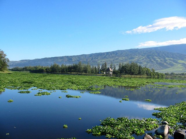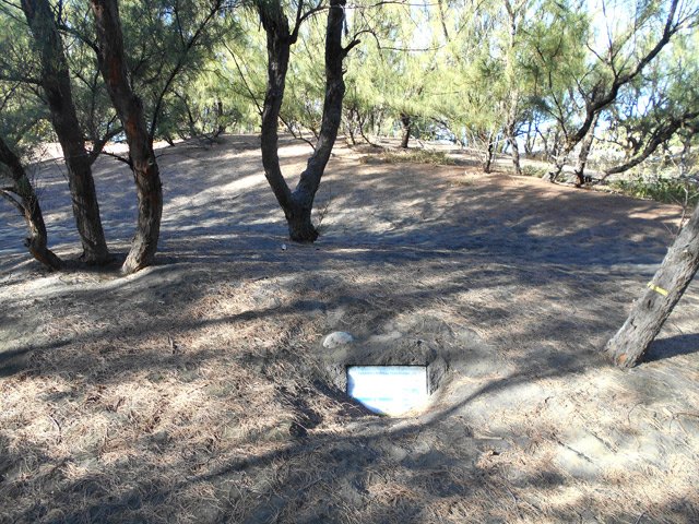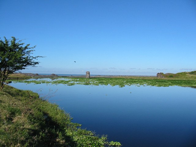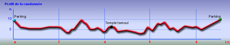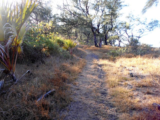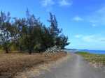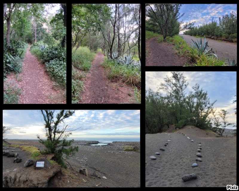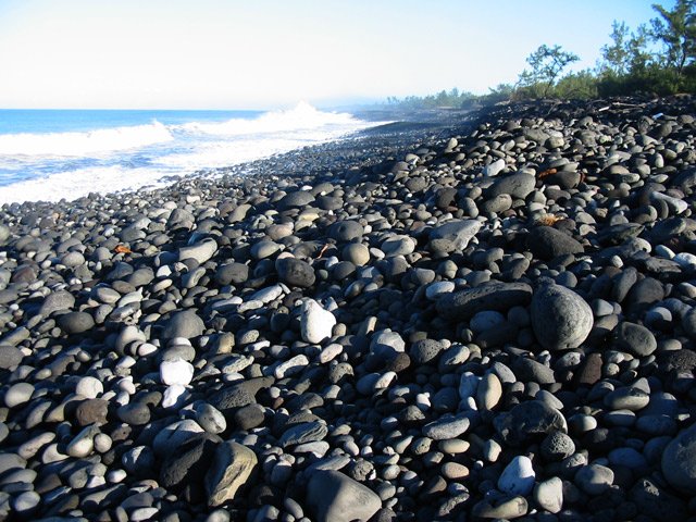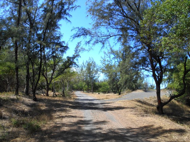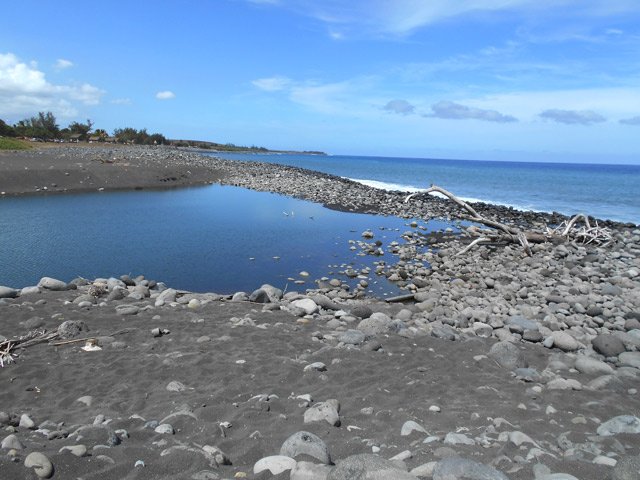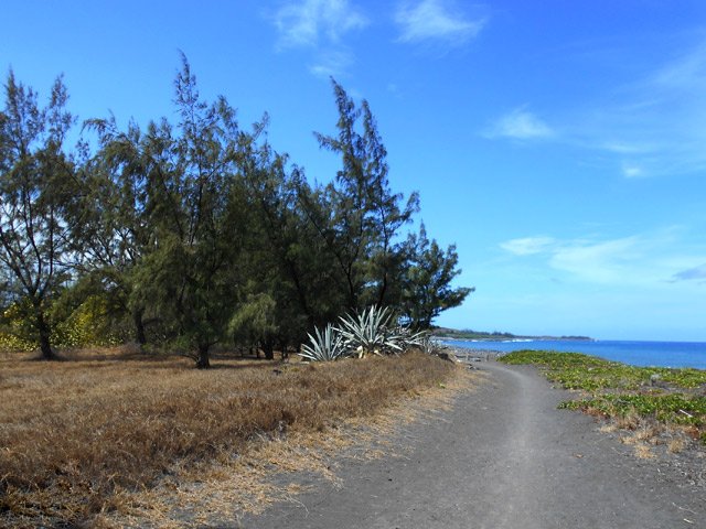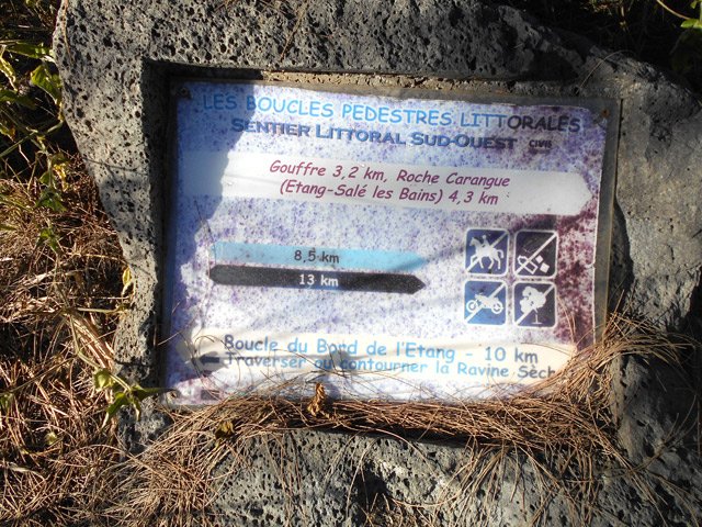 La randonnée débute au grand parking proche de l'étang. S'il est désert le matin, on le retrouve complet au retour de la randonnée car beaucoup de travailleurs viennent ici pour manger leur cari durant la pause méridienne. Avant de partir vers l'Etang Salé, on peut effectuer une courte visite au temple qui a été repeint à la fin de la Rue Valmy (Photo 2). On le distingue très bien malgré la grille qui le clôture. Au retour, profiter des belles vues sur l'étendue d'eau en direction du kiosque sur l'autre rive (Photo 1). Une courte balade peut s'effectuer en empruntant les passerelles en bois et en visitant l'autre rive de la petite ravine. On a, de cet emplacement de nouvelles vues sur l'ensemble de l'étang ou vers l'océan (Photo 7). Rejoindre ensuite le gué situé entre l'étang et la mer. Il est large et recouvert de gros galets qui évitent de se mouiller les pieds (Photo 8). Les pêcheurs sont déjà nombreux tout autour dès le lever du jour. Sitôt le gué franchi, profiter de nouveaux panoramas sur le Dimitile, la Chaine du Bois de Nèfles ou l'usine du Gol qui fume à longueur de journée (Photo 9). On peut emprunter les sentiers au plus près de l'eau ou marcher directement sur la piste sableuse qui se finira à la route nationale (Photo 11). La piste est presque rectiligne, bordée de sentiers ombragés souvent de chaque côté et on y rencontre de gros arbres (Photo 13). A mi-parcours de la première partie, la route devient parallèle à la voie rapide qui est très bruyante (Photo 14). Après avoir rejoint les parkings situés au pont et à la route du golf, poursuivre vers l'Etang Salé. Marcher au plus près de la piste cyclable durant près de 700 mètres avant d'emprunter un sentier de bonne qualité qui se dirige à gauche vers la plage de galets. Le sentier devient de plus en plus sableux et les petites dunes se multiplient. Les plaques indiquant les distances et couleurs de circuits viennent parfois à être ensablées au bord du passage (Photo 15). Le paysage varie peu. Le bord de mer est moins boisé et les dunes se recouvrent de longues lianes de la patate à Durand. (Photo 16). Ce sont ces dunes et agglomérats de galets qui ont petit à petit constitué l'Etang du Gol, enfermant les estuaires de 4 ou 5 ravines encore visibles sur la carte IGN. On se retrouve sur le sentier le plus employé pour venir de l'Etang Salé. Il est très sableux et bordé de galets qui délimitent très bien le parcours (Photo 18). Il faut dire que les galets ne manquent pas dans la région. La plage en est constituée à 100% (Photo 19). On les entend rouler inlassablement quand les fortes vagues viennent les remuer (Photo 21). Ca et là, de grands cairns circulaires égayent le paysage. Là encore, il n'a pas fallu chercher bien longtemps pour les construire (Photo 22). Le sable remplit doucement les chaussures et il ne faut pas penser qu'emprunter la piste équestre toute proche sera une meilleure solution. Le passage fréquent des chevaux remue encore plus le sable. Pourtant cette piste est différente du sentier car la végétation en met une partie à l'ombre, ce qui n'est pas négligeable dans cette région très chaude. Certaines courtes portions, légèrement envahies d'herbe rase, facilitent le cheminement car le pied ne s'enfonce plus. (Photo 23). Certains privilégieront aussi le sentier des pêcheurs qui permet de marcher au plus près des vagues. C'est la meilleure solution en hiver lorsque les baleines nagent au large. A la fin des galets, lorsque le sable est plus fréquent, les bois flottés recouvrent sur d'impressionnantes hauteurs (Photo 28). Le large sentier se termine entre galets et bois flottés et on rejoint la piste au plus près de point de départ. Partir sur la droite ou effectuer une nouvelle balade sur les berges, passer le gué et terminer cette boucle de près de 10 km au parking surchauffé.