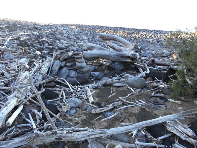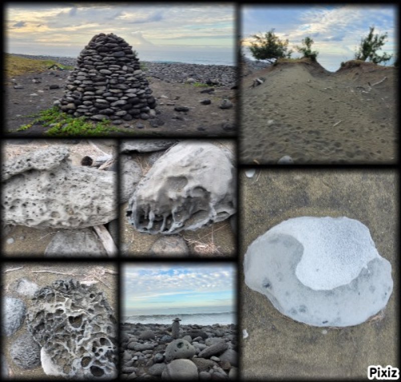 Mon regard a été attiré par quelques curiosités minérales, comme ces roches étrangement érodées ou ce taîjitu de pierre ( photo 2), sans parler des nombreux cairns jalonnant le sentier ou la plage.