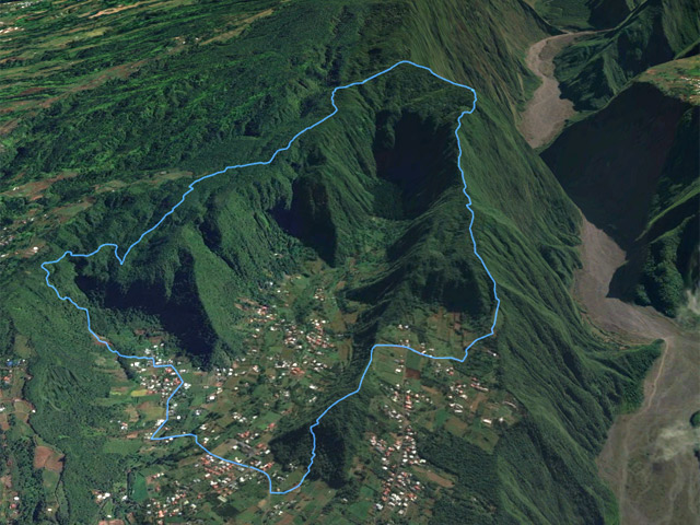 La randonnée débute à l'église de la Plaine des Grègues et suit tout d'abord la Rue du Rond. Au premier croisement, repérer la Maison du Curcuma qui peut donner l'occasion d'une visite en fin de parcours (Photo 1). Poursuivre et emprunter la Rue de l'Îlet qui se termine après quelques virages et frôle des fermes d'élevage avant d'atteindre le Grand Bras Rouge un peu caché sous les futaies. Traverser sur les galets de la ravine à sec et continuer dans les champs de canne, de curcuma (ou de plus en plus de friches) sur une piste et quelques ornières. On s'approche de la Cascade Mottet qu'on aperçoit depuis le départ (Photo 2). Elle n'a de l'eau qu'en cas de cyclone ou un mince filet après les pluies. Elle apparaît rarement photographiée en eau. On voit bien que la pente est importante pour gagner le Piton de la Ligne des Mille, facile à repérer un peu sur la gauche grâce à la piste d'envol des parapentes de plus en plus cachée par les goyaviers. La piste se termine et le sentier prend le relais. Une superbe pente, très raide et aux marches parfois beaucoup trop hautes contourne cette cascade (Photo 3). La végétation est très fournie et le terrain le plus souvent humide et glissant. Les mains sont souvent nécessaires pour sauter de racines en rochers ou passer de courts lacets. Le sentier traverse ensuite une belle forêt de bois de couleurs, de plus en plus envahie par les goyaviers et comporte plusieurs dents de scie parfois très raides mais surtout répétitives. Les lacets évitent les pentes trop fortes mais ils coupent tout de même le souffle (Photo 4). Après ces 150 m de montée sérieuse, on parvient à un croisement de sentiers glissants. Si on part à gauche sur un sentier large et bordé de milliers de goyaviers (Photo 5) on parvient en deux minutes au sommet du Piton de la Ligne des Mille reconnaissable à sa prairie de décollage des parapentes (Photo 6). De cet endroit en pente on bénéficie de magnifiques panoramas sur le village qu'on vient de quitter. Reprendre le même sentier et laisser sur la gauche celui qui file vers les vergers pour rejoindre la route vers Bassin Joséphine. Des randonneurs utilisent d'ailleurs cette route pour débuter la boucle à cet endroit. Plus haut, on a la chance d'admirer de nouveaux panoramas sur la Plaine des Grègues. Le sentier descend ensuite, toujours dans les bois de couleurs (Photo 7) et franchit le Grand Bras Rouge qui n'est qu'une rigole insignifiante. En voyant la terre qui l'entoure, on comprend l'origine de son nom car, en cas de pluie, il draine cette glaise rouge qui teinte l'eau passant, plus bas, par la cascade. Après avoir effectuée un large virage vers le sud pour contourner une nouvelle ravine, le sentier part plein nord et longe une crête qui suit la rive droite de la Ravine des Grègues. Les marches sont nombreuses et les montées souvent rectilignes et fortes. Le sentier est agréable parmi les bois de couleurs et bien sûr les goyaviers plus ou moins touffus (Photo 8). Plus haut, il devient plus large, plus facile mais il est toujours constitué de terre rouge et bordé de goyaviers (Photo 9). On arrive au croisement du sentier venant de la fin du Chemin de la Forêt partant de Bassin Joséphine. Là également, un parking en fin de route permet aux randonneurs de stationner sans avoir à descendre à la Plaine des Grègues. La pente, en règle générale, est moins forte que la précédente mais comporte régulièrement de bons petits raidillons sur des marches. Les bois Noël et bois de savons sont très nombreux dans cette région. Le sentier frôle un bel affouche près d'un point de vue sur Petite Île et la région boisée et champêtre qui l'entoure (Photo 10). Les goyaviers diminuent par endroits et laissent encore pousser les bois de couleurs impossible à reconnaitre en raison de la quantité de barbe de Jupiter qui les habillent (Photo 12). Les points de vue sont encore possibles jusqu'à 1300 m (Photo 13). La montée se poursuit encore jusqu'à la vallée de la Rivière des Remparts où les branles et les fougères sont les plus fréquents. Ne pas hésiter à s'arrêter longuement pour admirer le spectacle offert en face sur les prairies de Grand Coude et le Morne Langevin (Photo 14). Ce panorama 3 étoiles permet de voir toute la Rivière des Remparts jusqu'à Roche Plate et laisse imaginer le tracé du Sentier Dimitile qui relie les galets du fond de la rivière aux vertes prairies du plateau par un sentier abrupt et pourvu de quelques échelles (Photo 15). On poursuit par des portions de sentiers qui paraissent presque verticales vues du haut tellement la pente est forte. Ne pas manquer les nouveaux panoramas sur Grand Coude et sur la Petite Plaine (Photo 16). Ailleurs, on retrouve des pentes plus classiques un peu envahies de grandes herbes, fougères ou sabres marrons (Photo 18). On traverse également de belles surfaces couvertes de branles ne comportant pas de plantes envahissantes (Photo 19). Des vestiges de gros branles verts bordent par endroits le sentier pentu et terreux (Photo 20). Le sentier devient moins abrupt (traversant d'ailleurs une région nommée "le Plat"), se transforme plus bas en longue piste terreuse ou caillouteuse et passe à deux mètres du sentier des Trois Sources permettant d'atteindre la Rivière des Remparts. A partir de ce sentier, suivre la piste puis le large sentier bordé de clôtures et de goyaviers pour rejoindre la route de la Petite Plaine, au Chemin du Terminus (Photo 22). Au croisement, partir sur la droite et ne pas manquer, juste en face, le sentier qui traverse un champ de curcuma (Photo 23) pour rejoindre le Sentier du Curcuma grimpant au sommet du Piton de la Petite Plaine. La pente est régulière entre pierres, terre et racines (Photo 24). Quelques portions plates entre les goyaviers permettent de souffler un peu (Photo 25). Sur la droite, les toitures des habitations du village indiquent que la boucle est bientôt termi