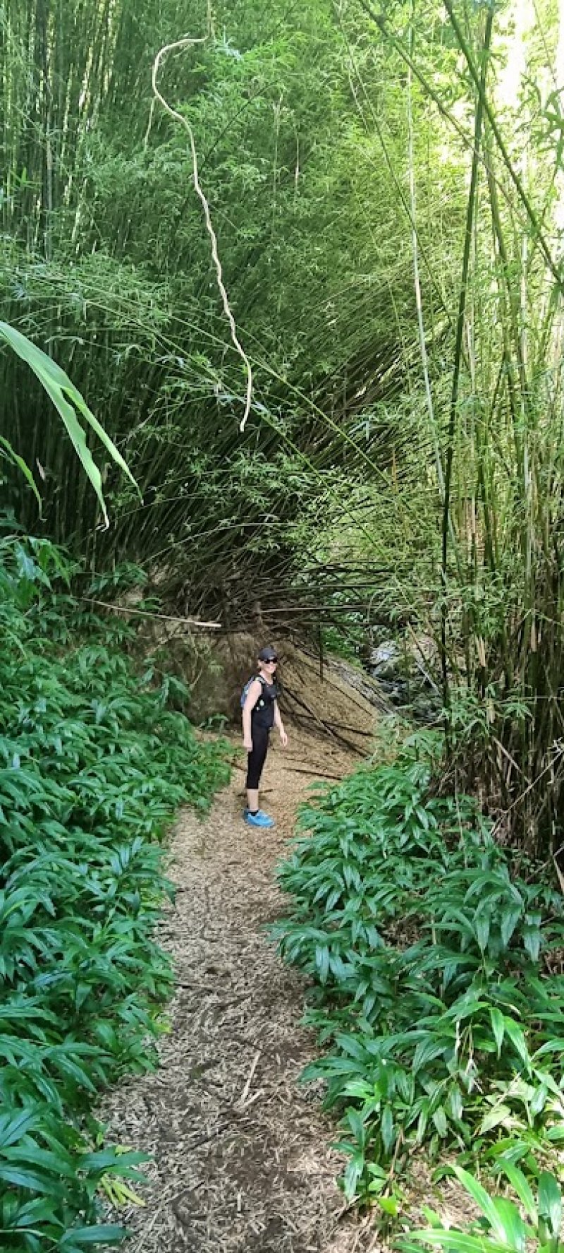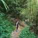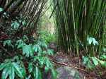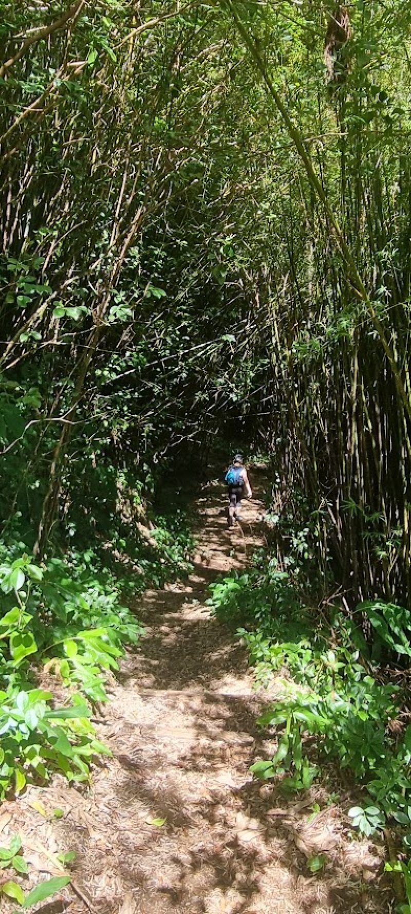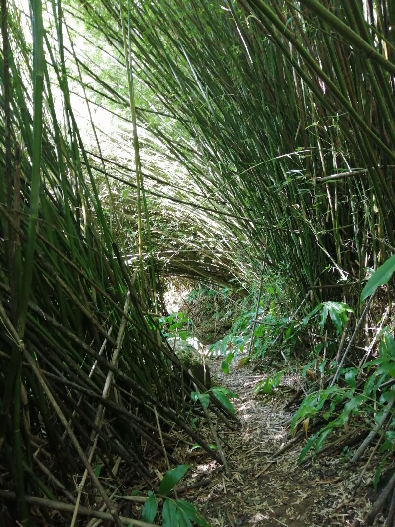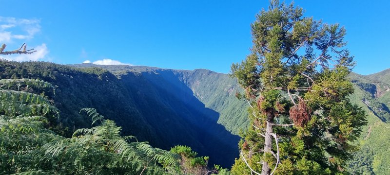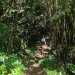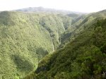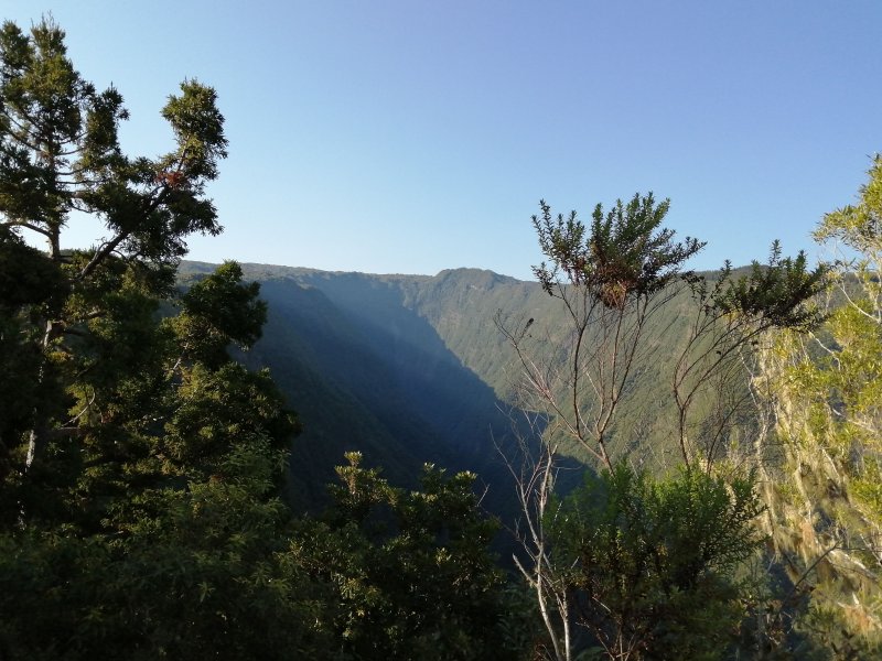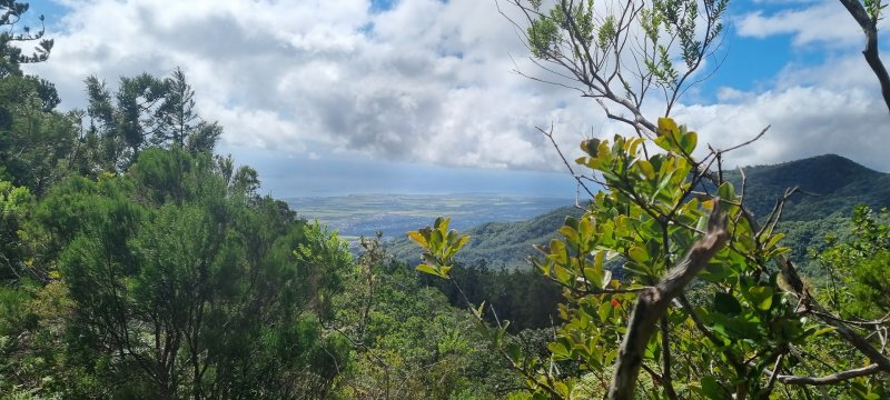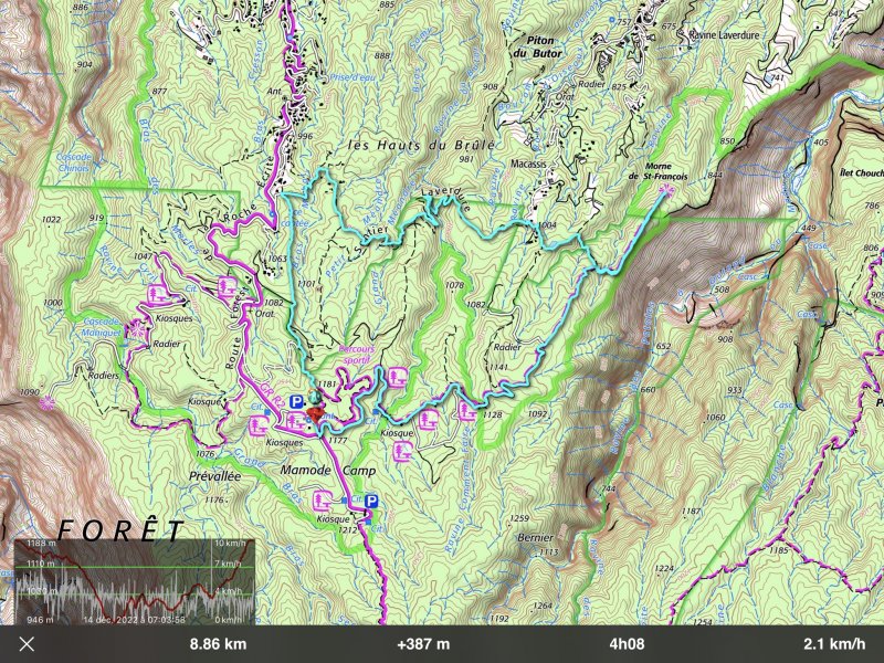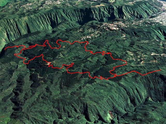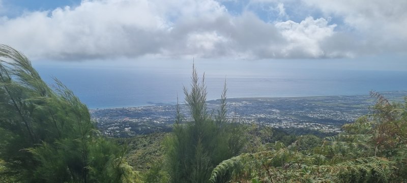 La randonnée débute au croisement de la route du Brûlé et de celle de la Cascade Maniquet. Le cheminement est très facile jusqu'à la cascade car effectué sur la route bordée de la forêt de cryptomerias (Photo 1). La route, en lacets, est en légère descente. Après le troisième virage, repérer sur la droite le sentier de la Cascade Maniquet. La descente au bassin est courte, sans trop de difficulté sur un sol parfois glissant et permet d'admirer une belle cascade, fine et élégante, très connue de la région des Hauts du Brûlé (Photo 2). La remontée est obligatoire. Poursuivre sur la route en franchissant le Grand Bras qui alimente la cascade (s'il y a de l'eau - Photo 3). Repérer, tout près du radier, le sentier de Prévallée partant sur la gauche. Si les délais le permettent, pousser jusqu'au bout de la route pour contempler la magnifique et sauvage vallée de la Rivière Saint-Denis à partir de l'aire de pique-nique vieillissante (Photo 4). On distingue très bien l'Îlet à Guillaume juste en face au milieu des camphriers. Revenir en arrière jusqu'au départ du sentier de Prevallée repéré au radier. Il franchit le Grand Bras au fond rocheux avant de pénétrer dans un bois d'eucalyptus avant de poursuivre sous les conifères (Photo 5). Il est parfois un peu boueux, surtout au début près du Grand Bras. Après une forte pente, il redescend lentement vers le Grand Bras qu'on traverse à nouveau. Les goyaviers représentent la majorité de la végétation entourant le sentier large, glissant et comportant quelques marches (Photo 6). Partir à droite en arrivant à la route puis prendre la direction de Mamode Camp. Bifurquer à la première intersection et rejoindre le parking de l'immense aire de jeu et de repos entourée de cryptomerias (Photo 7). Marcher jusqu'au panneau du parcours sportif qui n'a plus rien de sportif sans ses ateliers. Rejoindre ensuite le croisement des deux routes pour partir immédiatement à gauche en direction du Morne Saint-François, bien indiqué sur les poteaux de l'ONF. Marcher 1200 m dans les longoses et sous les cryptomerias en rencontrant de nouvelles tables de pique-nique ça et là (Photo 8). Ne pas manquer le sentier de raccourci avant un grand virage à gauche de la route. Ce sentier descend sous les grands arbres, franchit la toute jeune Ravine du Butor puis remonte rejoindre la route un peu plus loin. C'est reparti pour 900 m de béton en profitant de quelques points de vue vers la mer au-dessus des fougères (Photo 9). Malgré la randonnée sur route, le trajet verdoyant est très agréable (Photo 10). On peut également repérer le Morne reconnaissable à ses trois filaos qui dépassent (Photo 11). Le départ du sentier du Morne Saint-François est facile à trouver sur la droite après quelques virages. Il débute sous forme de piste puis très vite se transforme en large sentier sous les cryptomerias (Photo 12). Il se rétrécit au fur et à mesure de la descente ; des rondins et des marches facilitent par moment le cheminement dans les descentes un peu plus fortes. On parvient à un premier point de vue sur la Ravine des Patates à Durand. On distingue deux cascades provenant des ravines en face, dont une n-ième ravine Blanche (Photo 13). Vers l'amont c'est une autre cascade venant de la Ravine Grande Marmite qui coule dans la verdure (Photo 14). Le sentier passe parfois au plus près du rempart et peut incommoder les acrophobesL'acrophobie est la peur du vide sur de courts tronçons (Photo 15). La marche est toujours aussi facile jusqu'au morne. Une plateforme bétonnée, emplacement d'un très ancien kiosque, permet de larges points de vue sur le chef-lieu. Sur la gauche, le cœur de la ville et La Montagne sont en partie cachés par quelques arbres (Photo 16). Après avoir profité du panorama, rebrousser chemin jusqu'à la route et bifurquer à droite jusqu'à quelques cryptomerias (Photo 17). Retrouver, sous ces cryptomerias, le sentier qui rejoint les Hauts de Macassis en passant sous les goyaviers et dans les fougères. La descente est légère le plus souvent mais le sol peut être glissant s'il est humide (Photo 18). Continuer jusqu'à l'énorme eucalyptus et partir à gauche vers les cases de Macassis. Marcher une dizaine de mètres sur la route puis partir à gauche, sous un gros filao, sur le sentier Laverdure. Il plonge en quelques mètres vers le gué de la Ravine Bois d'Oiseaux entouré des premières touffes de bambous. Ce sentier, qui aurait aussi pu s'appeler "la verdure", car c'est bien la couleur qui domine sur les 4 kilomètres, serpente sous les cryptomerias, goyaviers et bambous sur un sol moussu (Photo 19). Les travaux entrepris en 2021 ont vite redonné l'éclat qu'il avait perdu depuis une décennie (Photo 20). Même sans travaux, le sentier est toujours visible (Photo 21). Le sentier effectue de plus en plus de lacets serrés pour franchir les pentes de la Ravine du Butor qu'on ne tarde pas à traverser à nouveau (Photo 22). Une partie de la traversée jusqu'au Brûlé s'effectue sous les cryptomerias où il est parfois facile de s'égarer (Photo 23). Les portions les plus agréables sont sous les bambous qui représentent ici la plus grande implantation de l'île (Photo 24). Les portions les moins intéressantes sont celles où les goyaviers poussent si serrés qu'on ne peut envisager de quitter l'itinéraire (Photo 25). Les longoses, quand elles sont mouillées, sont désagréables car elles détrempent tous les vêtements (Photo 26). Une fois la multitude de virages terminés, le bruit des chiens, de la musique à tue tête, des voitures indiquent qu'on se rapproche du Brûlé. Le sentier, très fréquenté, est alors de très bonne qualité même s'il demeure glissant (Photo 27). Ne pas manquer, parmi tous les carrefours, celui qui mène vers la dernière descente pour franchir le Bras Mahot sur une passerelle qui sera bientôt dévorée par la végétation (Photo 28). Emprunter l'e