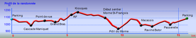 Il est bien agréable de pouvoir dire que l'on a escaladé un morne sauf qu'ici, ce morne se visite par une interminable descente (voir profil ci-dessous). Le Morne Saint-François n'est tout simplement qu'un promontoire parmi une dizaine d'autres aux alentours qui permet de larges points de vue sur le chef-lieu si les goyaviers ne cachent pas l'horizon. Depuis le sommet, occupé par les ruines bétonnées d'un ancien kiosque, on voit très bien les falaises de la Redoute ou l'aéroport de Gillot. Toute la région est couverte soit de cryptomerias, soit de goyaviers qui ont parfois envahi les sentiers et rendent difficile la progression. Le retour par la forêt des Hauts du Brûlé est très agréable car le sentier Laverdure est de bonne qualité, traverse de nombreux cours d'eau, chemine sous d'innombrables touffes de bambous et permet de déguster des goyaviers (à la saison). Hélas, il s'envahit très vite de longoses, sabres et goyaviers. Attention de ne pas s'égarer tant les bifurcations sont nombreuses mais on a vite fait de repérer le sentier qui est le plus fréquenté.