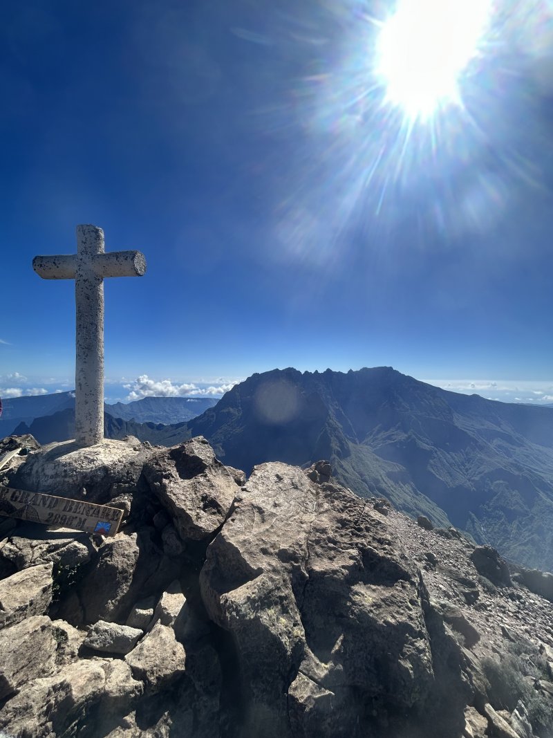 Longue et sportive, cette randonnée permet d'admirer de magnifiques panoramas sur le cirque de Cilaos durant toute la montée puis de Mafate à partir du Grand Bénare. De nombreux paysages variés seront au rendez-vous (forêt de cryptomerias, bois de couleurs, brandes, déserts de cailloux, prairies ou route forestière). Par temps clair, on peut admirer une grande partie de l'île du haut des 2898 m du Grand Bénare dont le Piton de la Fournaise qui surgit parfois au-dessus des nuages. Durant l'hiver austral, les températures risquent d'être négatives et toute l'année les vents peuvent y être violents ; prévoir un vêtement adapté et partir très tôt car le Grand Bénare est souvent un des premiers sommets à s'emmitoufler de brouillard, rendant les panoramas bien tristes et la sortie frustrante. Le plus difficile de toute la sortie sera cette longueur infinie de cailloux recouvrant l'ensemble des sentiers à partir de la Ravine de Bellevue jusqu'au Grand Bénare.