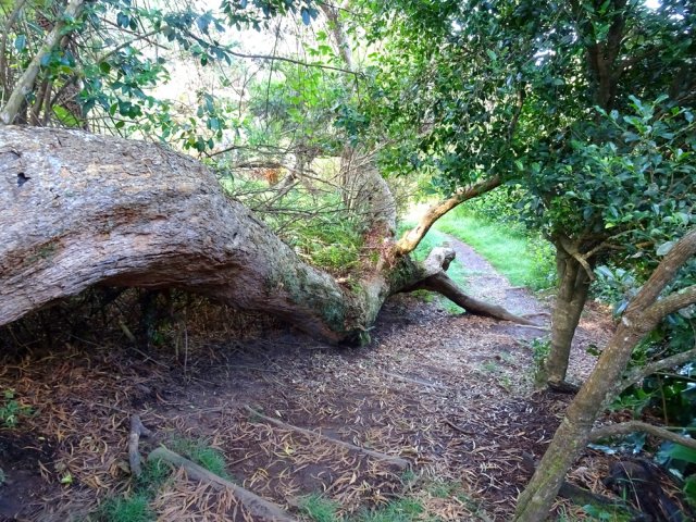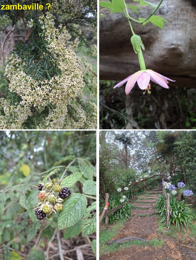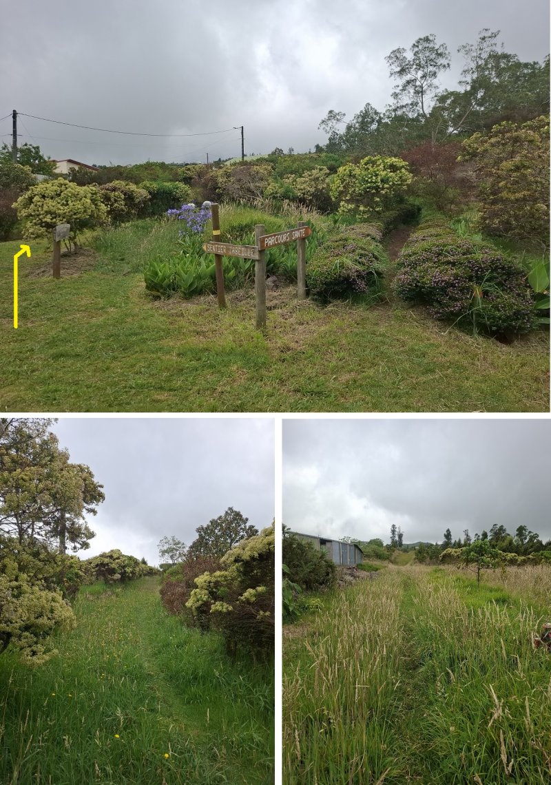 La randonnée débute ici au premier parking de la zone qui en comporte plusieurs. Aussitôt le petit escalier franchi, on se retrouve face aux panneaux indiquant plusieurs sentiers (Photo 1). Prendre celui de gauche en direction du village et passer entre des tamarins, dont un énorme qui n'a pas résisté au dernier coup de tempête (Photo 2). On se retrouve rapidement à un grillage entourant le domaine pour profiter sans obstacle des vues sur le Piton de la Ravine Blanche et le village éponyme (Photo 3). Les parterres fleuris au départ du Sentier Zabeille laissent présager d'une belle balade (Photo 4). Hélas, la large allée remontant le long des propriétés est peu fréquentée et encore moins entretenue (Photo 5). Heureusement, c'est à partir de ce parcours que l'on a les meilleurs panoramas sur les plus hauts sommets de l'île (Photo 6). La rosée du matin sur les herbes a tôt fait de mouiller les pieds, surtout en cheminant à l'ombre (Photo 7). La trace est toujours visible et chacun jugera en fonction des premiers mètres ou des projets de la matinée si cela vaut la peine de l'effectuer. Une fois au sommet, redescendre vers l'entrée et repartir sur le circuit bien plus agréable qui remonte à nouveau avec quelques petites marches (Photo 8). Plus haut, on peut même souffler sur des portions planes (Photo 9). Puis on remonte à nouveau en longeant parfois de grands tamarins terrassés par le vent (Photo 10). Même faute d'entretien, le sentier reste large et facile à suivre (Photo 11). Les arbres rencontrés sont beaucoup plus grands et beaux que sur ce pauvre sentier Zabeille (Photo 12). Le circuit alterne descentes et montées séparées par endroits de moins de 10 m. On quitte les tamarins pour traverser une zone envahie d'acacias noirs dont beaucoup traînent au sol (Photo 13). A l'approche du bois d'eucalyptus les renouées du chinois ont envahi les abords du sentier (Photo 14). On parvient plus haut à la ferme photovoltaïque qu'on devine derrière les clôtures. Les eucalyptus permettent de marcher un peu à l'ombre avant d'entamer la descente suivante (Photo 15). Les arbres, touffus et très hauts, ont également souffert des épisodes venteux et certains arbres sont ébranchés (Photo 16). Quelques racines ne ralentissent pas la marche sous les grands arbres (Photo 17). Dans la dernière descente de cette sortie, on retrouve de plus en plus de grands tamarins tortueux (Photo 18 et 19). Certains semblent ne jamais avoir souffert pour le plus grand plaisir des yeux (Photo 20). Aux croisements de sentiers, rien de plus facile que de poursuivre en lisant les pancartes car les panneaux, eux, sont rares à être encore lisibles (Photo 21). Le sentier bordé de grands arbres est toujours aussi facile (Photo 22). On retrouve de nouveaux tamarins couchés au sol qui continuent cependant à vivre (Photo 23). Après un dernier festival de tamarins majestueux (Photo 25 et 26), on se rapproche de la route au milieu des fleurs, dont de hautes agapanthes et de grosses touffes d'hortensias bleus (Photo 27). La boucle prend fin à la route que l'on peut rejoindre par plusieurs sentiers passant près des kiosques de pique-nique (Photo 28).