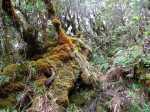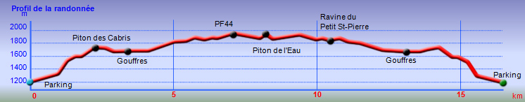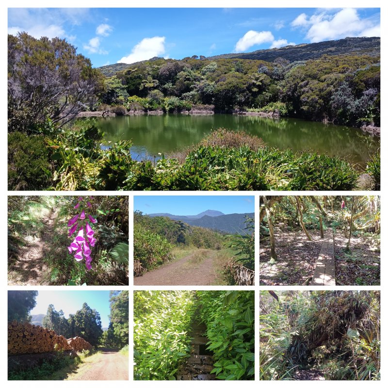 La randonnée débute à la fin de la piste qui a remplacé la Rue Saint-Ange Vélia après avoir traversé le Grand Bras Piton (Photo 1). Le début du sentier est proche du parking, sur la droite. Pénétrer dans la forêt de cryptomerias sur un sentier de terre rouge, large et en assez bon état, qui monte de plus en plus par de longs lacets (Photo 2). On ne quitte pas les grands conifères jusqu'au poteau en bois du Parc National. A partir de ce point de repère, la végétation change, devient plus sauvage et le sentier se rétrécit (Photo 3). Les arbres se couvrent d'épiphytes et de grosses touffes de fougères. On aperçoit ça et là quelques orchidées. Le sentier se borde souvent de califons (Strobilanthes hamiltonianus), une plante devenue invasive mais qui heureusement ne pique pas (Photo 4). La montée s'intensifie et impose de se pencher un peu vers l'avant pour doser l'effort. On rencontre quelques planchers et passerelles, franchissant des rigoles, qui ont mal vieilli (Photo 5). Certaines, plus longues, imposent toute l'attention car il manque des planches ou, pire, certaines vermoulues peuvent céder sous le poids du marcheur. Il vaut mieux chuter dans la boue que se coincer une jambe entre deux planches. Pour chuter dans la boue, rien de plus facile, il suffit de lever le nez moins de deux secondes (Photo 6). Entre les trous remplis d'eau, les anciennes marches retenant la boue ou le sentier creusé par les milliers de passages, toutes les occasions sont offertes de goûter à la gadoue. La couleur des vêtements au retour en dit long sur ce genre de traversée qui n'a rien à envier au circuit vers le Trou de Fer. Heureusement, il reste des planchers encore solides et même recouverts de grillage (Photo 7). Malgré la forte montée, on n'hésite pas à ralentir pour admirer la forêt primaire, domaine des mousses, des fougères et ananas marrons (Photo 8). Les marches encore en bon état sont rares et très pratiques pour reprendre pied (Photo 9). On atteint en moins de 90 minutes le sommet du Piton des Cabris mais bien malin qui saura le voir. Le terrain y est plat et on ne voit rien de ce qui caractérise habituellement un piton, hormis une belle brousse couverte de verdure (Photo 11). Une zone peuplée de pimpins (pandanus des hauts) et de calumets offre des panoramas sur la région de la Plaine des Palmistes et du Morne Saint-François. Sur 500 mètres, le sentier descend presque aussi fortement qu'il montait de l'autre côté puis s'assagit. La végétation commence à changer et les branles deviennent plus nombreux (Photo 12). On est accueilli en fin de descente par la magnifique Ravine Saint-François au fond comportant bassins, grottes et surtout beaucoup de mousse glissante (Photo 13). Les branles sont de plus en plus nombreux dans l'herbe qui recouvre désormais le sol. La boue n'a pas disparu, loin de là (Photo 14). Comme le sentier est étroit, certaines plaques sont inévitables et les chaussures sont vite remplies de gadoue nauséabonde (Photo 14). La mousse recouvre tous les arbres et arbustes et les sphaignes atteignent souvent plus de 30 cm d'épaisseur. Là où il y en a le plus il faut guetter les deux gouffres qui sont hélas trop recouverts de végétation pour pouvoir en profiter. Celui de gauche se devine à la noirceur de la cavité. Celui de droite s'atteint par 10 mètres de hors sentier (Photo 15). Attention au sol meuble en bordure du trou. Le sentier, herbeux, plus propre, se dirige vers le Piton de Chat qu'on ne peut apercevoir à travers les futaies (Photo 16). Les tamarins, qu'on a peu vus depuis le début, apparaissent mais restent rares. Certains spécimens trônent là depuis des décennies (Photo 17). Le sentier oblique à nouveau sur la droite et commence alors une longue portion suivant un affluent de la Ravine St-François. La ravine est profonde, étroite, proche du sentier et offre de belles occasions de prendre des clichés naturalistes. Une fois la ravine disparue, le sentier peut reprendre sa trajectoire en obliquant vers la gauche. On se retrouve très vite à traverser la Ravine Plate qui file en droite ligne vers le Piton de Chat (Photo 18). Il faut souligner le remarquable balisage de l'ONF qui a apposé au sol des plaques émaillées impossibles à détruire par les crues, rendant plus aisée la traversée qui n'est pas toujours juste en face. On frôle à nouveau de magnifiques spécimens moussus qui gagneraient leur entrée au Piton Tortue (Photo 19). Le sol devient plus souvent herbeux et propre (Photo 20). La progression est deux fois plus rapide qu'ailleurs. On se trouve en face de barbelés couchés au sol et de vieilles échelles, signe que ces sous-bois impénétrables étaient encore récemment des pâturages (Photo 21). Attention : après avoir franchi une échelle verte en bon état surmontant une clôture de qualité, on atterrit dans une prairie encombrée de souches, de branches et de quelques arbres. Partir sur la gauche et rejoindre au plus vite la clôture située devant à gauche. Une nouvelle échelle sans couleur permet de retrouver le sentier sous les branles. La marche est rapide sur ce terrain en pente légère sur un sentier étroit mais bien visible (Photo 21). La traversée est longue et paraît interminable. La fin est proche lorsqu'on franchit une dernière clôture par une échelle en bois qui amène à longer une prairie envahie petit à petit d'ajoncs d'Europe (Photo 22). Le sentier, le long du barbelé, se termine à la piste venant des prairies du Piton des Cochons (Photo 23). Rejoindre très vite la piste du Piton de l'Eau et descendre vers le lac de cratère. Grimper le petit sentier qui s'approche de l'étendue d'eau (Photo 24) et en faire le tour pour apprécier la sérénité du lieu (Photo 25). Les arums, à la saison, en font un endroit idyllique très recherché des photographes (Photo 26). Cette fiche prévoit de revenir à la Plaine des Palmistes mais on peut très bien remont