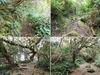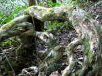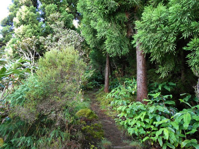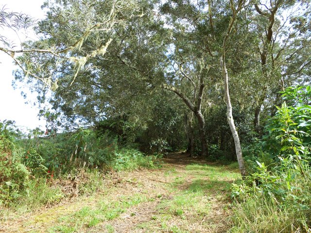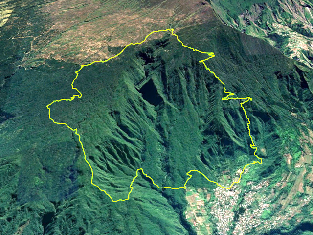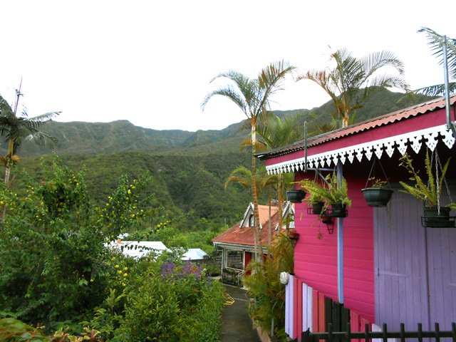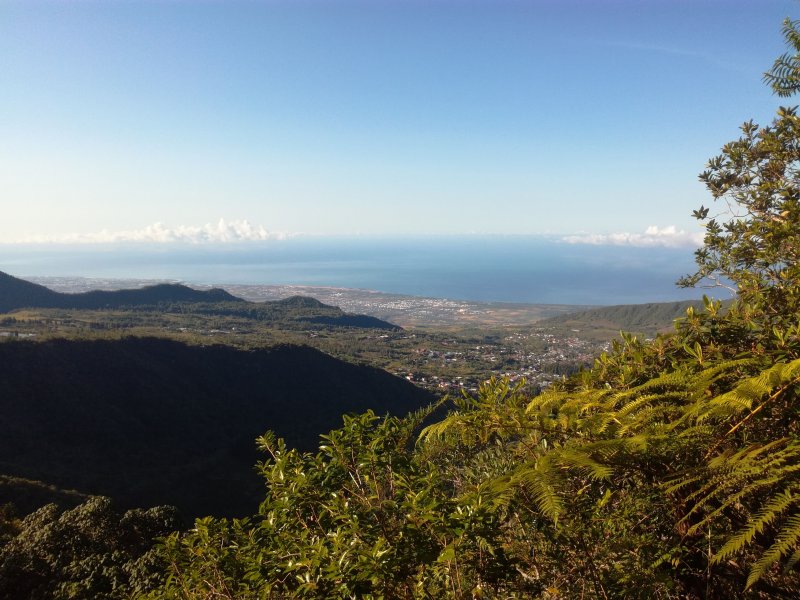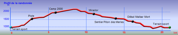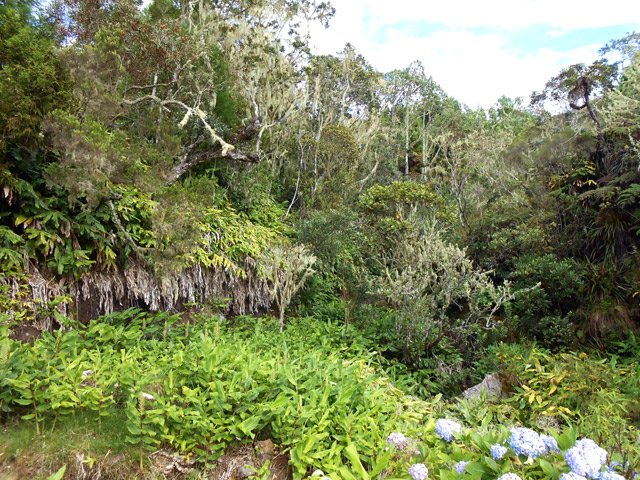La randonnée débute ici au stade de football des Makes, plus facile à trouver que le départ du sentier de la Découverte. On attaque directement la faible montée par un peu de route puis la Route Forestière des Goyaves bordée de plusieurs espèces de fleurs envahissantes et déjà les premières longoses (Photo 2). Autant ne pas être allergique à leur pollen car on ne les quittera que sur la courte portion de la Route Forestière du Haut Tévelave dans sa partie la plus haute là où plus rien ne pousse sur les basaltes incultes. On rencontre dans un lacet un sentier qui file tout droit vers une ravine dans les cryptomerias ; ne pas hésiter à le prendre car il rejoint plus haut la piste un peu avant le début du sentier officiel (Photo 3). La piste s'élargit pour permettre aux camions de faire demi-tour et on débute alors une belle montée en lisière des cryptomerias qui, comme toujours, gênent le cheminement par leurs racines aériennes (Photo 5). Ne pas trop se réjouir au petit col au tiers du parcours, car c'est là que débute la véritable montée sur des hautes marches. 5 longues échelles successives permettent de monter sans effort une arête rocheuse et on aimerait qu'il y en ait plus (Photo 6). Hélas, il faut reprendre les hautes marches bordées d'une dizaine d'espèces de fougères. On arrive ainsi à la Piste n°58 qu'on emprunte sur moins de 1500 mètres avant de reprendre sur la gauche une belle piste herbeuse qui se transforme très vite en beau sentier au milieu des tamarins. Les raccourcis qui dominent la vallée de la Ravine du Mouchoir Gris permettent quelques points de vue sur les Makes (Photo 9).On emploie tour à tour des portions rocheuses (Photo 10), ombragées sous les cryptomerias (Photo 11) ou sous de magnifiques tamarins des Hauts (Photo 16). Lorsqu'on retrouve cette piste bordée de bois de couleurs (Photo 12), la halte à Camp 2000 est proche (Photo 18). On apprécie le calme et l'isolement de ces bâtiments fonctionnels en planches mais la pente n'est pas terminée (Photo 19). La piste remonte en direction du Grand Bénare ou du Tévelave. Il faut prendre à gauche à la Ravine de Bellevue pour rejoindre par la piste et ses raccourcis le mirador du Sentier des Tamarins dans une végétation sèche constituée essentiellement de petits branles verts (Photo 22). On chemine alors sur la large piste et surtout sur le sentier qui permet d'éviter les longs lacets (Photo 21). Plusieurs itinéraires permettent de rejoindre la Route Forestière du Tévelave. Curieux : on retrouve les longoses !! Pour ne pas manquer le début du Sentier du Piton des Merles, longer cette route en descente sur moins de 2 km et repérer, dans un lacet étroit vers la droite, le départ très discret. Ce sentier, peu utilisé, se suit de plus en plus difficilement dans la végétation constituée de bois de couleurs cachés en totalité par les millions de longoses (Photo 24). L'humidité est importante et on rencontre des plaques de boue. Attention à la glissade lors du passage des petites ravines et près du bassin du Bras de la Ravine Sèche (Photo 23). Comme tout le reste du circuit s'effectuera en descente, on peut, avant de poursuivre, tenter d'approcher les deux bassins et cascades qui y coulent en période pluvieuse. Attention tout de même à la chute facile sur les plantes et pierres glissantes ; on aura bien assez de possibilités de chutes dans la descente du Malabar Mort ! Après une bonne heure pour ces deux kilomètres dans la jungle humide des longoses, on atteint le sentier du Piton Lacroix, le bras en feu d'avoir tout coupé. Le banc de goyaviers qui attendait le randonneur se meurt doucement et ne peut plus supporter son poids depuis longtemps. Le sentier vers la Pièce Jeanne a tendance à être également envahi mais on y chemine plus facilement que sur le précédent. On ne peut manquer le départ à gauche vers les Makes par le Sentier du Malabar Mort. Quelques marches glissantes marquent le départ dans les branles. La végétation s'épaissit très vite pour devenir sombre tant il y a d'arbres (Photo 27). Attention aux glissades très faciles si on ne regarde pas où mettre les pieds. Quelques échelles ou rambardes facilitent des passages mais ce court circuit laissera tout de même d'inoubliables souvenirs, tout comme les magnifiques racines rencontrées sur le bord du sentier (Photo 26). On en peut oublier le Malabar Mort, qu'on le fasse en montée ou en descente. La pente est si forte parfois qu'on se fatigue tout autant qu'en montée. C'est donc en fonction de la fatigue qu'on décidera de la fin du parcours qui peut emprunter un des deux côtés du Sentier Botanique ou la partie Nord qui passe près du réservoir avant de retrouver les premières cases des Makes. Le sentier de raccourci qui passe entre maisons et jardins est court et agréable pour retrouver le véhicule au stade. Remarquer au passage le joli tableau représenté par un petit salon de coiffure, la case qui le jouxte, le jardin fleuri et les montagnes en arrière plan (Photo 1).