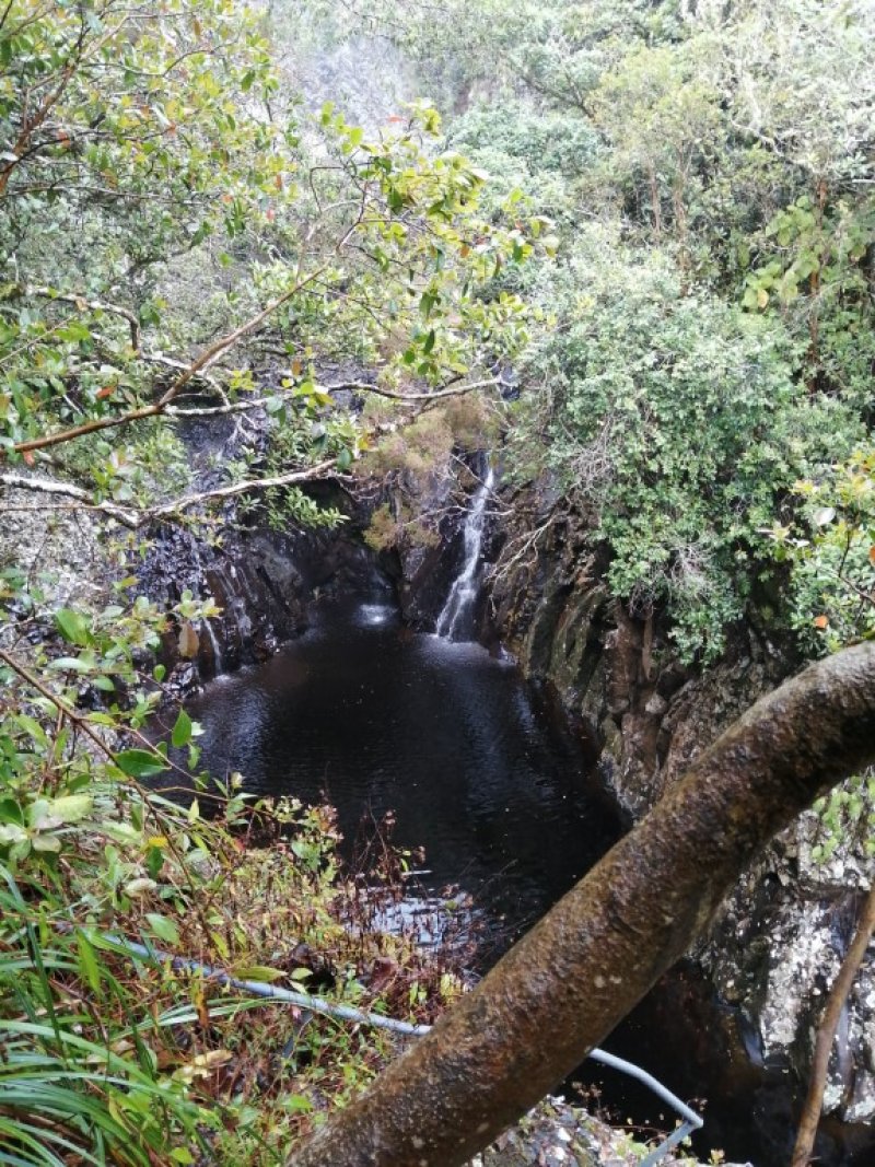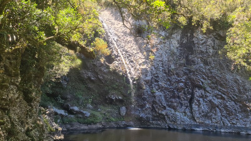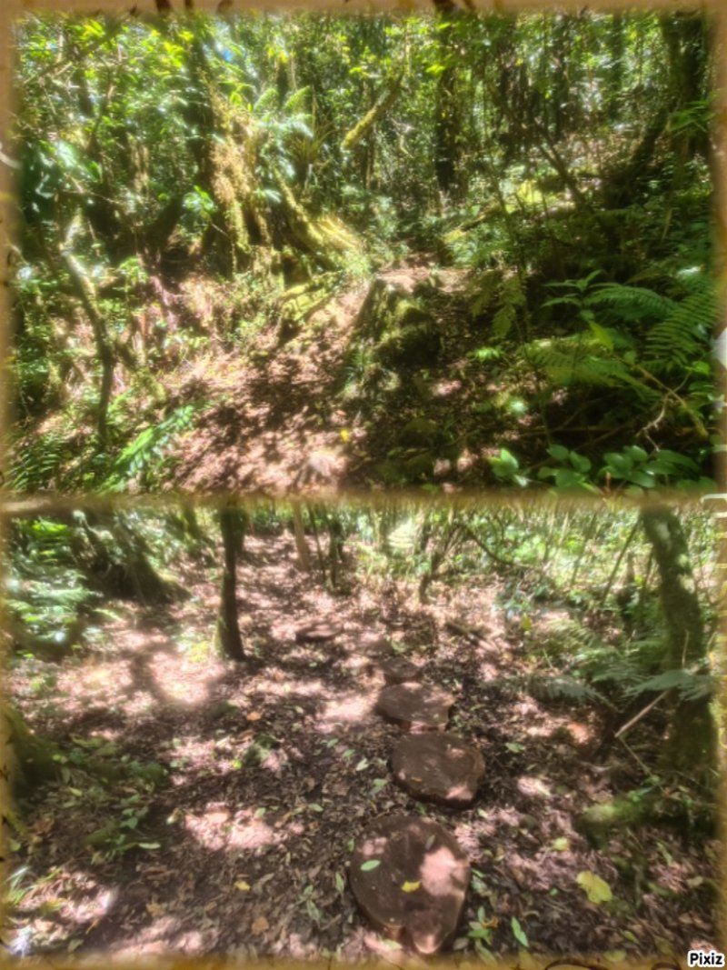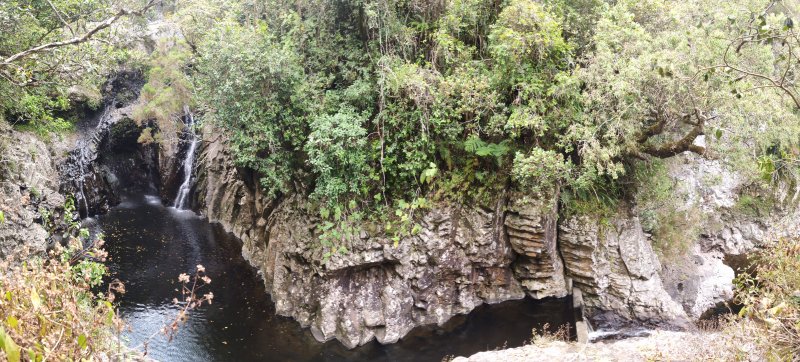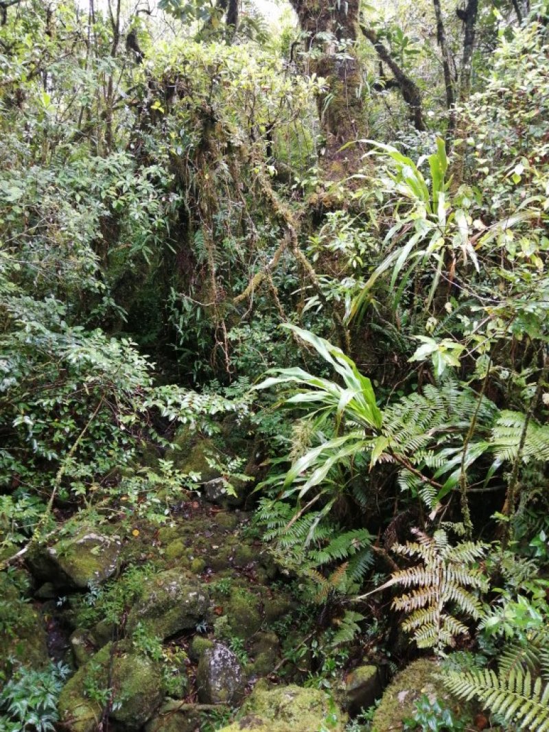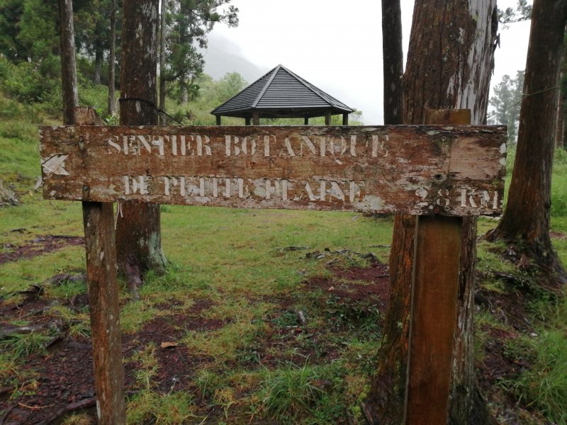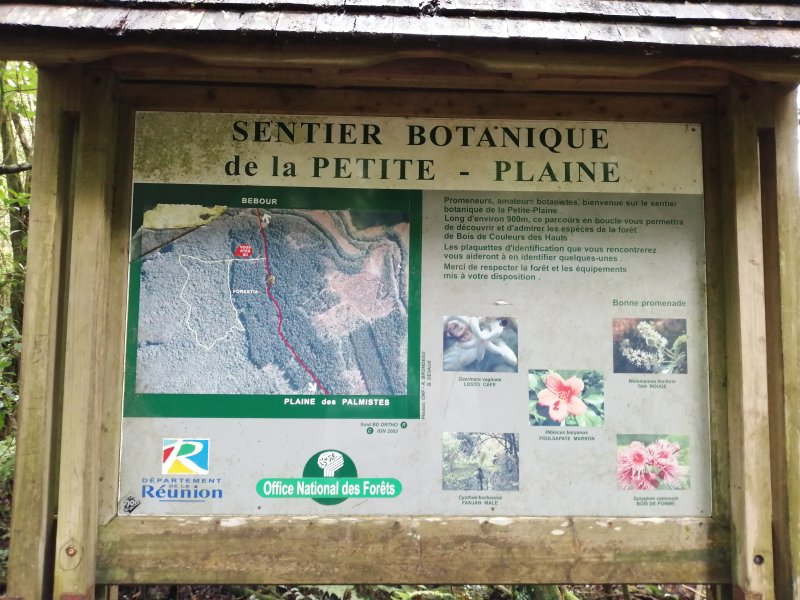 La randonnée débute à la fin de l'aire de repos, loisirs et pique-nique de la Petite Plaine, à deux pas du pont-radier sur la Bras Noir. C'est le même parking utilisé pour la boucle de la Petite Plaine qu'il est possible de combiner avec celle-ci. On remonte un peu la route en direction de la Plaine des Palmistes puis on bifurque à droite sur l'ancien accès à Forestia sur un sentier en escalier bordé de barrières bois (Photo 2). Plus haut, une pancarte donne un peu de lecture avant d'entamer la boucle. Le sentier est de bonne qualité et chemine à l'ombre des bois de couleur, hélas colonisés par les goyaviers qui ne mettront pas des décennies à détruire la forêt. La pente est faible et le sentier un peu humide. On rencontre une bifurcation partant sur la gauche pour poursuivre sur le sentier botanique mais on entend un bruit d'eau tout près. Repérer la bifurcation et prendre à droite en direction de ce bruit aquatique. On remarque plusieurs sentiers dans ce sous-bois sombre et moussu. L'un d'entre eux suit le rempart de la Ravine profonde alors que d'autres sentiers plongent vers la rivière. Attention : ces sentiers abrupts et souvent glissants ne s'adressent pas à tous les randonneurs. Ils permettent de s'approcher au plus près des chutes et bassins du bien nommé Bras Noir. Si la cascade est blanche d'écume, le bassin est sombre à cause des rochers noirs et du manque de lumière qui donnerait presque au lieu un caractère inquiétant (Photos 4 & 5). Comme une randonnée spécifique permet de visiter toutes les cascades de la région, se contenter pour cette boucle des deux ou trois cascades ou bassins facilement joignables par le sentier de bord. La descente jusqu'au barrage de la prise d'eau s'effectue par des échelles abruptes. Attention par temps humide. Une fois cette acrobatique écart terminé, rejoindre le croisement repéré dans la montée et bifurquer à droite pour poursuivre sur le sentier botanique. Le sentier, toujours bien marqué, monte d'une cinquantaine de mètres, franchit une petite ravine, se poursuit sur une portion assez plate puis commence sa descente vers la Route Forestière Bébour-Bélouve. Prendre son temps pour étudier les épiphytes, orchidées, fougères ou plantes diverses qui poussent dans les bois de couleurs. Ne pas manquer les beaux troncs tortueux poussant çà et là aux abords du sentier qui descend fortement vers la route. On retrouve sans difficulté la pancarte étudiée au départ et le retour au parking s'effectue par le même itinéraire.