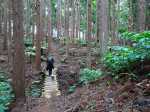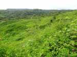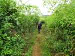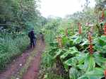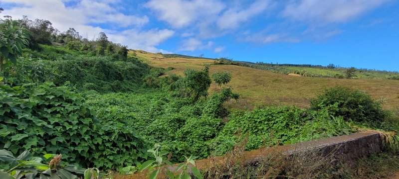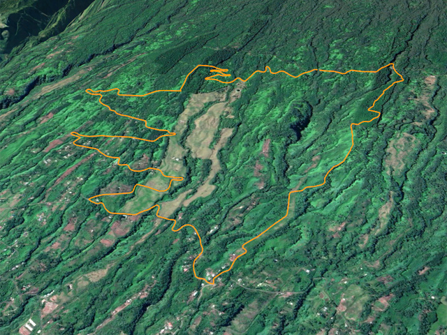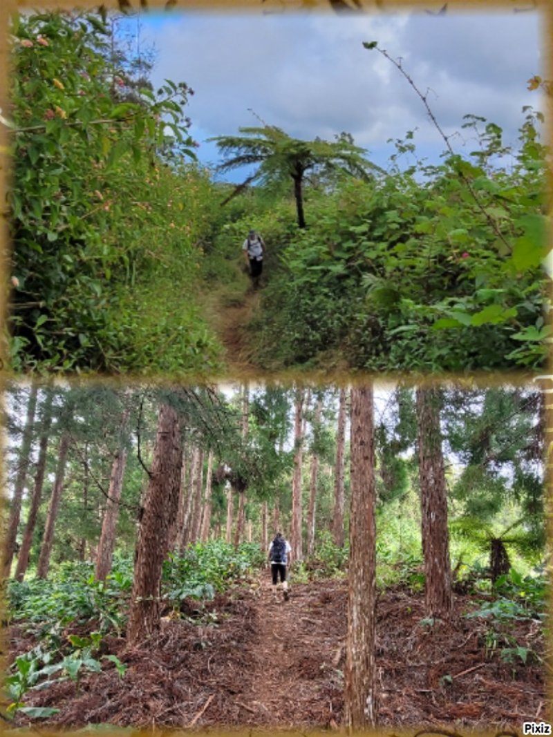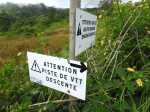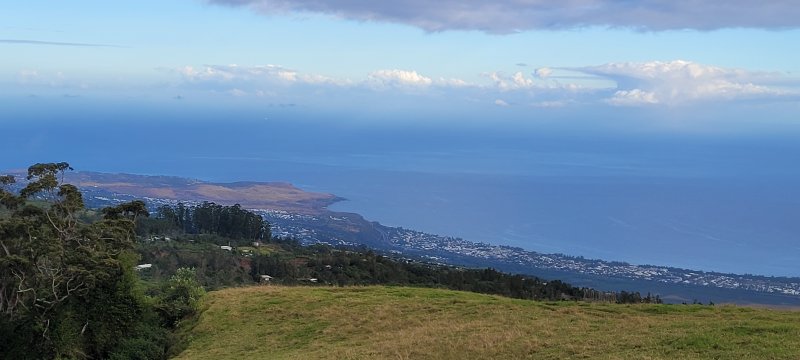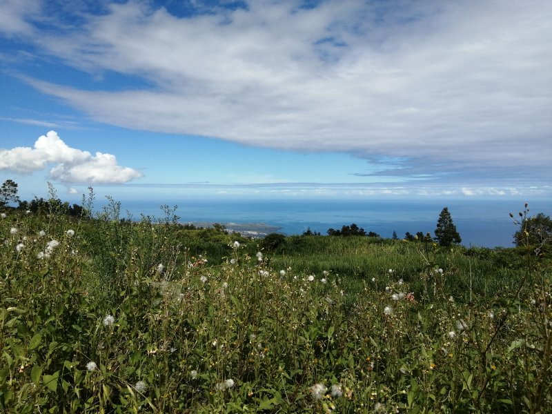 La randonnée débute sur la route Forestière des Cryptomerias au croisement avec la piste du Bois de Nèfles. Le cheminement est toujours aisé, en descente légère constante sur un sol tout d'abord couvert d'herbes (Photo 1). Sur la gauche, quelques prairies ponctuées de grands arbres accueillent encore quelques bovins mais, faute d'entretien, se couvrent déjà de quelques vignes marronnes (Photo 2). Franchir la Ravine Jardin avant d'effectuer ou non un court détour dans la forêt de cryptomerias. Dans ce cas, obliquer à droite à la première piste fermée d'une barrière et entamer une légère montée en lacets au milieu des longoses (Photo 3). On se retrouve sur une agréable piste dans une mer de longoses d'où dépassent les cryptomerias. Ne pas manquer, à la fin des conifères, le sentier de gauche qui longe la lisière et descend vers la piste de Bois de Nèfles (Photo 4). Le sentier est étroit et peu utilisé. La pente est assez forte. Le sous-bois est de plus en plus recouvert de galaberts qui ont détrôné les longoses (Photo 5). On retrouve la piste assez terreuse sur quelques hectomètres (Photo 6). Elle descend en pente très légère avant d'entamer une série d'une demi-douzaine de longs lacets. Les abords sont envahis mais on distingue pourtant facilement l'océan, la ville de Saint-Paul et celle du Port (Photo 7). La piste se transforme en une agréable route étroite si l'on oublie la végétation qui la borde (Photo 8). Il faut beaucoup d'imagination pour se représenter un champ ou un pâturage quand on longe d'inextricables buissons de vigne marronne (Photo 9). Heureusement, quelques prairies demeurent et semblent épargnées pour le moment (Photo 10). D'autres fois, ce sont les galaberts qui ont envahi les anciens champs et bien malin qui pourrait traverser (Photo 12). Des fonds de petites ravines sont recouverts de longues lianes de chouchous dont les fruits, que l'on voit pendre, ne seront jamais cueillis (Photo 13). Attention, plusieurs chemins plus ou moins bien entretenus coupent les virages de la route mais sont généralement en propriété privée ; rester sur le béton afin d'éviter tout litige. On se retrouve bientôt sur le Chemin Féoga que l'on emprunte vers la gauche. Quelques habitations ou fermes bordent la route qui ondule de ravine en ravine. Ne pas manquer l'oratoire original sur la droite à l'entrée de quelques habitations (Photo 14). C'est en réalité une série d'oratoires ayant chacun ses ex-voto en remerciement de vœux exaucés. Ne pas manquer, après l'oratoire, le petit château d'eau sur la droite. Une piste débute juste en face, fermée par une chaîne. C'est la fin de la Piste Louis Emile venant des premières pentes du Maïdo. La chaîne a été installée pour ralentir le vol de bois dans les propriétés en amont. C'est un des nombreux parcours VTT sillonnant les flancs du Maïdo. Un bâton de randonnée rassurera pour passer la chaîne en prenant garde aux chiens plus bruyants que méchants qui arrivent de la maison toute proche (Photo 15). La pente sera plus rude pour remonter les 400 mètres descendus sur de longs lacets plus au nord. On longe tout d’abord les prairies dans la poussière laissée par les engins et vélos (Photo 16). On profite encore de beaux panoramas sur l'océan. Plus haut, la pente s'accentue en suivant les champs de canne à sucre (Photo 17). Quelques panneaux rappellent l'emploi sans doute régulier de la piste Louis Emile par les vététistes (Photo 18). La piste cesse à la fin des champs et se transforme en sentier gardant la même pente (Photo 19). Si jusque là on avait régulièrement rencontré partout des touffes de plantes invasives, on se retrouve désormais en plein au cœur. Sur la gauche, les anciens champs sont verdoyants et fleuris d'une plante non comestible, le galabert ou lantana (Photo 2). Il y en a partout quand ce ne sont pas les vignes (Photo 21). Le sentier, grâce aux vélos, est toujours agréable malgré la pente (Photo 22). Certaines parties sont creusées par les pneus et le sol peut être glissant par temps pluvieux (Photo 23). Plus loin, le sentier effectue un grand virage vers la droite sur une belle portion herbeuse (Photo 24). Puis la forêt de cryptomerias débute sans transition. La pente est assez forte sur l'épais tapis de branchettes tombées lors des derniers coups de vent (Photo 25). Plusieurs traces faites par les V.T.T se présentent. Prendre à droite puis effectuer une longue boucle sous les grands arbres (Photo 26). La fin de la montée peut s'effectuer sur un des sentiers ou sur la piste elle-même ne présentant aucune difficulté (Photo 27). Après ce kilomètre ombragé, la piste se termine à la RF des Cryptomerias. Partir à gauche et rejoindre sans difficulté le véhicule en profitant des derniers mahots ou bois maigres pas encore anéantis par les invasives de tout poil et de toutes épines (Photo 28).