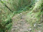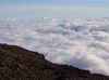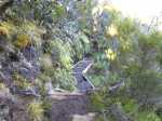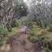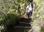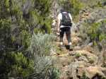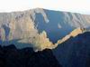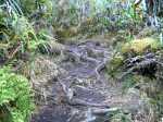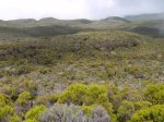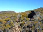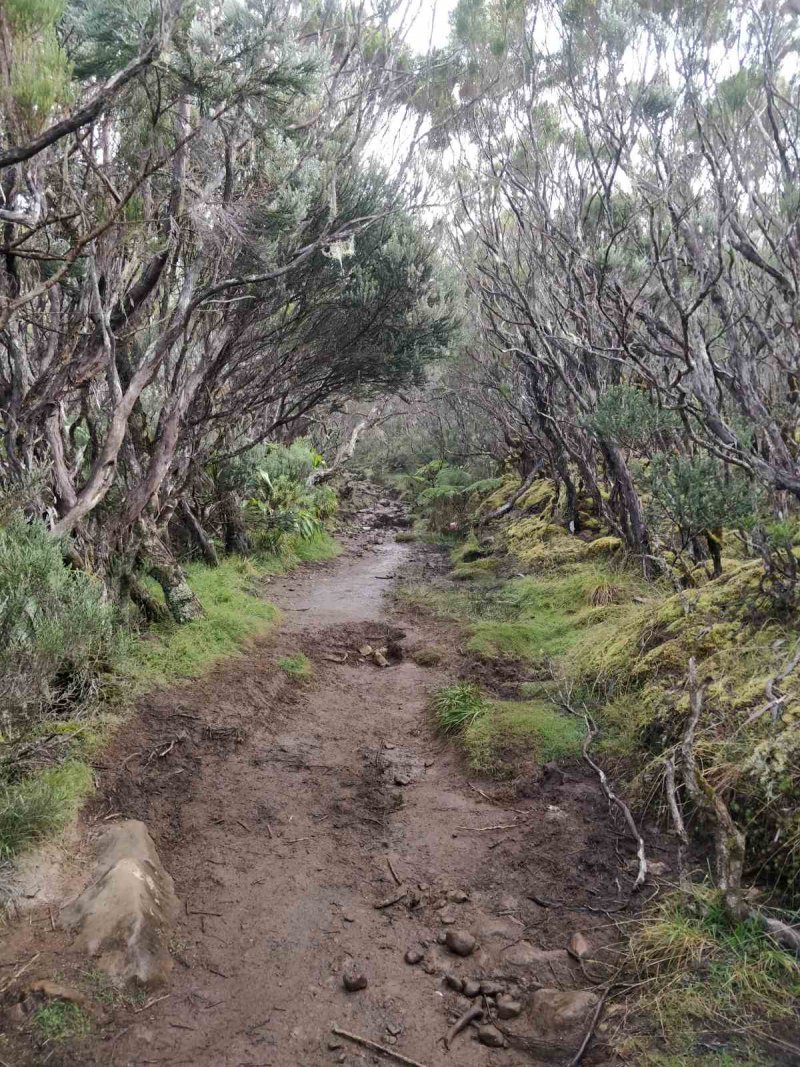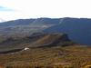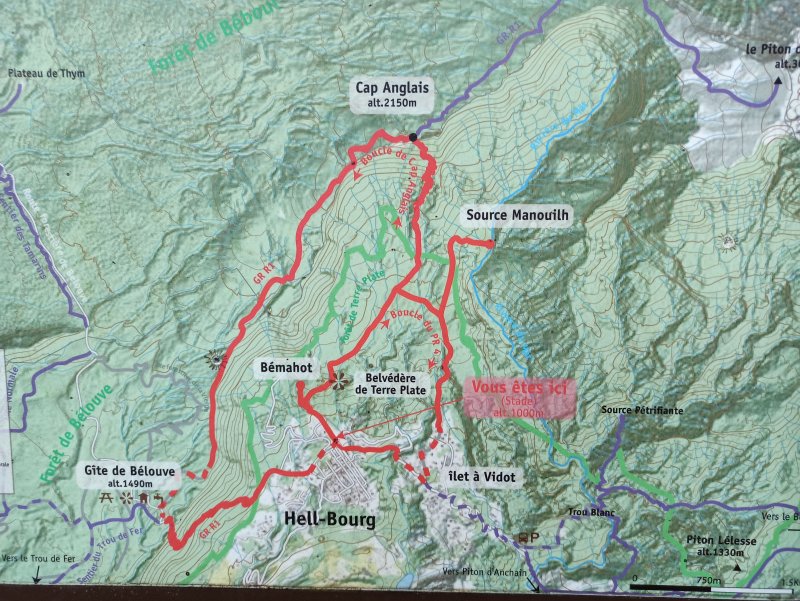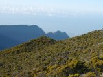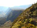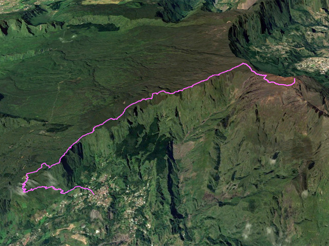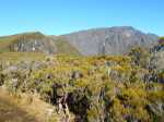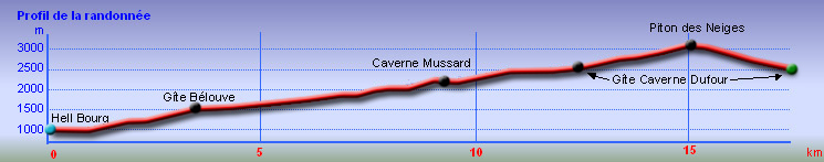 La randonnée débute à Hell Bourg, près de la mairie annexe et suit un chemin entre quelques cases (Photo 1), filaos et touffes de bambous avant de franchir une petite ravine, affluent du Bras des Demoiselles puis de traverser une aire de pique-nique sous les cryptomerias. Le sentier, le plus souvent bétonné, débute un peu plus loin et monte tout d'abord régulièrement dans les plantations domestiquées ou sauvages de chouchous. Il se poursuit sur des marches en pierre bordées de murettes pouvant comporter des câbles de maintien puis sur des cailloux (Photo 5) avant de grimper plus fortement sur des marches bétonnées pour rejoindre le Gîte de Bélouve. Certaines portions comportent des lacets courts et raides, d'autres sont plus agréables. Le sentier se termine à une rambarde en bois près du gîte. Ne pas quitter les lieux sans avoir rejoint le belvédère et jeté un regard vers Hell-Bourg laissé moins de 90 minutes avant. D'autres panoramas seront possibles au fur et à mesure de la montée après avoir franchi la forêt primaire. Plusieurs itinéraires, depuis le gîte, permettent de retrouver le sentier du Piton des Neiges mais la piste qui longe le rempart est plus courte et très agréable. Cette piste, bordée de bois de couleurs et fougères se termine à une installation comprenant une case technique, une grande antenne et un belvédère. On pénètre ensuite dans la belle zone boisée de forêt primaire très humide sur un sentier ou alternent racines (Photo 7), boue, terre, marches en pierres ou en bois. Quelques passages de ravines imposent de redescendre puis de remonter par de courts raidillons glissants. Des passerelles humides facilitent certains passages (Photo 8). Les points de vue sur le Cirque sont moins nombreux qu'on pourrait l'imaginer en voyant la carte (Photo 9). Plus loin, les bois de couleurs et les tamarins diminuent et le sentier, remis en état en 2016, continue ensuite dans les grandes bruyères couvertes de barbes de Jupiter en direction du Cap Anglais. Il faut à nouveau franchir des ravines mais les échelles et les innombrables marches sont plus agréables que la boue de la forêt primaire (Photo 10). On retrouve pourtant cette boue à plusieurs endroits plus plats que les autres. Les points de vue se font plus nombreux sur le cirque et la forêt de cryptomerias de Terre Plate. L'arrivée sur un plateau permet de voir le chemin restant à parcourir en direction du Gîte. Le Gros Morne est à peine caché par les arêtes pointues et blanchies du Cap Anglais (Photo 12). Quelques planchers de caillebotis ou nombreuses marches en bois amènent enfin à la croix de fer du Cap Anglais. Le sentier plonge sur la droite en direction de Terre Plate. Poursuivre vers le sommet en filant tout droit. La Caverne Mussard est très proche du sentier mais les graffitis et les blocs qui peuvent s'en détacher incitent peu à s'y reposer (Photo 15). Les marches salutaires du dernier kilomètre disparaissent et sont remplacées par des milliers de pierres de lave très désagréables car elles encombrent le plus souvent le milieu du sentier et obligent à regarder plus ses pieds (Photo 18) que les immenses panoramas vers la Fournaise et la Plaine des Cafres. La montée se fait moins rude, les cailloux s'espacent et on aperçoit de loin le Gîte de la Caverne Dufour qui sert de repère. Il faut, avant de le rejoindre, passer quelques ravines profondes mais sans difficulté particulière. Une fois le gîte atteint, en fonction de l'heure, choisir de monter au Piton des Neiges ou d'attendre le lendemain matin, très tôt.