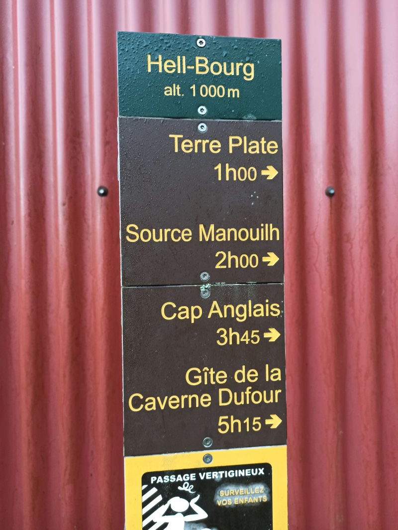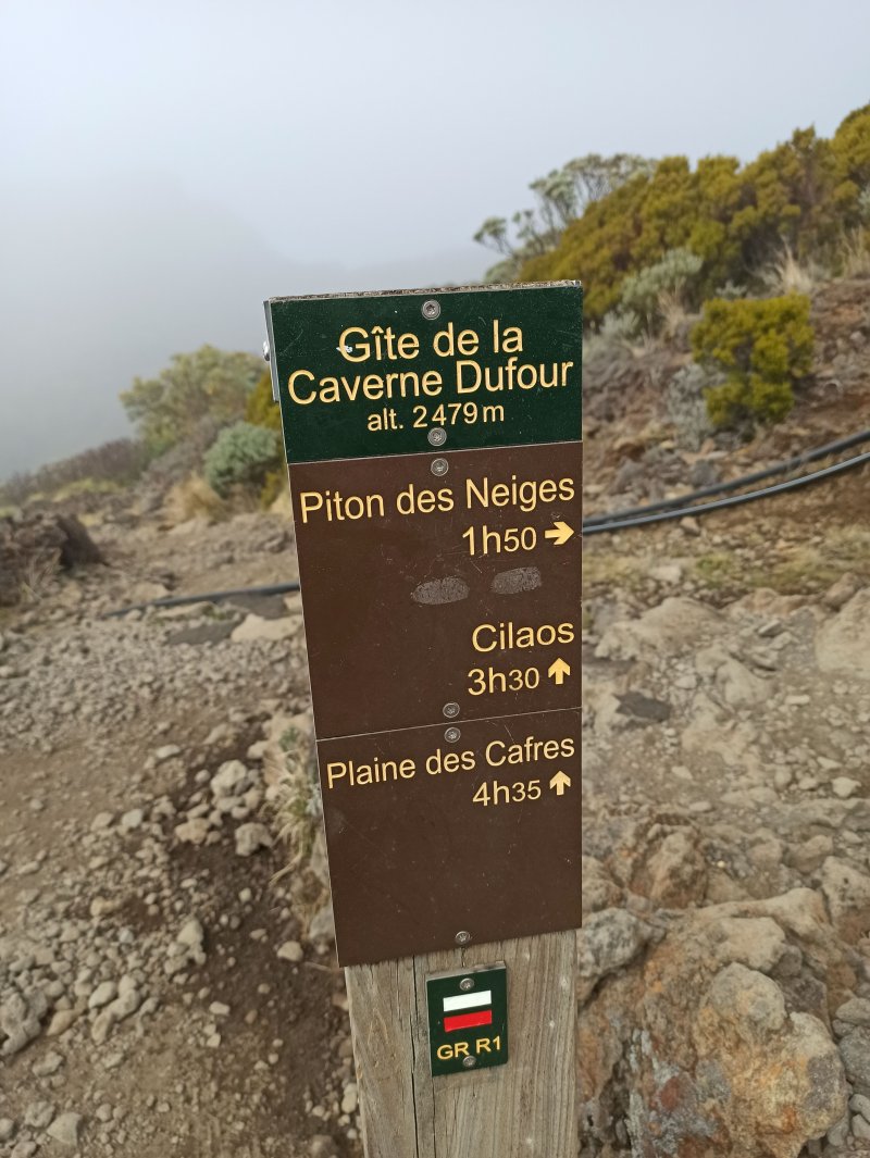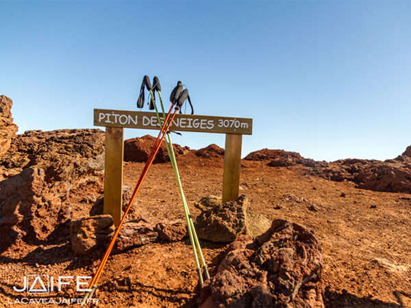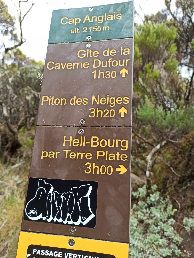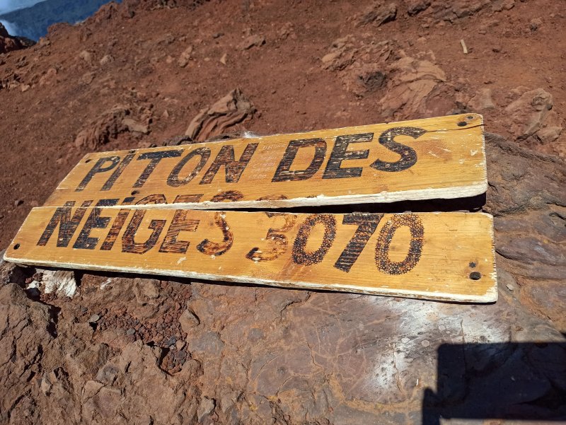 Quel plaisir d'immortaliser la fin de l'ascension au Piton des Neiges ! Une pancarte de bonne qualité a été installée fin septembre 2015 à deux pas du sommet. Elle ne tardera pas à faire le tour de la planète par des selfies ou photos de groupe postées sur blogs ou Facebook, apportant la preuve qu'on y était bien ce jour là. Merci à la caveajaife.fr et à l'ONF pour ce détail qui manquait et qui avait même été demandé par Alain et sans doute bien d'autres.