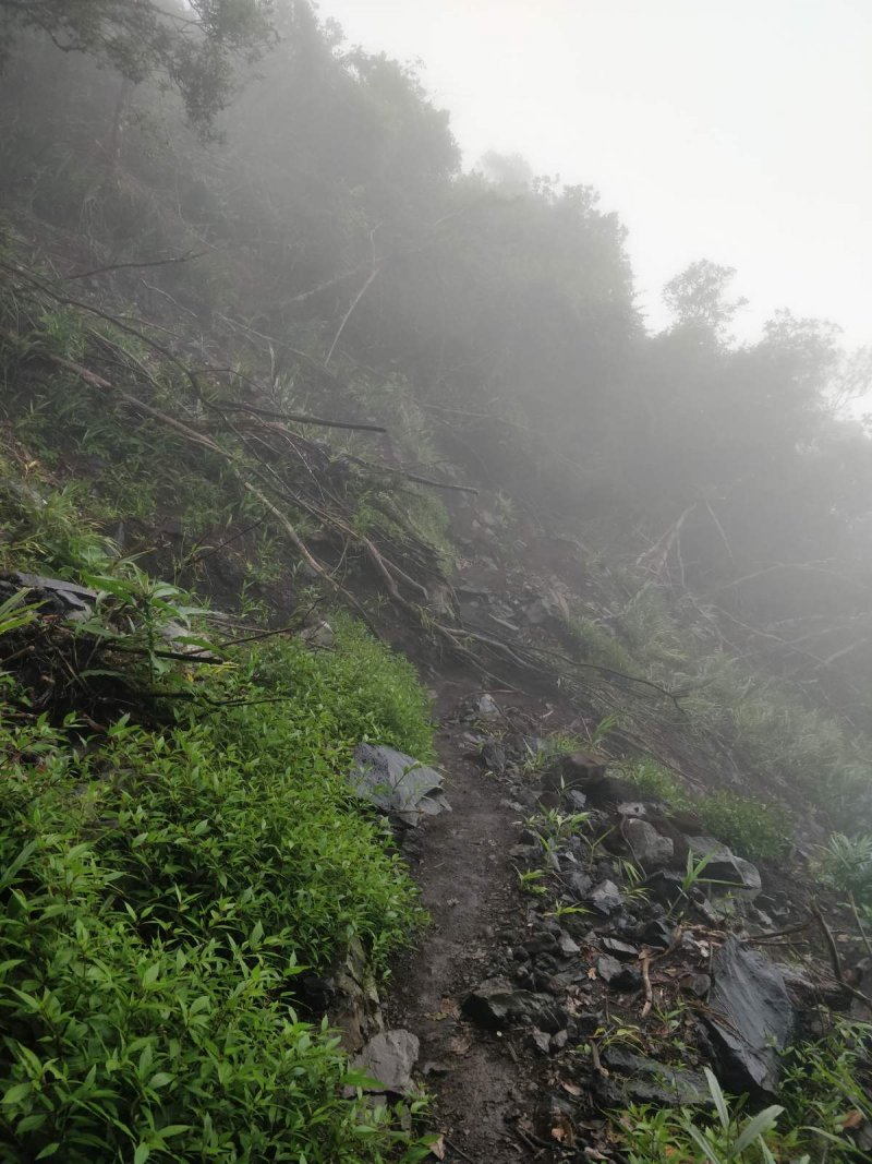 Le lendemain : Se munir de sa lampe frontale avant le départ pour mieux voir le chemin qui débute par l'escalade de nombreuses marches dans le lit d'une petite ravine bordée de toute part de traces de peinture blanche. Plus haut, le sol est très souvent caillouteux ou sableux, donc glissant. Il faut une bonne heure pour atteindre le sommet de l'Océan Indien d'où l'on bénéficie du meilleur point de vue de l'île avec des panoramas de 360° une fois que les rayons du soleil éclairent toutes les montagnes et les cirques.