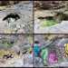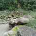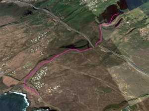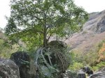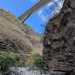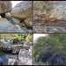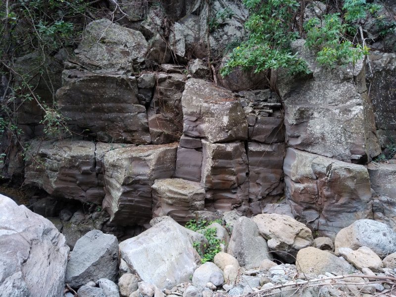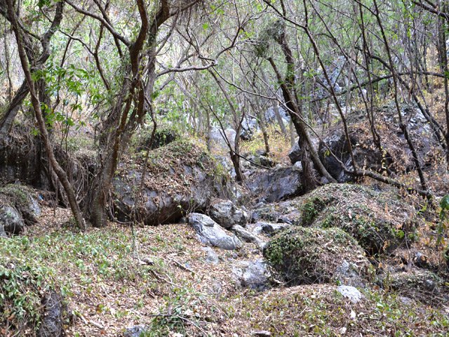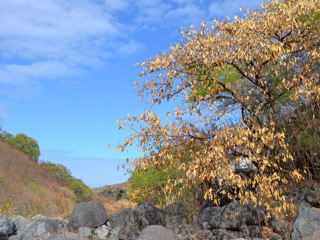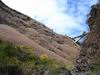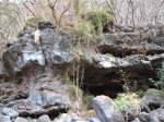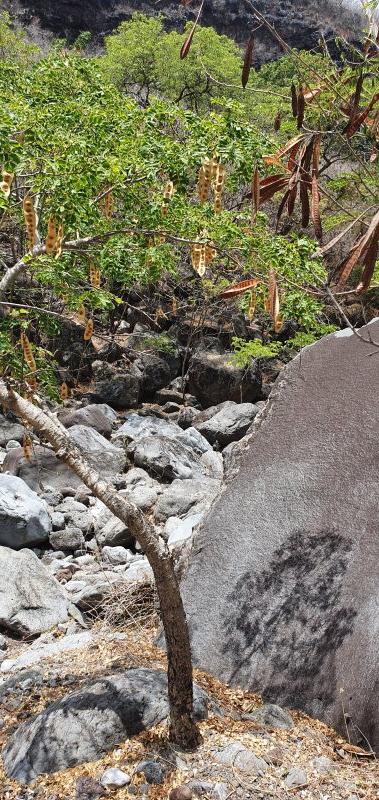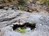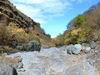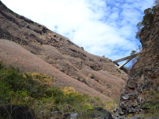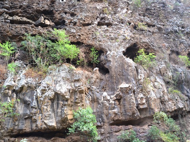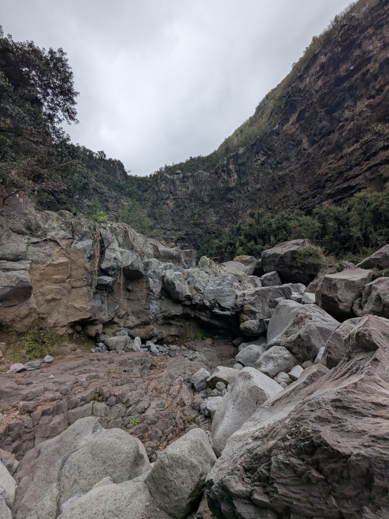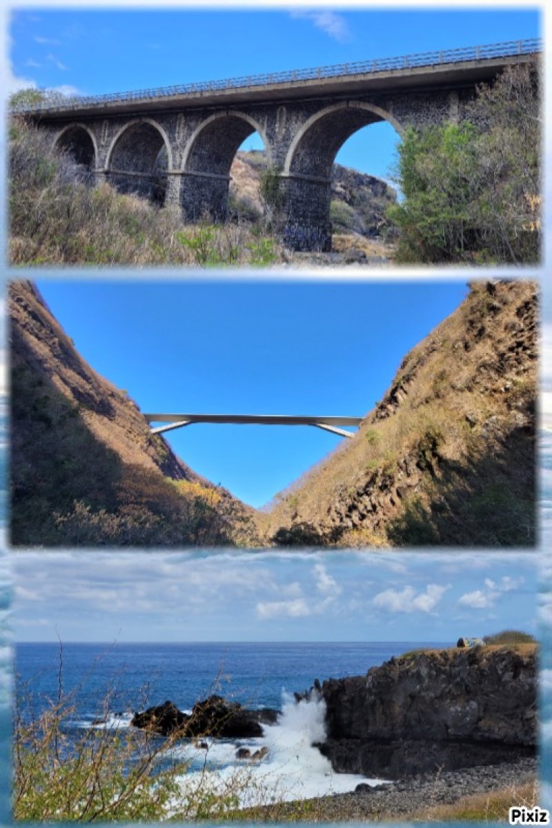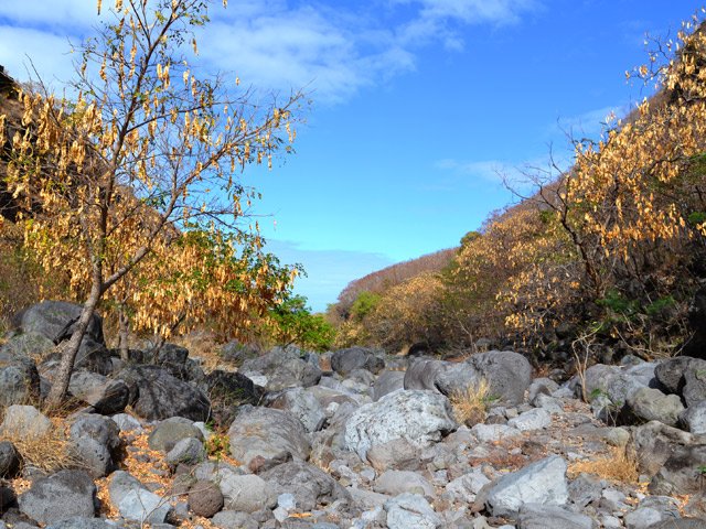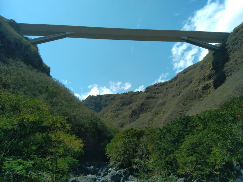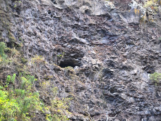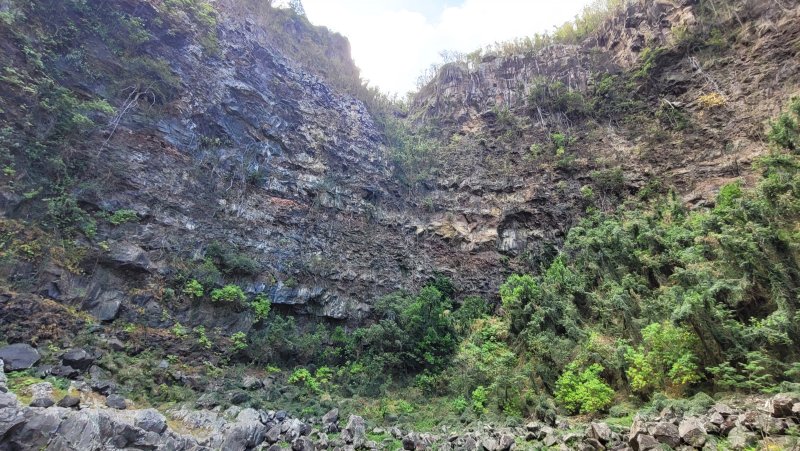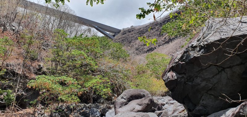 La randonnée débute au village de la Grande Ravine, sur l'ancienne route qui reliait Saint-Leu à la Saline. La jonction avec la ravine est rapide dans les herbes et épineux sur une trace qui diminue en largeur d'année en année. On remarque très vite les piles du pont emportées par un cyclone en aval du pont actuel ainsi que les vestiges de l'ancienne route sur la falaise en face. La portion la plus désagréable, d'une cinquantaine de mètres en amont du vieux pont, est recouverte de tous les cadavres de poules, canards ou pintades de la basse-cour située au dessus. Sans doute, une fois mortes de maladie, finissent-elles dans le fond de la ravine, jetées là par l'habitant des lieux, espérant peut-être les revoir voler avant d'atteindre le fond ! Le pont actuel, en pierres de taille, est encore en très bon état (Photo 1). Il est possible de s'approcher de l'estuaire et des rochers entourant la Passe des Trois Bassins (Photo 2). Le cheminement, de rocher en rocher, peut débuter entre les remparts pour le moment en pente douce (Photo 3). Les acacias noirs ont envahi toutes les rives et même le fond de la ravine quand ils trouvent de quoi implanter les racines (Photo 4). Certains ont atteint des tailles imposantes, sans doute bien implantés ou assez loin des rares crues de la région (Photo 5). Le fond est en général recouvert de gros rochers ou galets usés par l'érosion mais on rencontre également des fonds basaltiques trop plats pour que les roches y demeurent (Photo 6). La pente est faible, les rochers toujours présents mais le cheminement s'effectue régulièrement jusqu'à l'approche du pont de la Route des Tamarins (Photo 7). Plus on monte et plus la vallée se rétrécit au moment ou la route l'enjambe (Photo 8). On parvient à l'aplomb de ce très long pont, une œuvre d'art architectural en une seule arche (Photo 9). Long de 188 m, cet ouvrage exceptionnel domine les rochers du fond de 170 m. Lorsqu'on roule sur cette voie rapide, on peut regarder vers l'amont de la ravine et apercevoir ces falaises recouvertes d'épineux qui deviennent de plus en plus verticales (Photo 10). La pente s'intensifie mais sans plus. Les roches sont de plus en plus grosses. On rencontre ça et là dans la falaise de grosses cavités ou grottes naturelles créées par l'érosion des couches tendres de gratons issus des éruptions. (Photo 12). Plus impressionnant, cette cavité issue de l'effondrement de la voute d'un tunnel de lave dans laquelle s'écoule l'eau lorsque la ravine coule (Photo 13). Cette eau est d'ailleurs très rare dans cette région de l'Ouest. On y rencontre quelques flaques envahies de lentilles d'eau où des têtards se dépêchent à muer avant qu'elles ne soient totalement asséchées (Photo 14). Le tangue rencontré ce jour là semble souffrir du manque de nourriture et de boisson (Photo 15). Certaines cavités plus hautes dans la falaise sont laissées aux alpinistes et aux pigeons qui aiment bien venir y nicher et roucoulent à l'arrivée du marcheur (Photo 16). Les escalades deviennent de plus en plus fréquentes mais sans danger (Photo 17). Il faut constamment chercher entre les blocs le passage qui imposera le moins d'effort. Le plus gros inconvénient est la chaleur du basalte si on est parti tard. Certains tunnels sont assez hauts pour qu'on puisse y pénétrer (Photo 18. Une grotte en rive droite est si importante qu'on pourrait y bivouaquer à plusieurs (Photo 20. Mais qui aurait l'idée de venir camper pour une nuit en ces lieux désertiques ? Les cassés et bassins sont rares mais tous franchissables après avoir repéré des yeux le meilleur passage (Photo 21. Plus loin, la ravine se rétrécit jusqu'à devenir un canyon sur une courte distance (Photo 22). Preuve que les cyclones sont rares : on traverse une zone où les lianes griffes de chat (dolichandra unguis cati) ont réussi à coloniser les rochers (Photo 23). Ne pas manquer le bel affouche dont les racines ont pris possession des rochers qui l'abritent (Photo 24). Un dernier bassin bordé de basalte se passe en rive droite sans hésitation (Photo 25). 90 minutes après le premier pont, on parvient au pied d'une haute muraille infranchissable (Photo 26). On remarque une superbe fin de tunnel, sur les flancs de la falaise près des traces de la cascade, que nous laisserons aux alpinistes encordés qui viendront par le haut (Photo 27). Pour admirer la haute chute en eau ainsi que le bassin, il faut privilégier le lendemain d'une journée pluvieuse (Photo 28). Mais il faut faire vite car l'eau s'infiltre dans ces multiples tunnels et la ravine revient vite à sa sécheresse habituelle. Le retour s'effectue par le même itinéraire.
