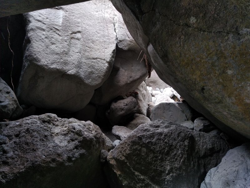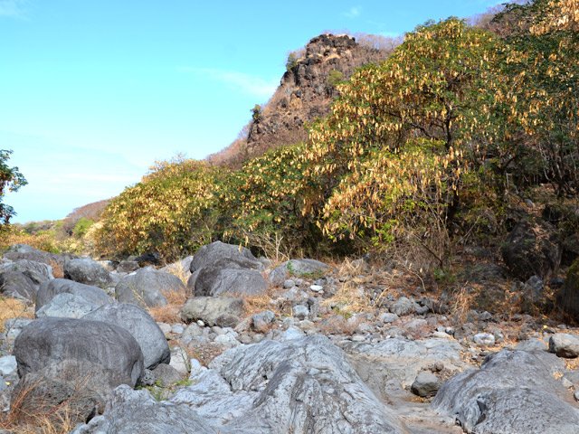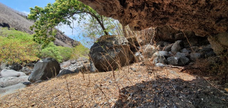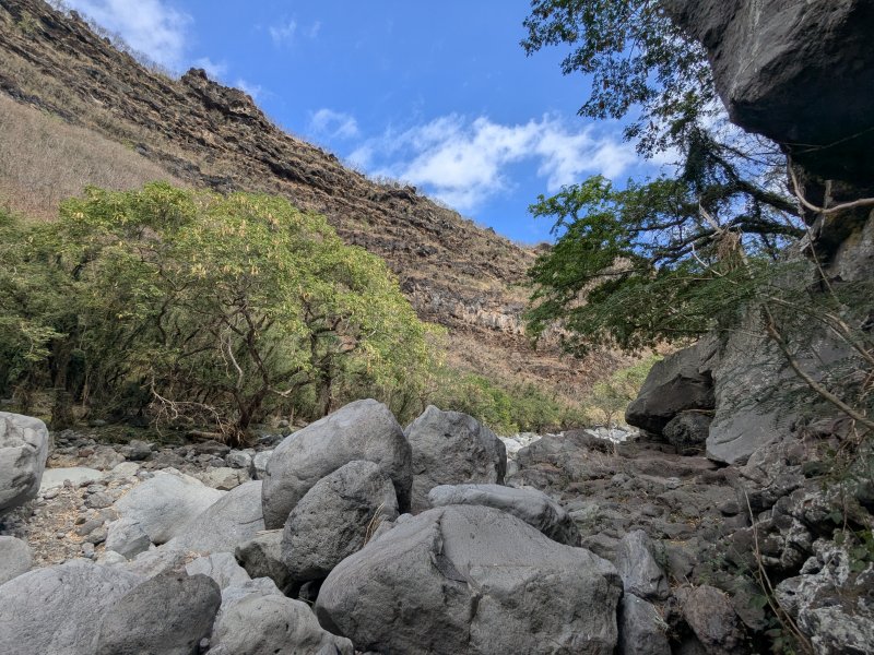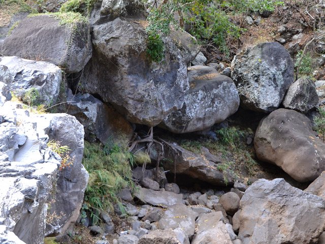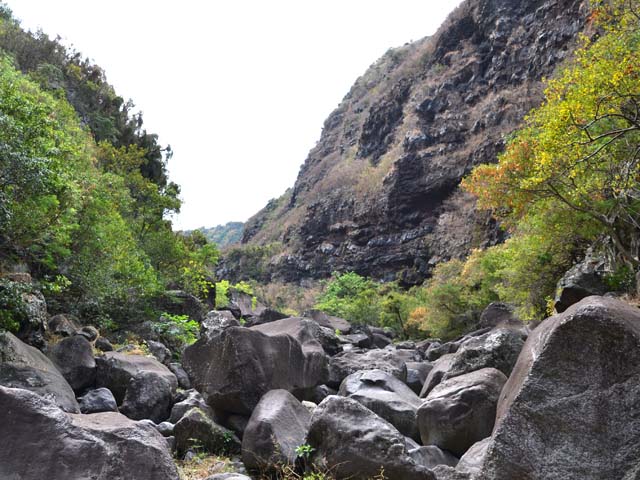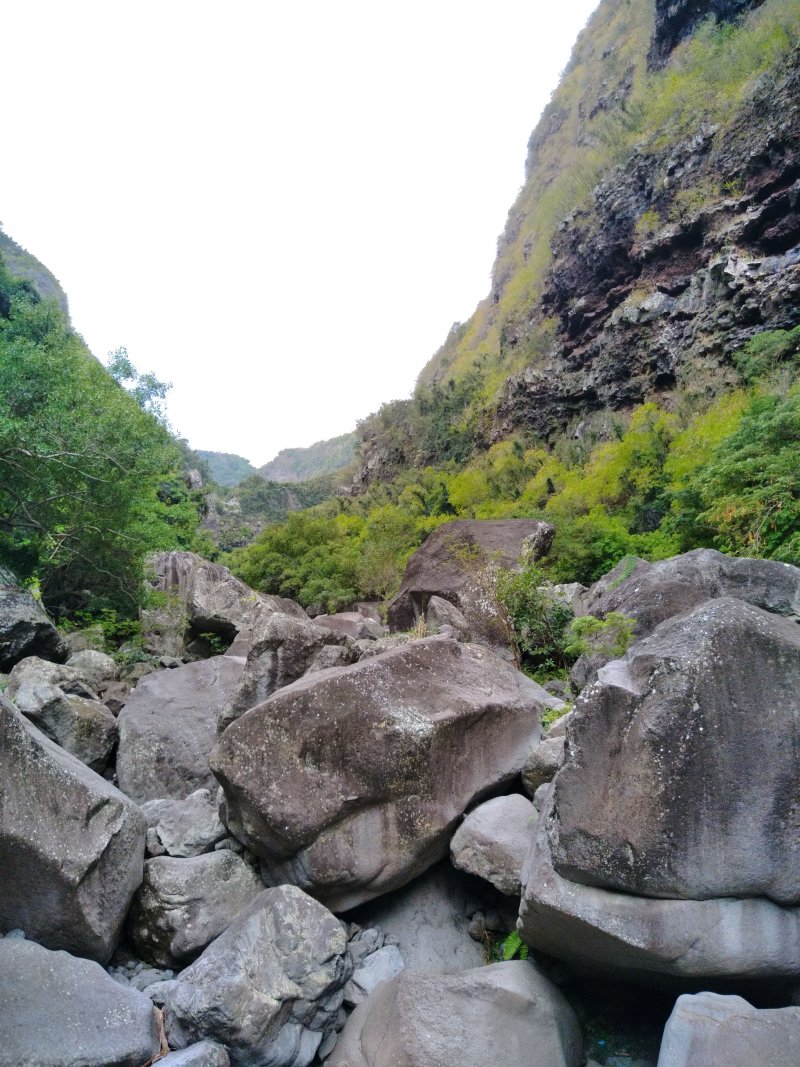 Bien connue des gardiens de chèvres, la vallée de la Grande Ravine peut se visiter en trois parties : cette sortie qui va de la mer à la première cascade, une autre située entre Trois Bassins et la deuxième cascade et enfin une troisième empruntant le même point de départ mais pour marcher entre les deux chutes supérieures. La sortie est très courte mais assez sportive en raison de la constitution du sol. Contrairement à d'autres vallées encaissées présentées sur ce site, celle-ci ne comporte presque pas de galets mais d'énormes rochers qui vont de 1 à 10 mètres de haut ou de large. Paradoxalement, le cheminement est aisé car on peut ainsi sauter de rocher en rocher sans fournir de très gros efforts. Il faut parfois escalader sur plus d'un mètre des roches volumineuses ou passer dessous dans des tunnels naturels créés par leur amoncellement. Pas une goute d'eau dans le fond de la ravine ne permet de se rafraîchir de la chaleur créée par les rochers surchauffés au soleil. Le plus intéressant de la sortie est son côté géologique. On rencontre des falaises abruptes, percées de tunnels de lave inaccessibles, des grottes, des effondrements ayant imposé à la rivière de filer sous terre et un superbe tunnel de lave de plus de 2 m de hauteur. Cette randonnée, qui n'en est pas une, ne peut intéresser que les amateurs de solitude, les géologues ou les sportifs aimant sauter de roche en roche. La descente est aussi ludique que la montée est pénible car on descend plus facilement les marches de 1 mètre de haut. Il n'y a pas de danger à proprement parler mais il faut tout de même se méfier de la chute si les roches sont glissantes, ce qui doit être rare dans cette région de l'île.