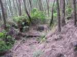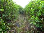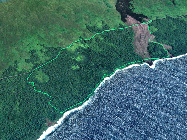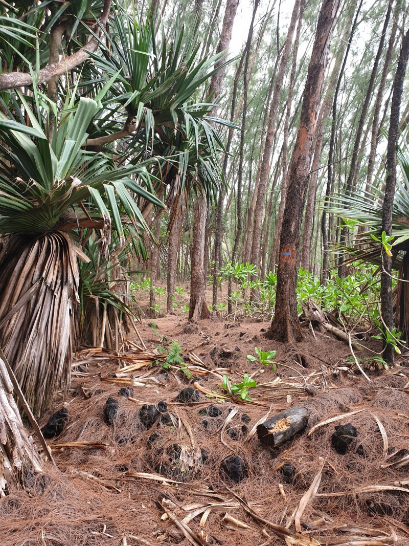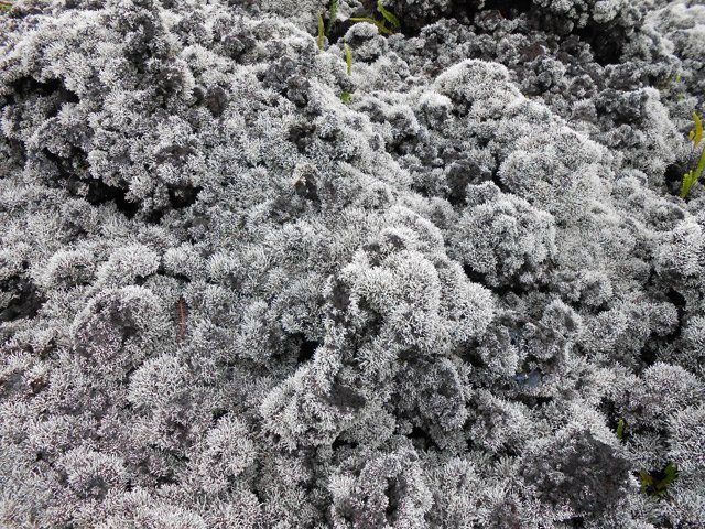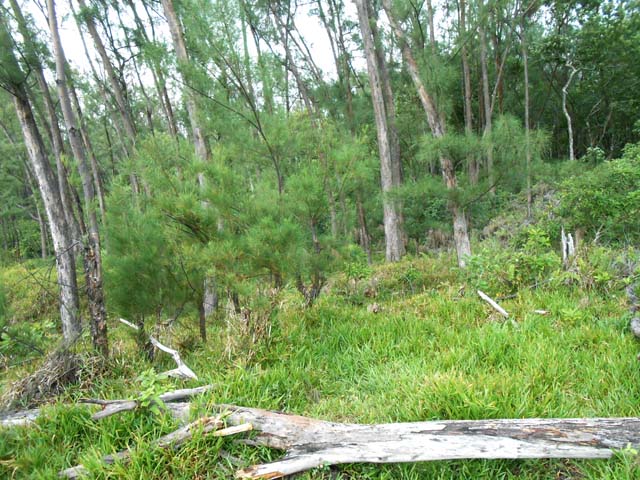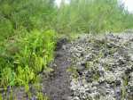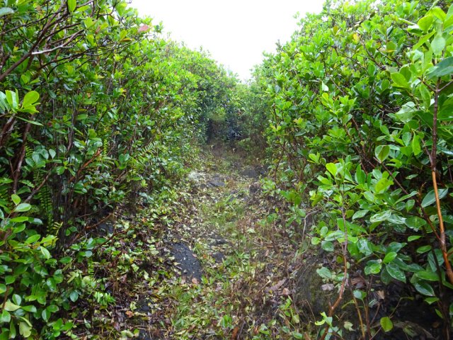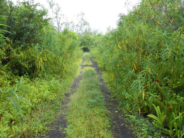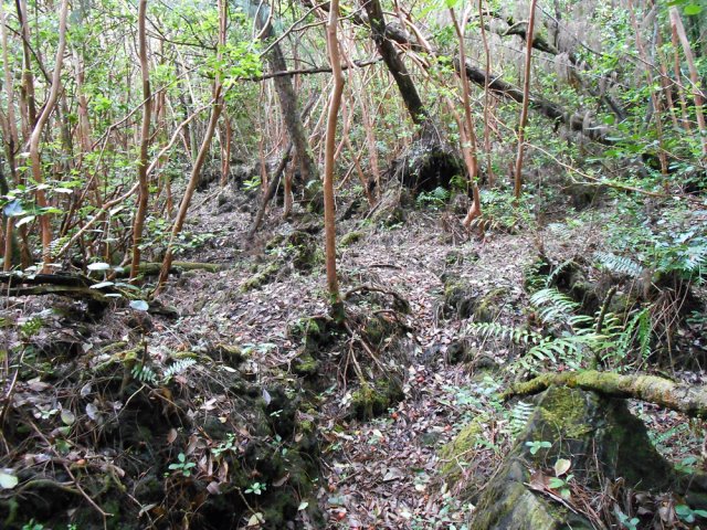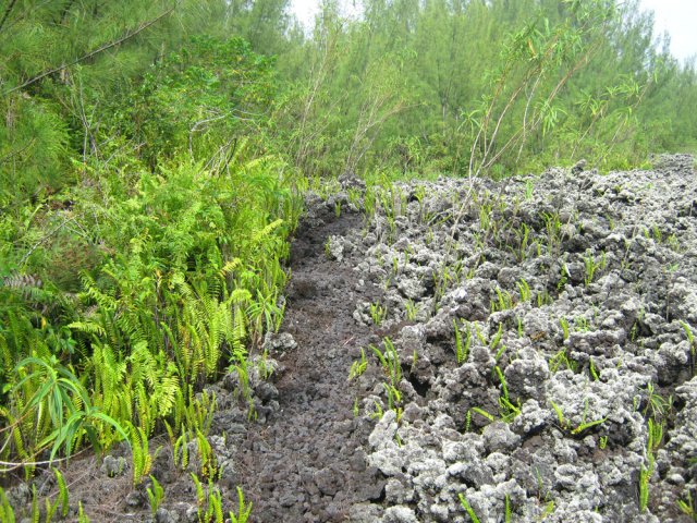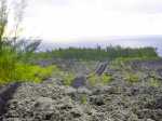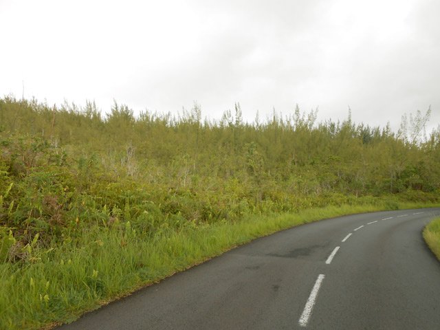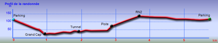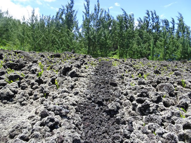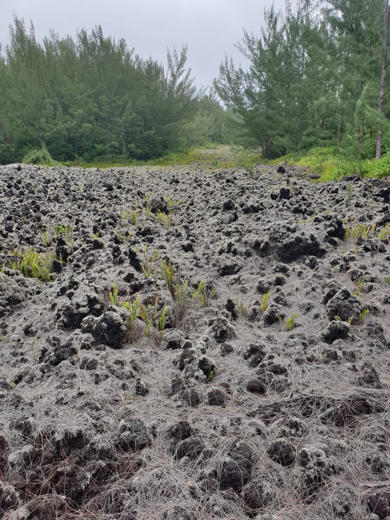 La randonnée débute à la coulée de 2002 qui s'est mêlée à celle de 2001 avant de filer vers l'océan. Un reliquat de piste tient lieu de parking. Repérer, dans les gratons de la coulée, le départ du sentier qui rejoindra le littoral rapidement. Le matin, tous les nuages ne sont pas encore dissipés (Photo 1). A l'arrière, les grandes pentes profitent des premiers rayons (Photo 2). On débute immédiatement sur un sentier étroit créé par l'élimination des mousses et lichens par les marcheurs sur les gros gratons en direction de la mer (Photo 3). Ce sont surtout les pêcheurs qui tentent ces descentes plus que les randonneurs. C'est dommage car il y a toujours de l'intérêt de marcher sur ces coulées récentes, ne serait-ce que pour y voir reprendre la vie végétale (Photo 4). Attention de ne pas marcher hors de ce sentier car les gratons qui le bordent sont fragiles, autant que ces lichens gris endémiques qui disparaissent une fois piétinés (Photo 5). Le sentier longe la partie végétale épargnée par les coulées. La descente est facile même s'il faut toujours se méfier du cheminement sur ce type de sol qui est très coupant en cas de chute. On devine bientôt la piste beaucoup plus large traversant la coulée (Photo 6). Le sentier devient effectivement beaucoup plus large et l'on peut marcher à plusieurs de front (Photo 7). La vie s'installe plus ou moins rapidement sur ces coulées. Après le lichen, ce sont les fougères qui précèdent les premiers bois de chapelet et bois de rempart. Viennent ensuite les filaos qui verdissent en quelques années les abords du littoral (Photo 8). Une bifurcation discrète indique que les pêcheurs partent dans deux directions pour contourner le prochain bois de filaos. Prendre à gauche pour rallonger un peu la boucle et rejoindre le Grand Cap. Le sentier se termine au Sentier des Laves que l'on emprunte en continuant sur la droite. Il n'est pas toujours facile de rejoindre l'océan dont les fortes vagues écrasent le bas des falaises (Photo 9). Rechercher pour cela des sentes de pêcheurs. L'endroit est prisé comme le montrent hélas les résidus de longs stationnements ! Un bois de filaos suivi d'une zone de goyaviers se traverse assez facilement (Photo 11). Après les goyaviers, on rencontre la deuxième partie de la coulée qu'on a abandonnée récemment pour partir à gauche. Sa traversée est courte et rapide sur un sentier tout aussi bien marqué que les précédents (Photo 12). Puis reviennent les filaos qu'on traverse assez près de l'océan en bénéficiant de quelques panoramas sur l'horizon ou sur les coulées de 2007. La végétation change souvent, passant des goyaviers à quelques pandanus pour ensuite traverser des bois de filaos en marchant sur les aiguilles (Photo 13). Sur le côté du sentier, difficile de traverser en raison de la végétation inextricable parmi laquelle on devine parfois un pied de vanille sauvage ou des racines de pandanus (Photo 14). Mais ce sont surtout les goyaviers qui dominent tout au long du Sentier des Laves. A la saison des fruits, les arrêts permettent de se reposer et de se gorger de sucre et de vitamine C. Un petit écart est nécessaire pour éviter une ravine totalement envahie de ces plantes mais le sentier reste facile à suivre avant de partir sur la gauche en direction de la mer. Le sentier comporte quelques courtes montées ou descentes sans difficulté (Photo 15). Le sol est recouvert de coulées de lave ancienne mais les goyaviers ont réussi à y grandir normalement (Photo 16). Une bonne partie de la marche s'effectue à plat en prenant juste garde à une pierre pouvant dépasser ça et là (Photo 17). Plus loin, les coulées sont si denses qu'on croirait marcher sur du béton ; on se demande comment les racines réussissent à trouver leur pitance (Photo 18). Cette partie bordée de ces milliers de goyaviers a vite fait de devenir très étroite sans entretien (Photo 19). Ne pas manquer, à mi-parcours l'effondrement d'un tunnel de lave qui a créé de belles grottes ou cavernes plus ou moins profondes ou dangereuses (Photo 20). Repérer, à quelques mètres, la sortie improvisée du tunnel et prendre garde de ne pas y chuter (Photo 21). En suivant scrupuleusement le sentier entre les goyaviers, il y a peu de chances de chuter dans ces tunnels mais on remarque un peu partout des effondrements, signe que l'endroit en est truffé (Photo 22). On s'approche une dernière fois de l'océan sans marcher sur le bord de la falaise puis le sentier oblique sur la droite et remonte la pente en direction de la RN2. On atteint une vieille piste à un emplacement pour faire demi-tour avec un véhicule. Le Sentier des Laves se poursuit sur la gauche en direction de la coulée de 2007. La piste est si envahie qu'on peut imaginer se retrouver bientôt bloqué (Photo 23). Pourtant, très vite, on peut marcher sans inquiétude sur une pente très faible (Photo 24). Certaines parties, anciennement bétonnées sur les portions pentues ou dans les virages, résistent mieux à l'envahissement (Photo 25). Après quelques virages sur cette pente douce, on parvient à la route des Laves. Partir sur la droite et prendre garde à la circulation, heureusement faible en ce lieu reculé (Photo 27). On effectue très rapidement et à plat ce tronçon goudronné pour retrouver le véhicule en début de sentier.